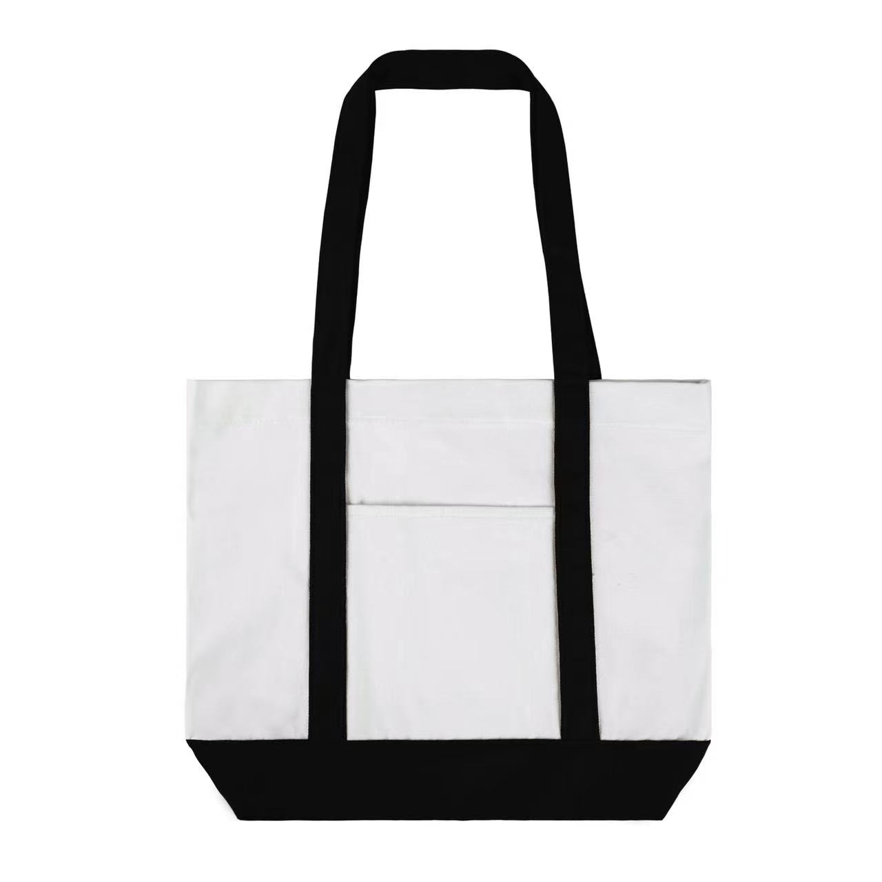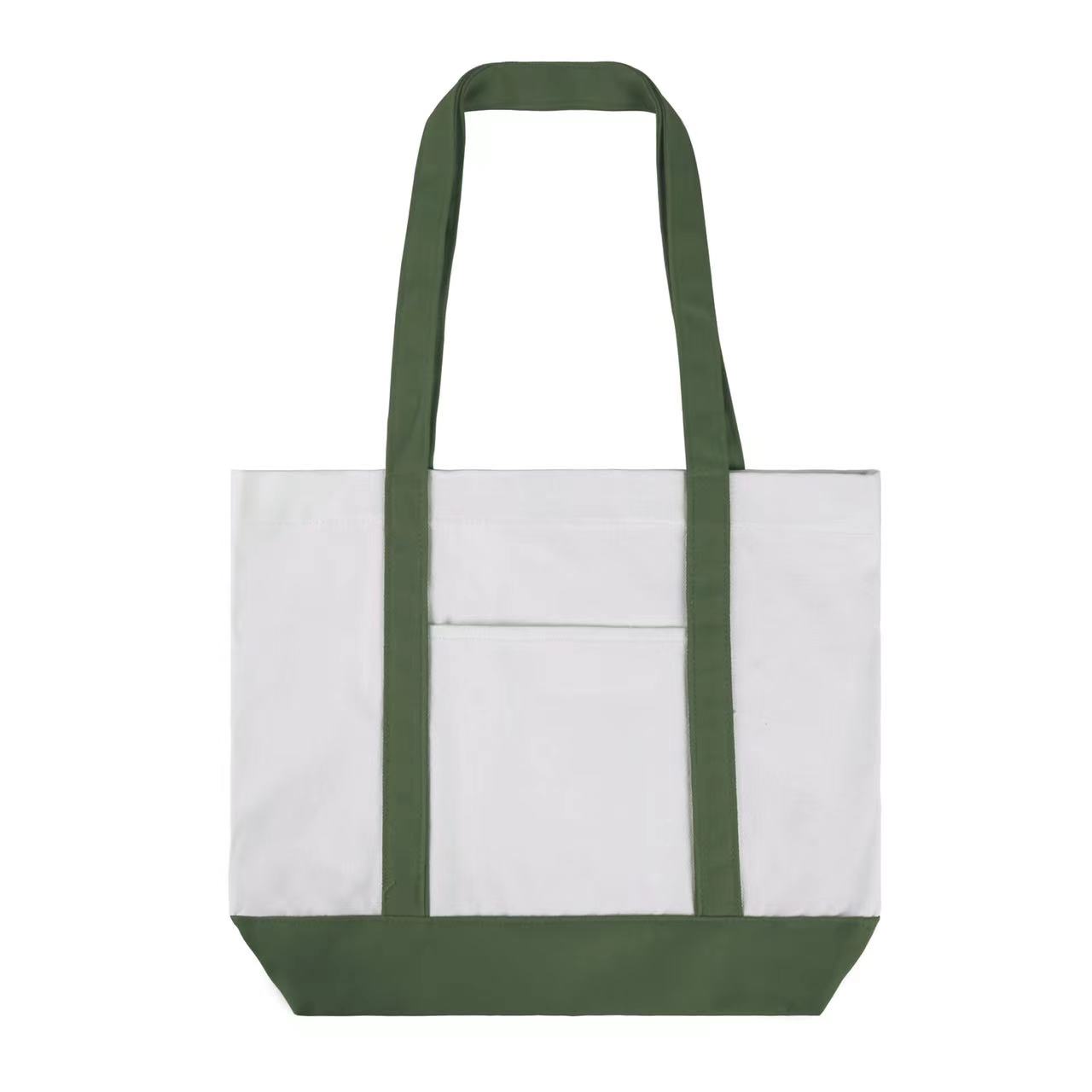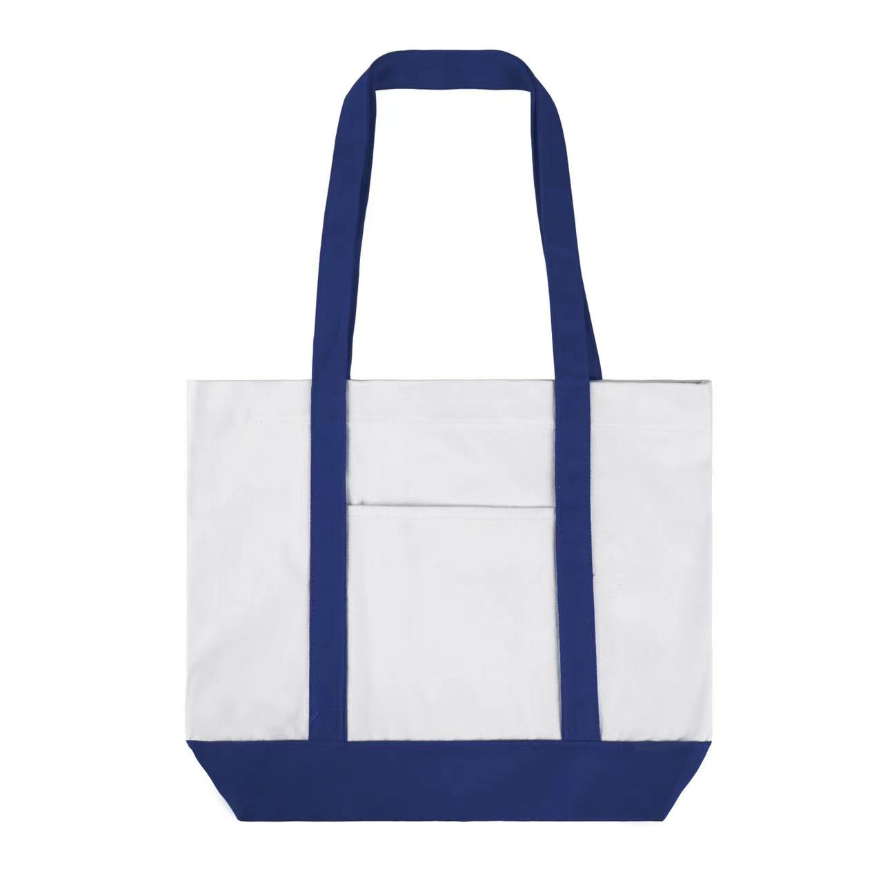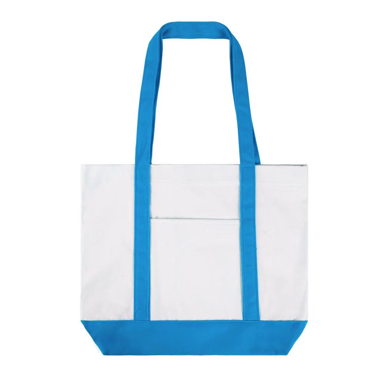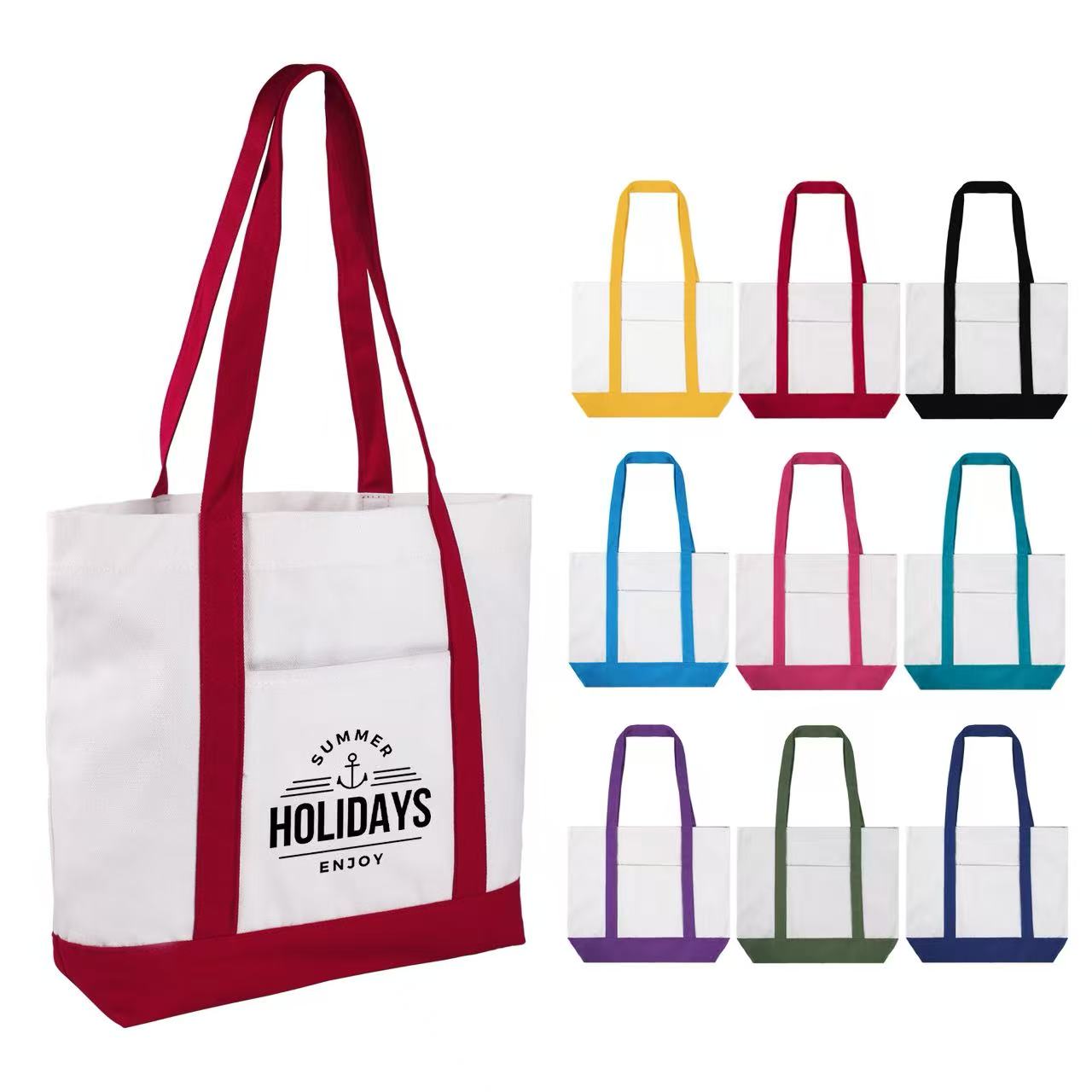 Item# RA1135 – This classical boat bag (16.5′ ‘x 13” x 4”) is made of 12 oz poly cotton and has a sizeable front pocket. Its durable material and large capacity make it suitable for many occasions,with a colorful handle and matching bottom panel and can be easily folded flat when not in use. This type of bag is great for people who commute or travel, go on retreats, shopping excursions, picnics, the beach, or anywhere else where personal items need to be ported. Get a free quote now!