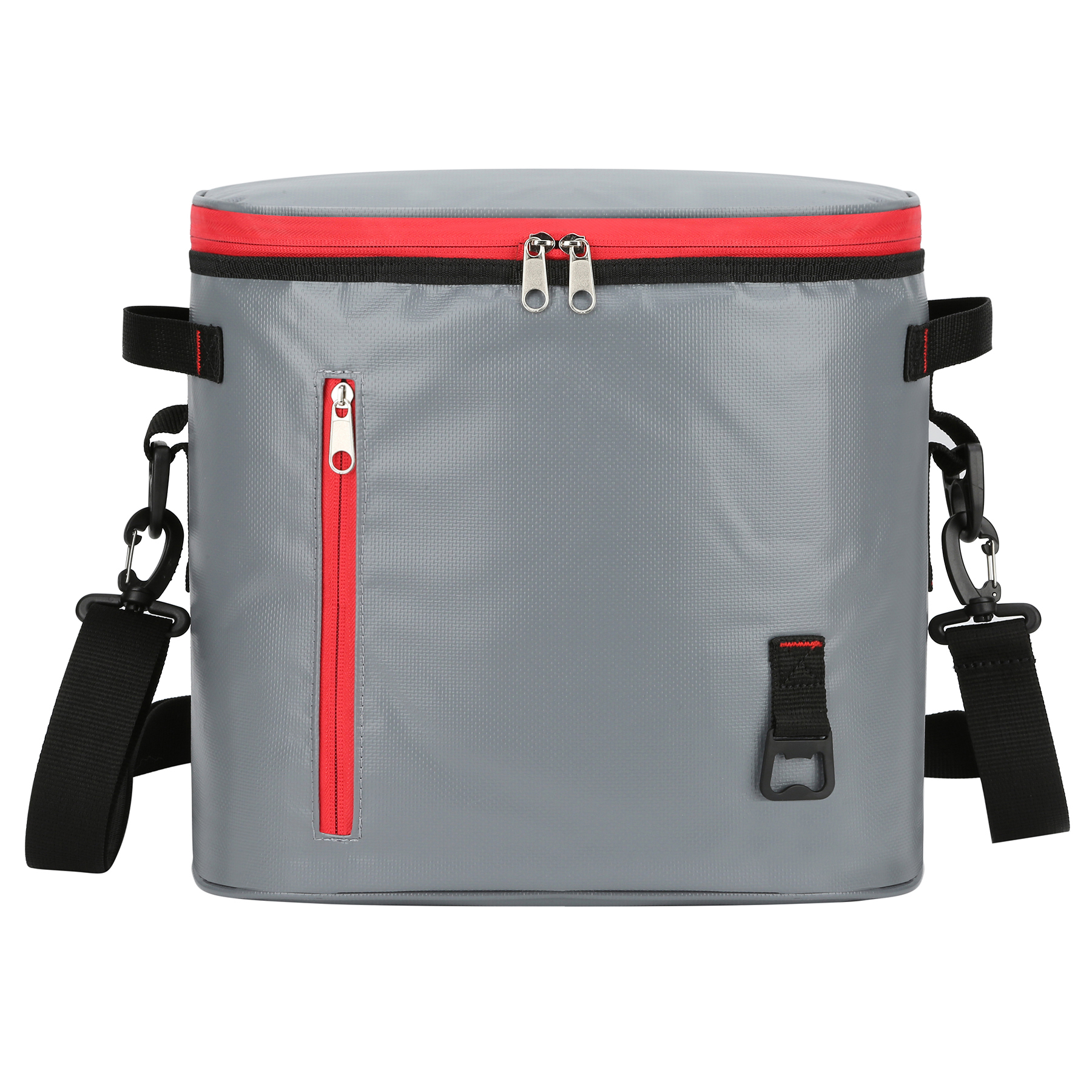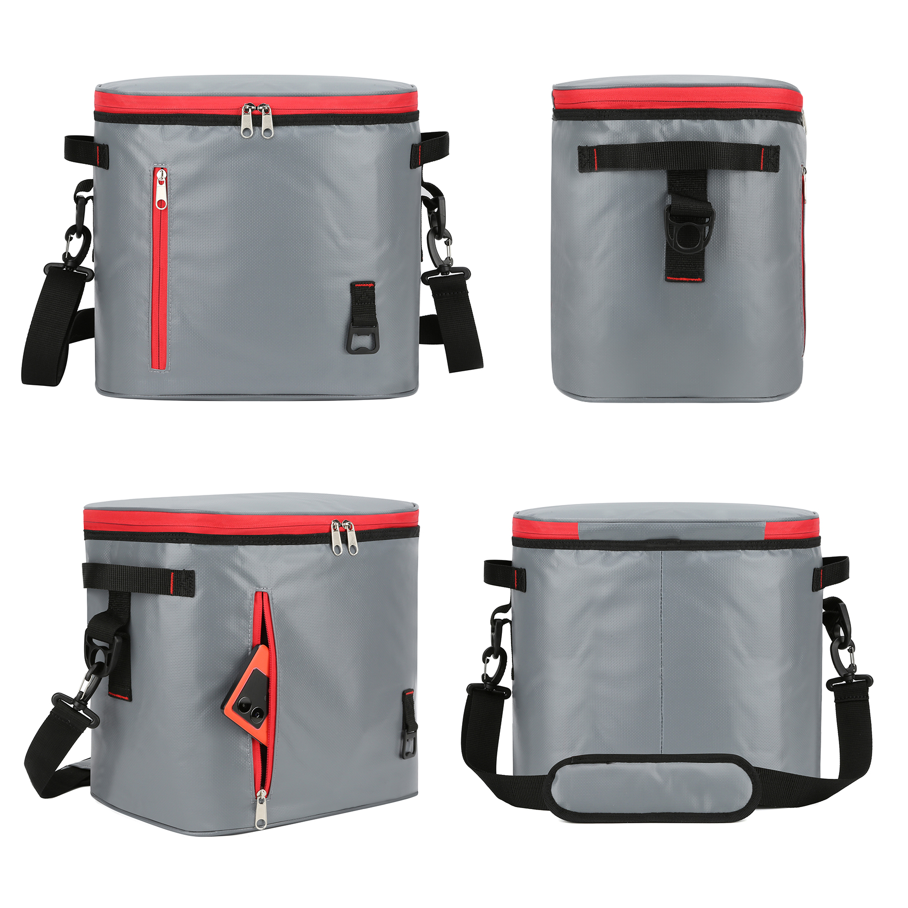 Item# R 692 –  This cooler bag features a thickened insulating layer that offers excellent thermal retention and effectively locks in temperature. Keeping cold time can reach more than 12 hours when used with ice! The interior is lined with a hot-pressed, leak-proof PEVA material, while the exterior is made of durable, weather-resistant 40C tarpaulin, making it safe to carry even on rainy days. The bag includes a zippered main compartment capable of holding up to 24 cans, a front zippered pocket for extra capacity, and two side carry handles for easy transportation. Spacious zippered main compartment opens wide for effortless packing. Equipped with an adjustable shoulder strap featuring a comfort pad and a built-in zinc alloy bottle opener, it is perfect for beach trips, picnics, hiking, and other outdoor activities.  Get a free quote now.