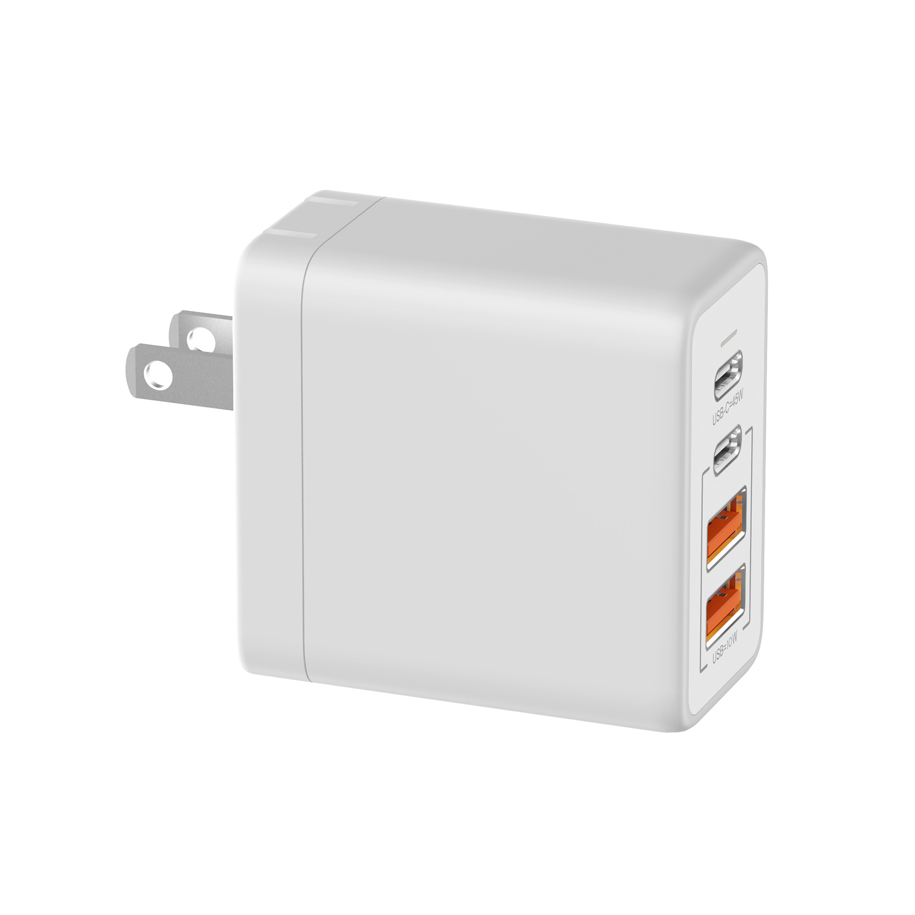 Item# RE1038 –  Keep your devices powered and your brand in focus with our 45W 4-Port Fast Charging Wall Charger. Equipped with two USB-C and two USB-A ports, it delivers up to 45W from a single USB-C port to quickly charge lightweight laptops, or 10W from USB-A ports for phones, tablets, and accessories. Its intelligent design distributes power efficiently to charge up to four devices at once from a single outlet. Built for convenience with a foldable travel-friendly plug and premium safety certifications, this compact charger is both reliable and versatile. The smooth surface provides generous space for your full-color logo, making it the perfect corporate gift to energize your brand and leave a lasting impression. Get a free quote now!