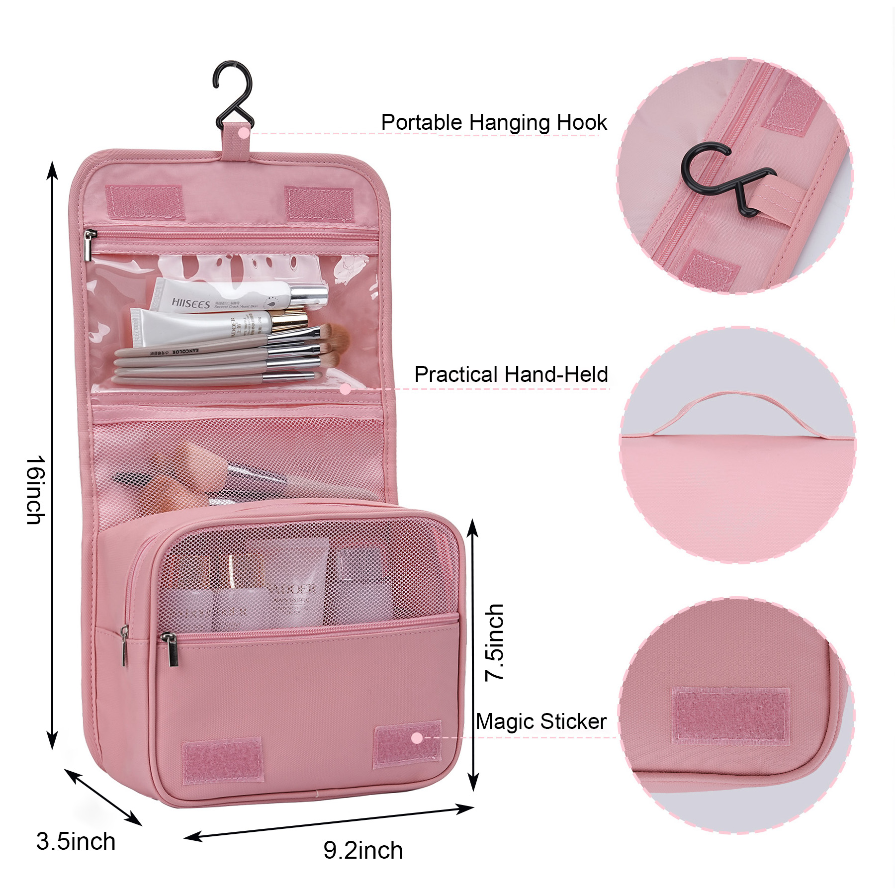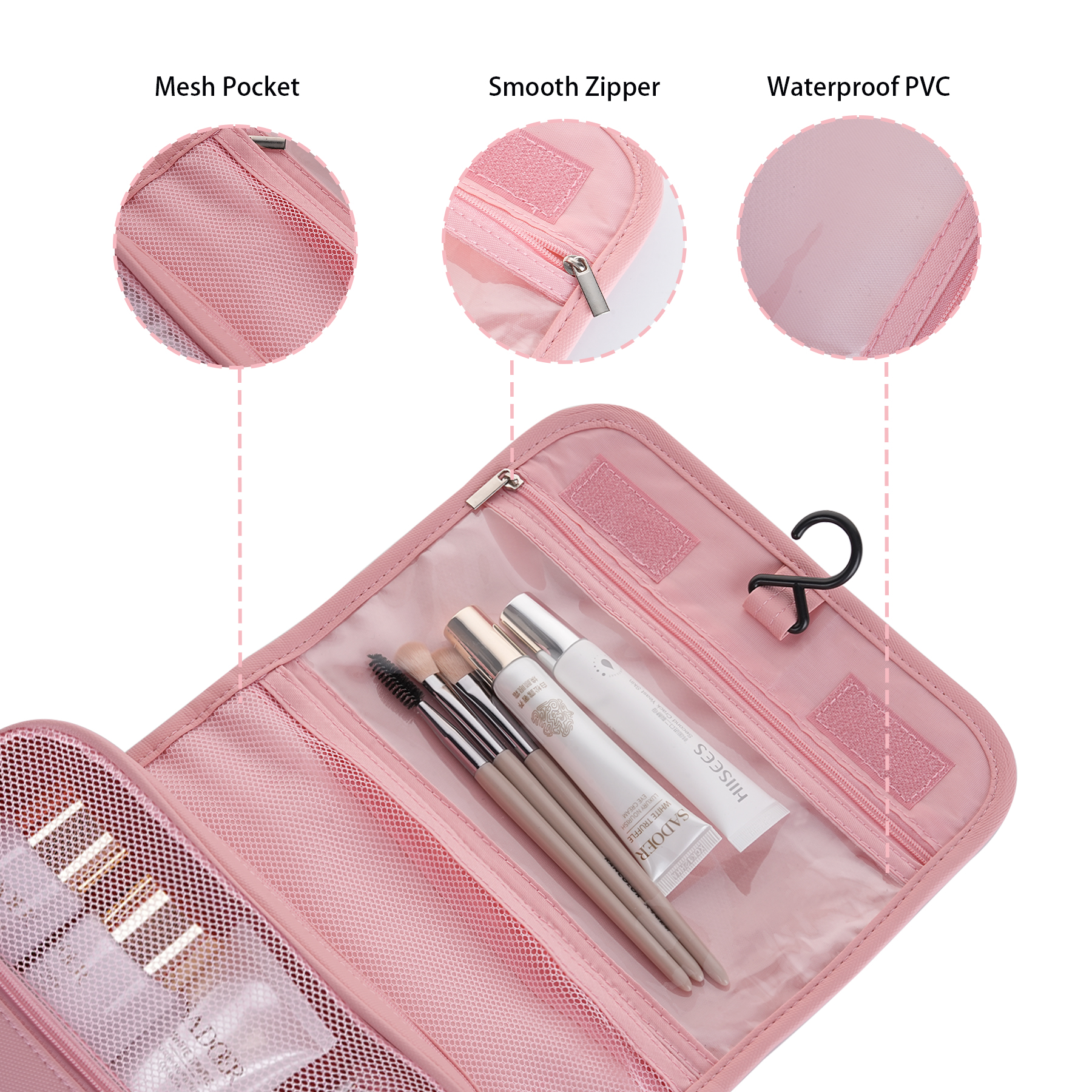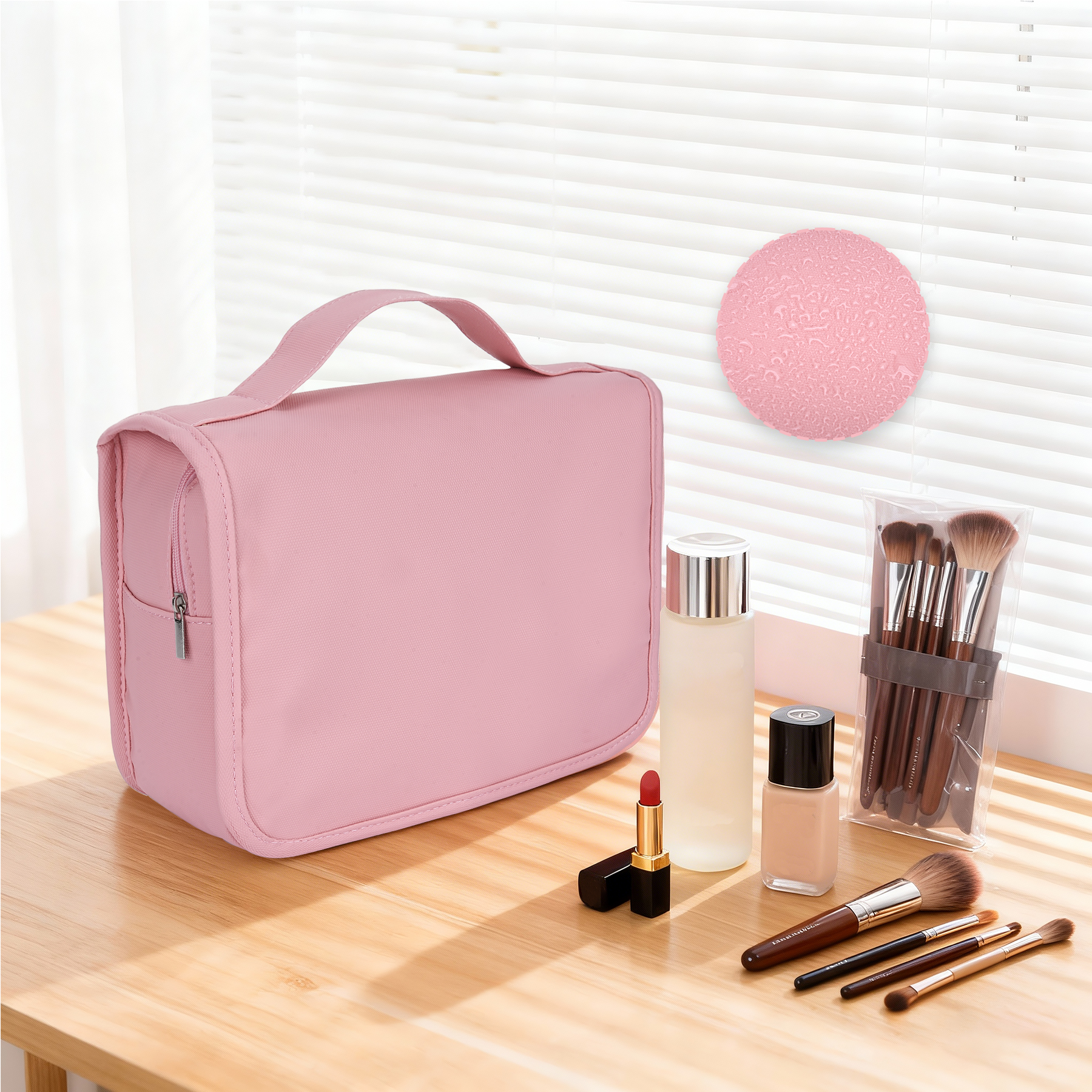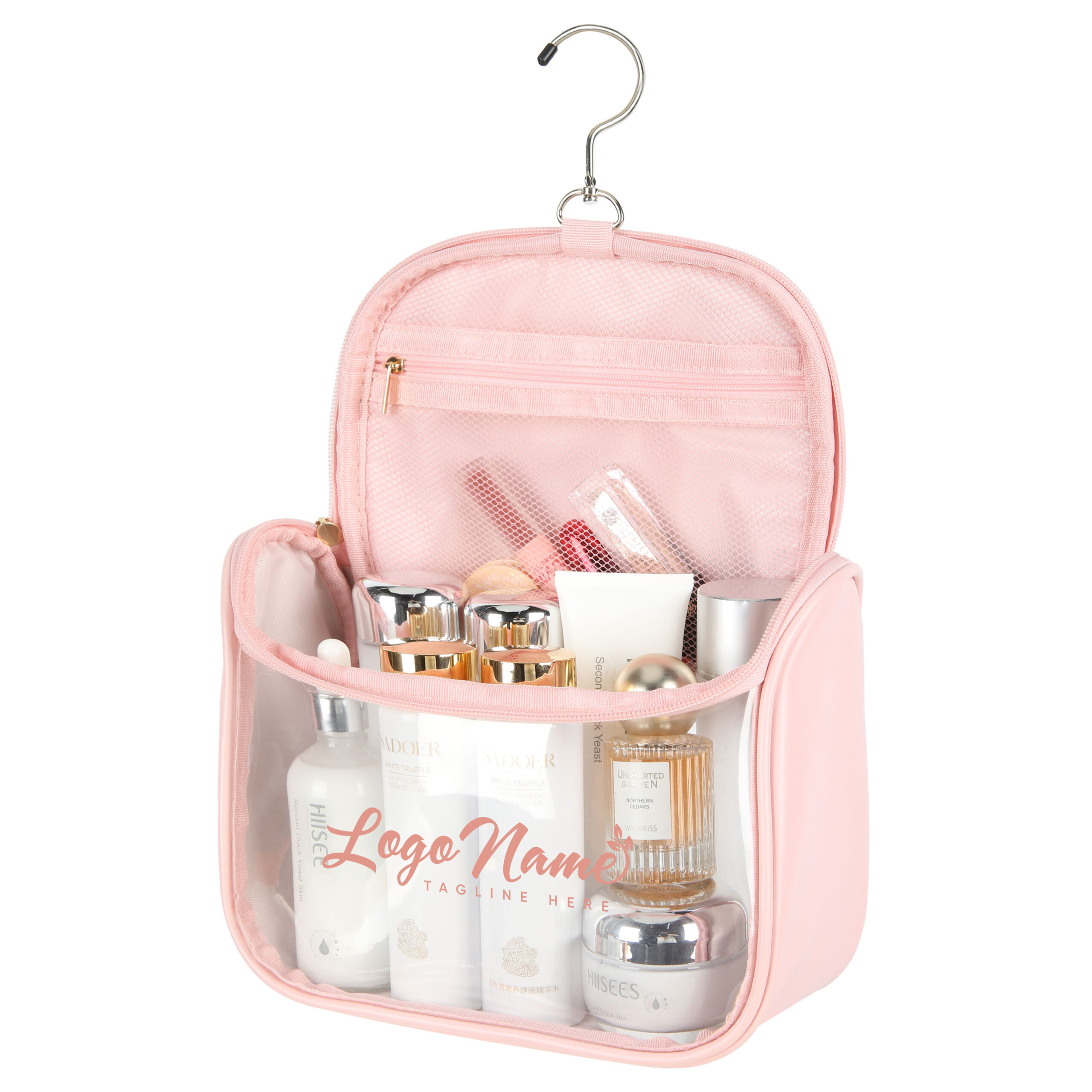 Item# RA1015 –  Crafted from durable, water-resistant 600D PU leather, this hanging toiletry bag keeps your essentials organized and within easy reach wherever you go. A built-in metal hook allows you to hang the bag on a bathroom door, shower rod, or towel rack for quick access, and it folds compactly when not in use. Despite its travel-friendly size, it offers generous storage with three interior compartments for toiletries and cosmetics, a front zip pocket for small items, large exterior pockets for quick access, and an additional rear pocket for extras. Lightweight, sturdy, and portable, it fits neatly into any suitcase—ideal for business travel, family trips, camping, beach days, or gym use. Get a free quote now!