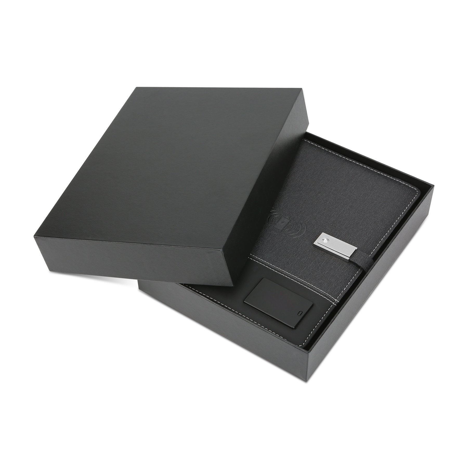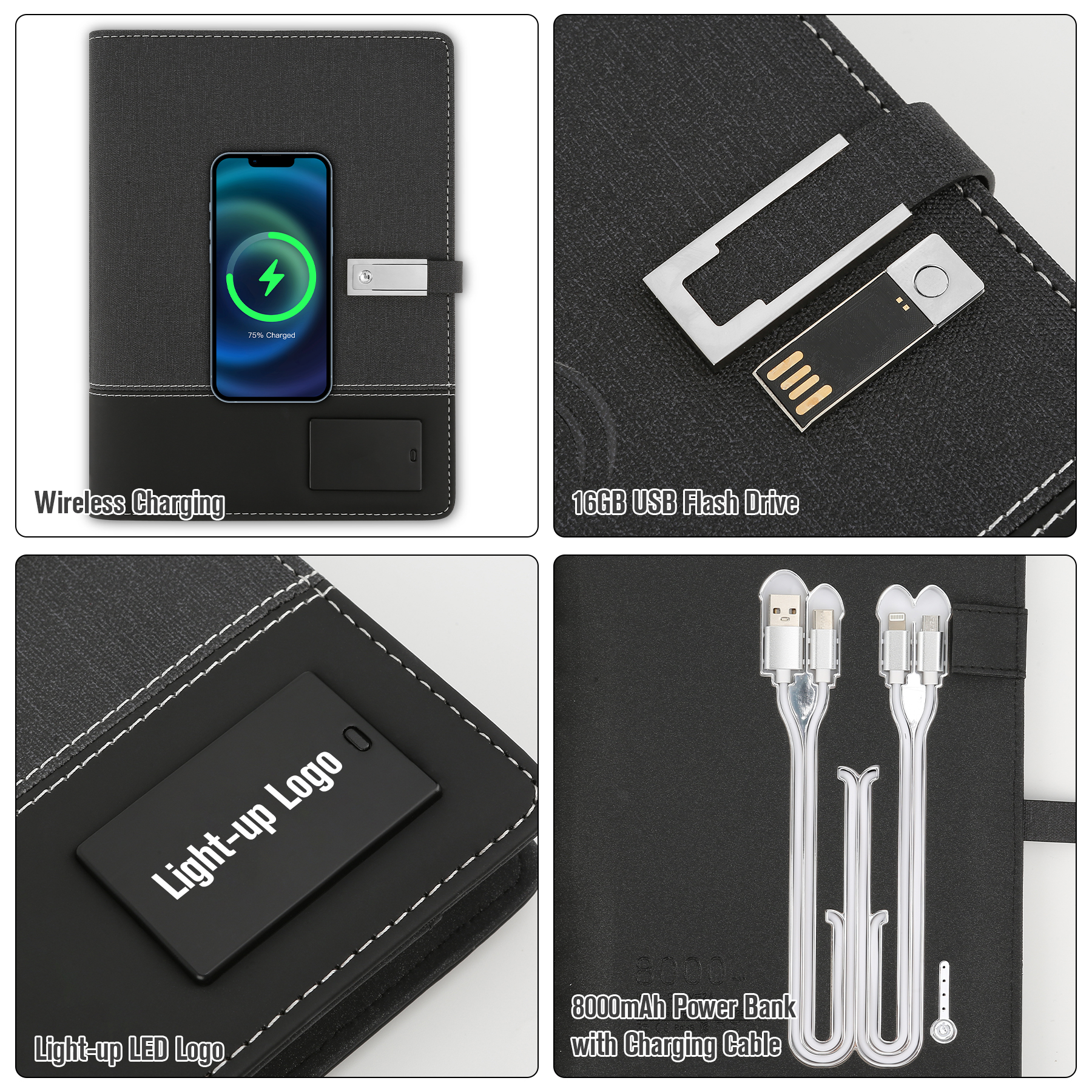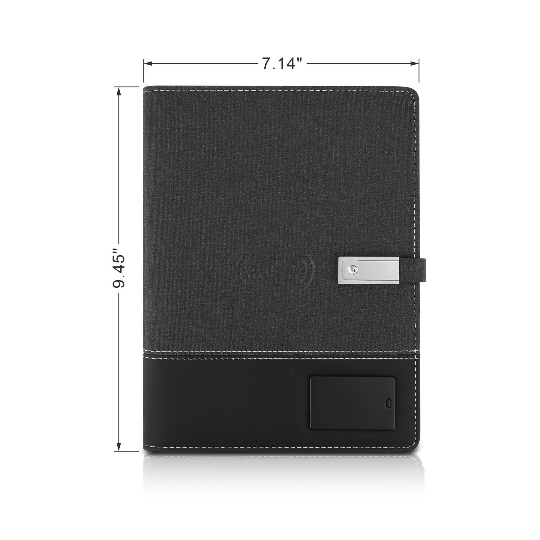 Item# RE1027 –  Enhance your marketing efforts with our Charging Notebook, ideal for promo events. It features UL-certified 8000mAh battery, wireless charger, 16GB USB drive, and 4-in-1 charging cable to ensure your devices stay powered. More than a notebook, it acts as a padfolio with pockets for cards, sponsor or event documents. The LED logo, along with the ample printing area for embossing and UV full-color printing, makes it an ideal executive gift, perfect for conferences and frequent business travelers. Get a free quote now!