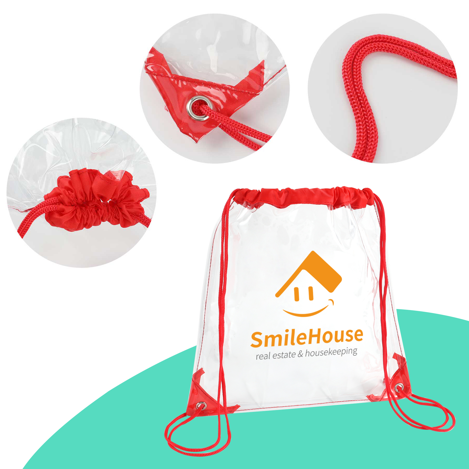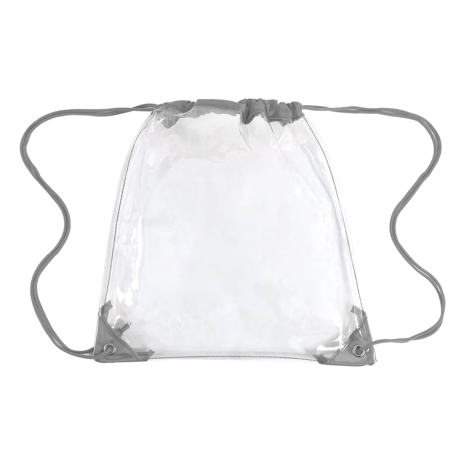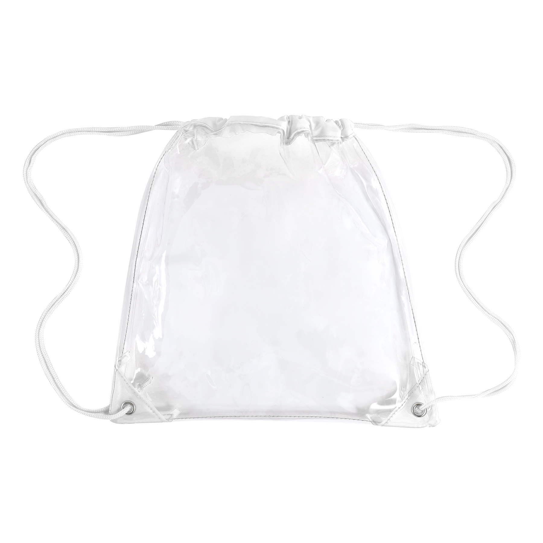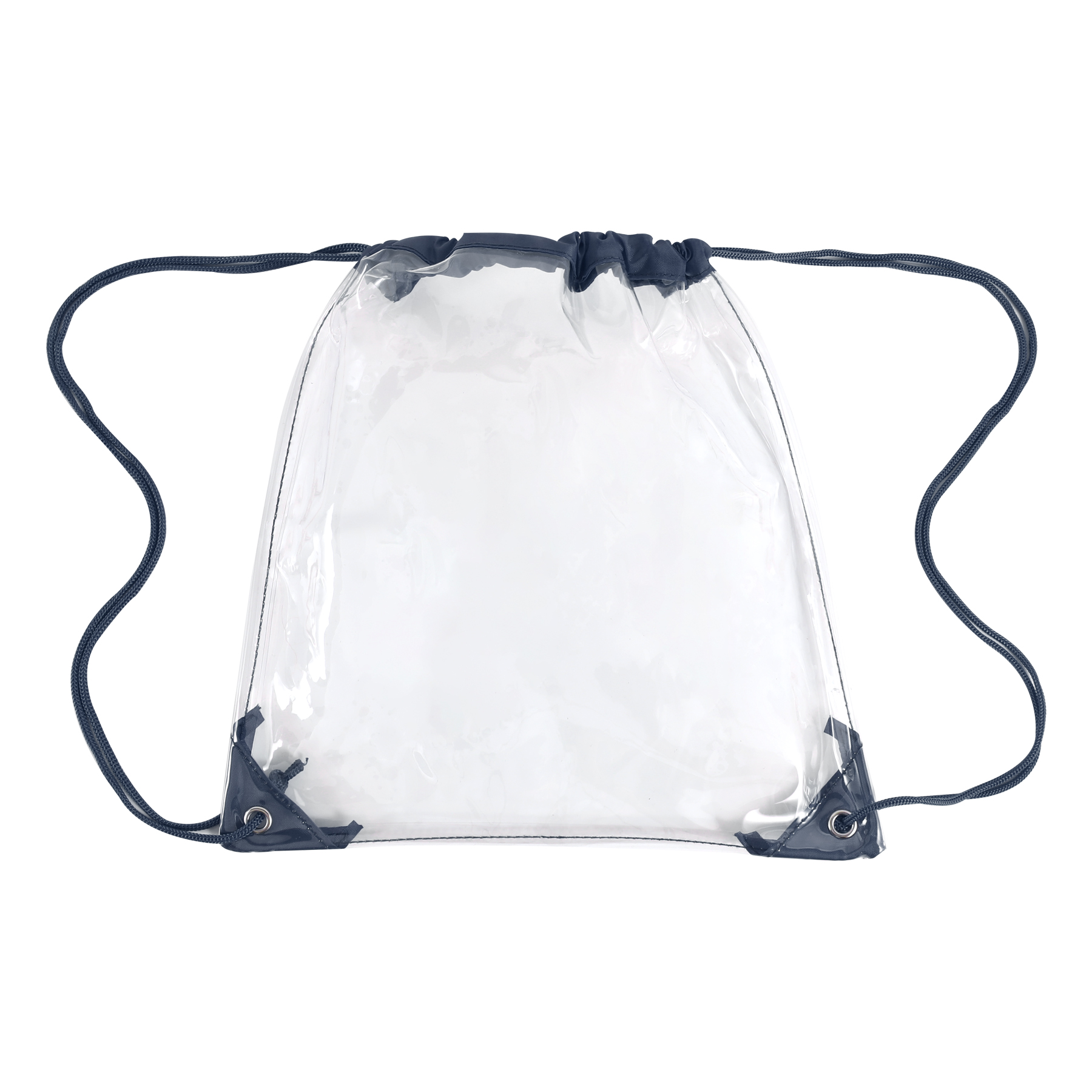 Item# RA1083 –  This clear drawstring bag is made of durable clear vinyl material with bright and eye-catching trim. The drawstring closure compartment can hold clothing, books and bulky items. Reinforced corners with metal grommets are designed for long-lasting using. It also complies with NFL stadium security requirements as long as logo size does not exceed 4.5″ tall by 3.4″ wide. It is ideal for sports and stadiums. Get a free quote now!