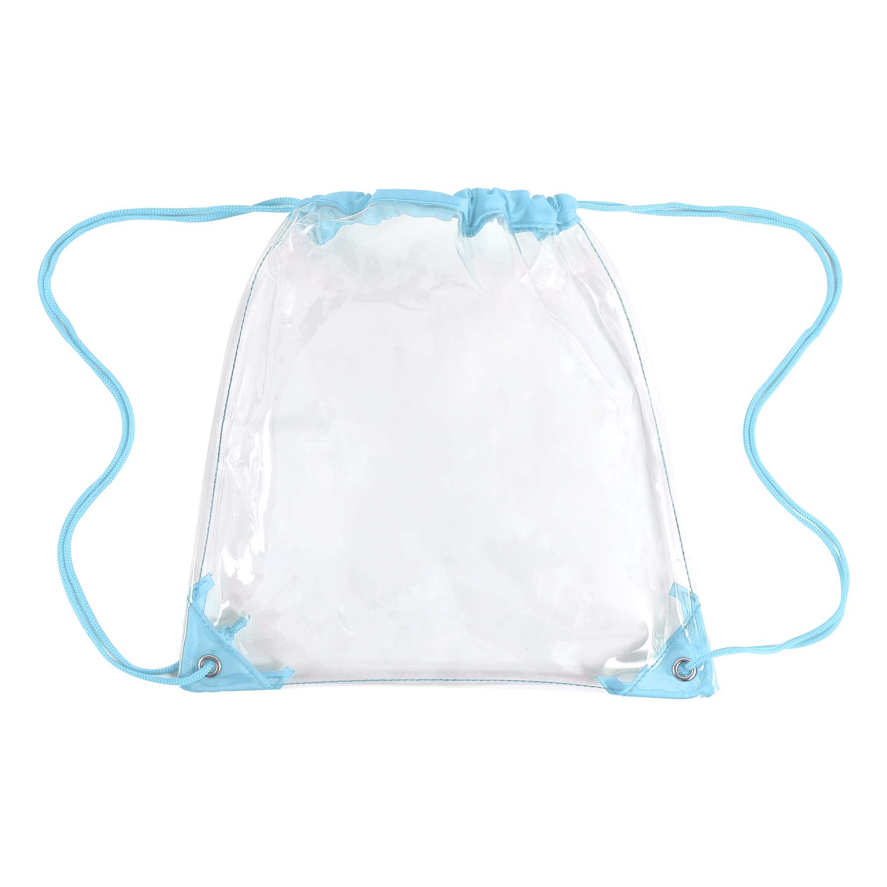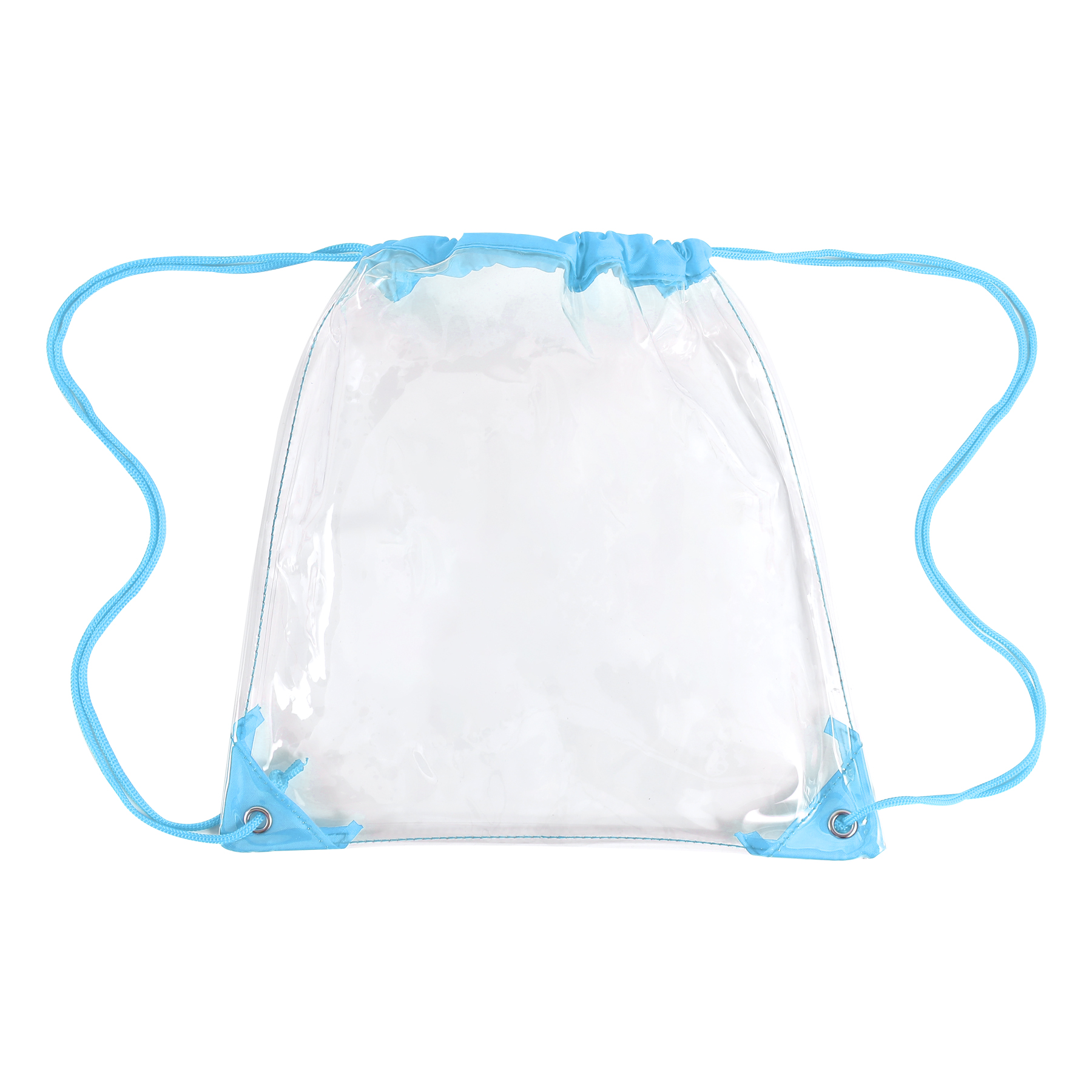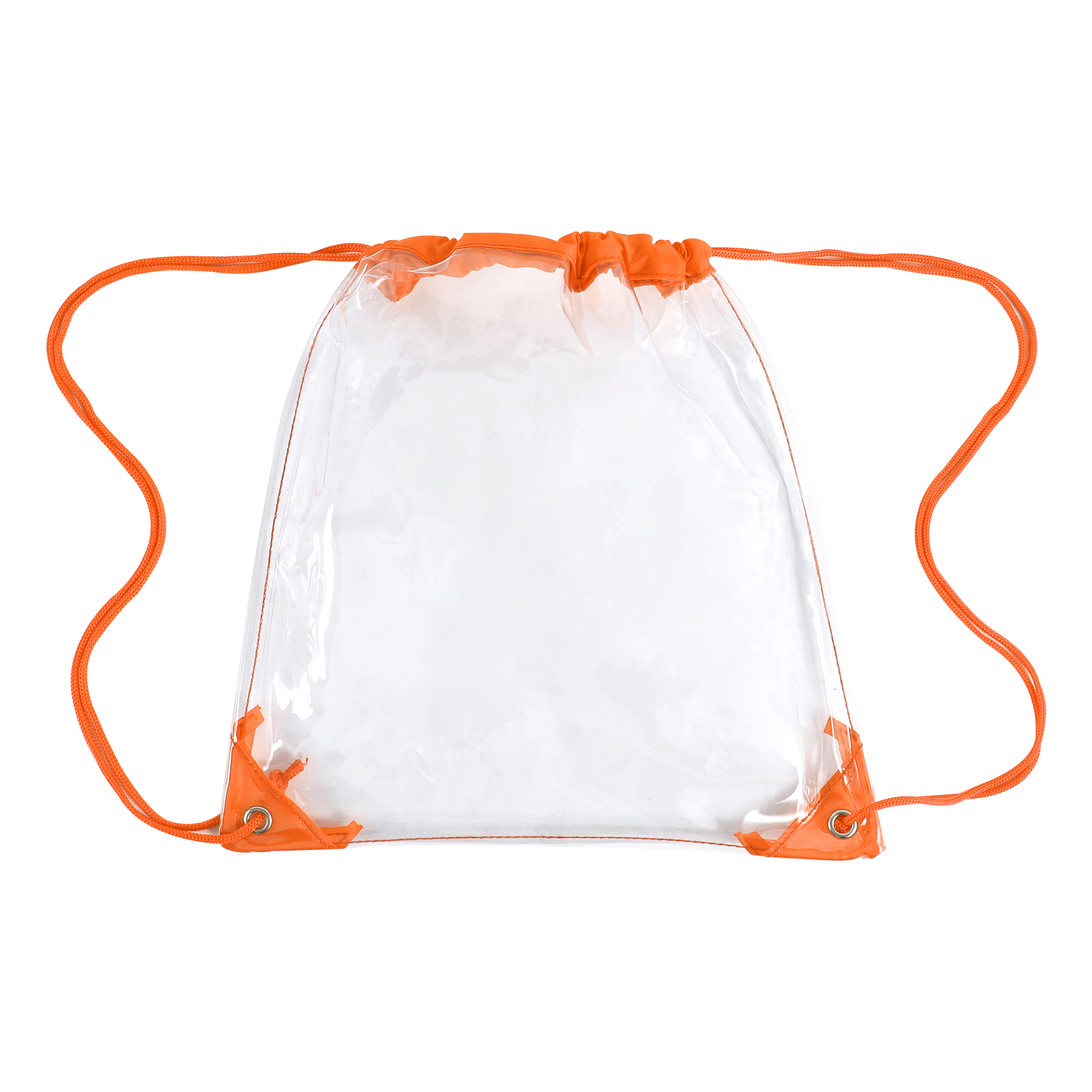 Item# RA1083 –  This clear drawstring bag is made of durable clear vinyl material with bright and eye-catching trim. The drawstring closure compartment can hold clothing, books and bulky items. Reinforced corners with metal grommets are designed for long-lasting using. It also complies with NFL stadium security requirements as long as logo size does not exceed 4.5″ tall by 3.4″ wide. It is ideal for sports and stadiums. Get a free quote now!