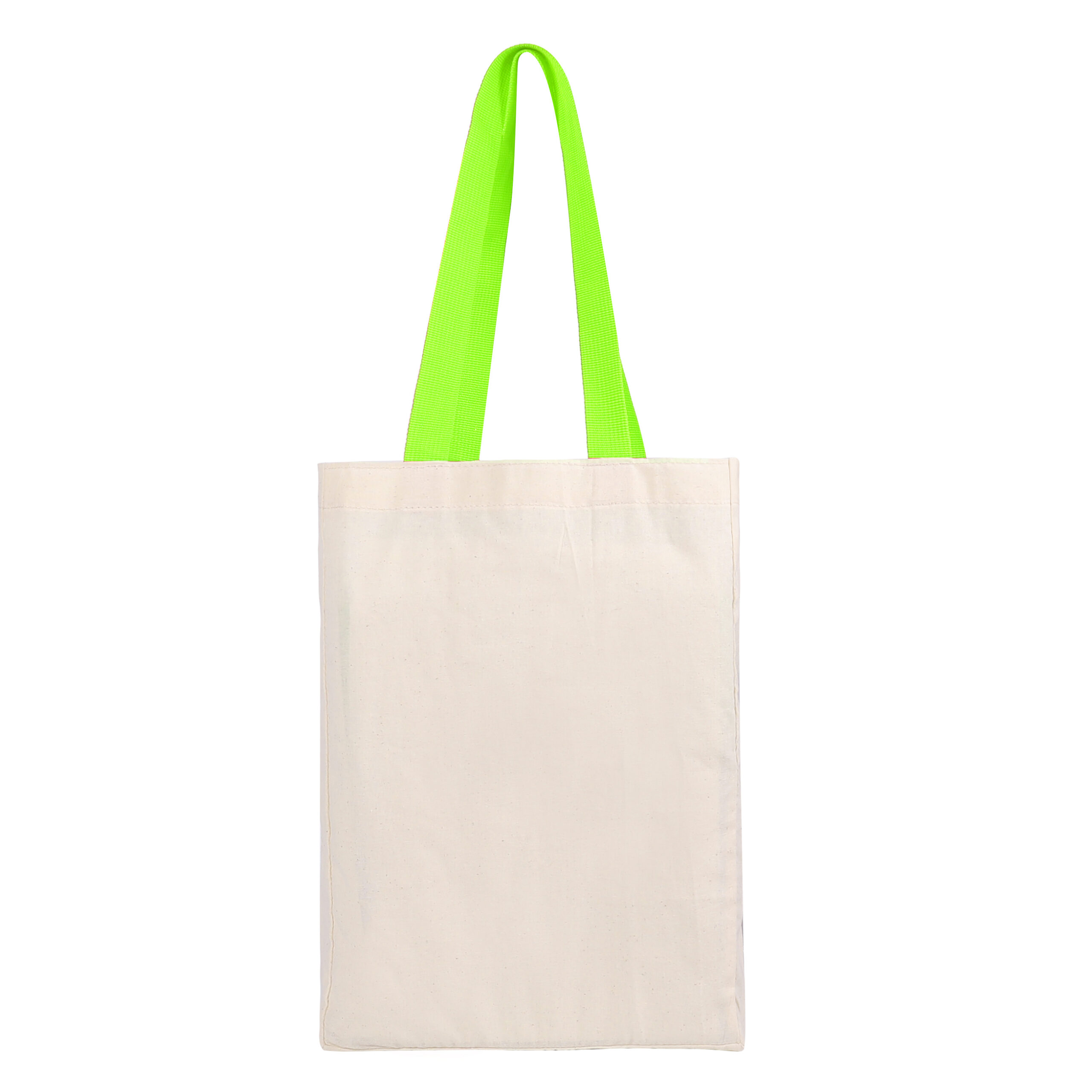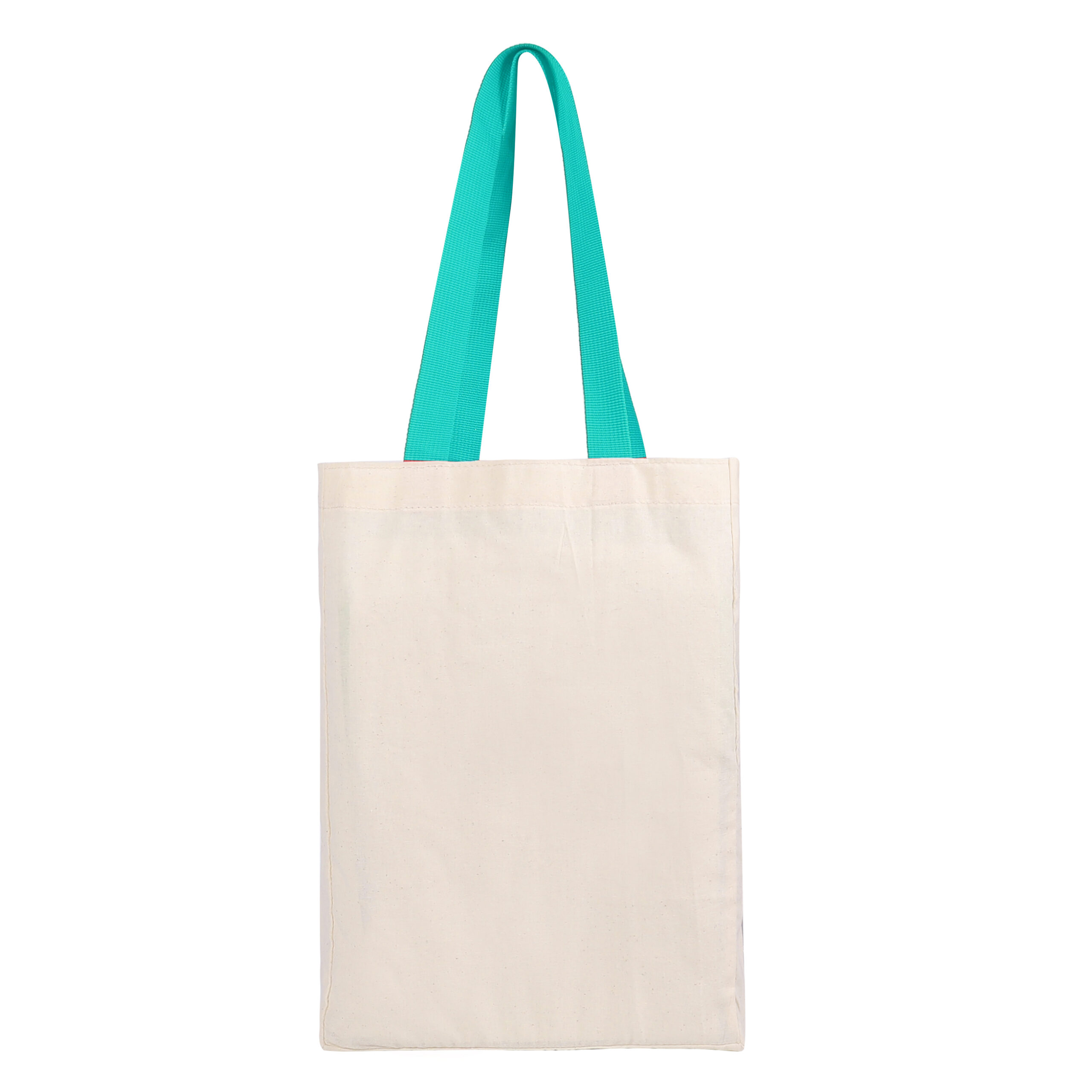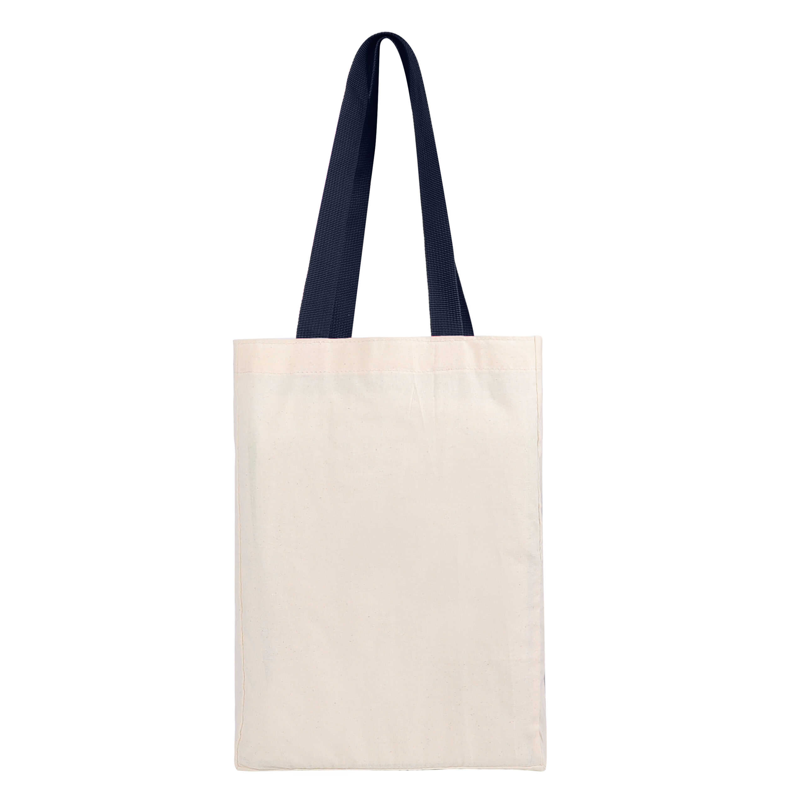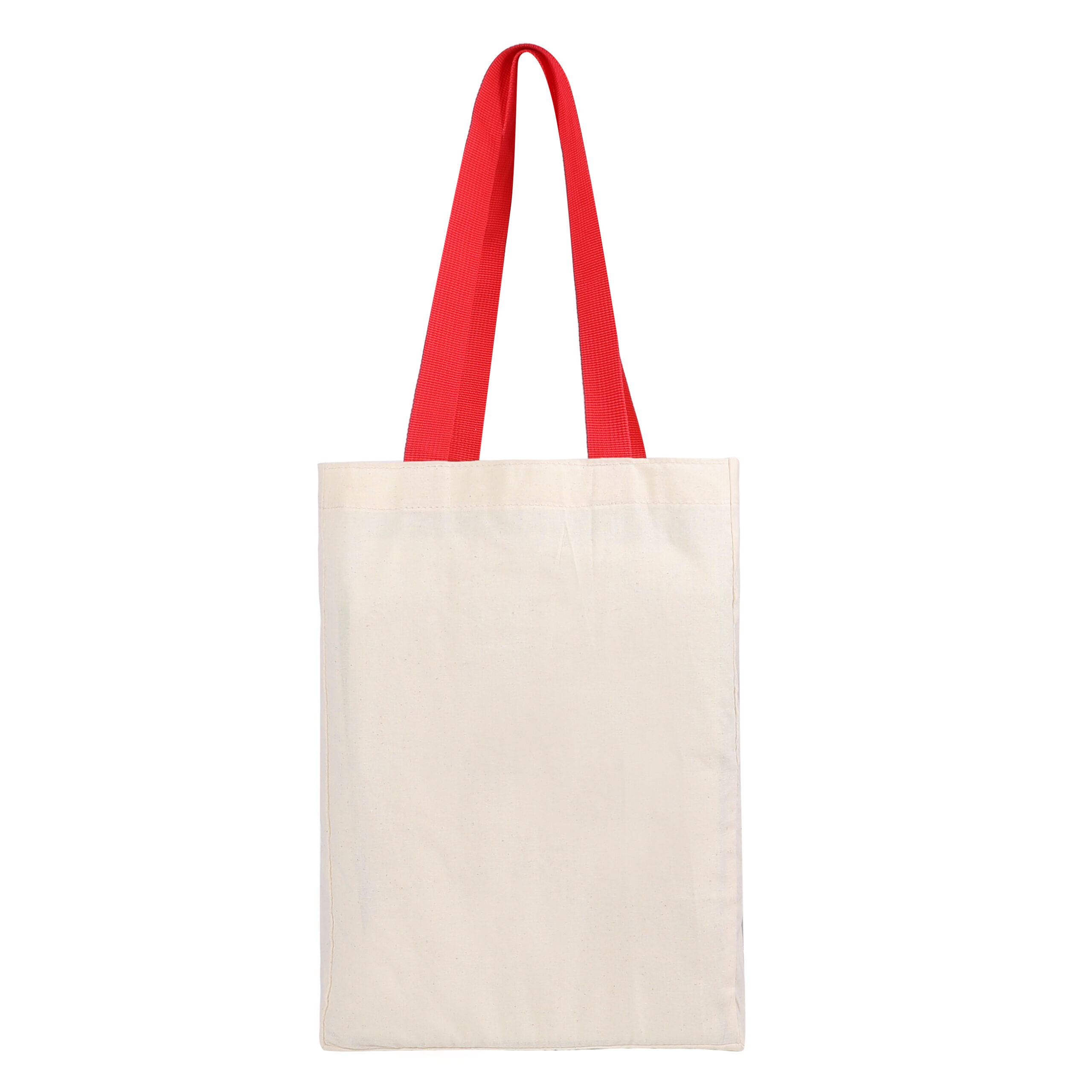 Item# RA1104 –  This 5 oz cotton tote features a 20″ colored handle with a woven web. It is approximately 10″ x 14″ x5″. The sizing is convenient and durable. It comes in two colors and is ideal for school, office, work, grocery shopping, or for traveling. Get a free quote now!