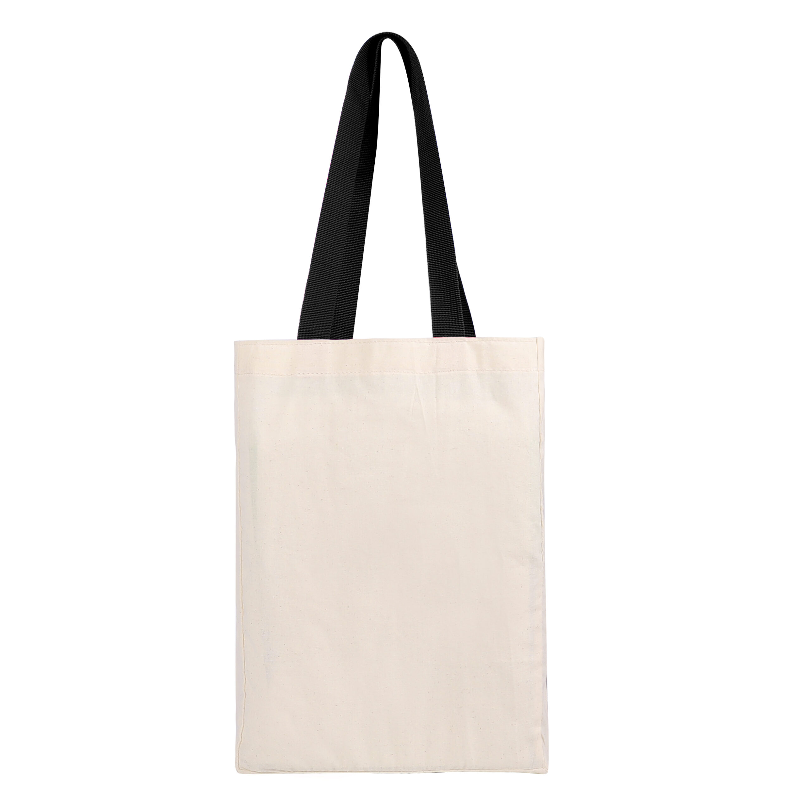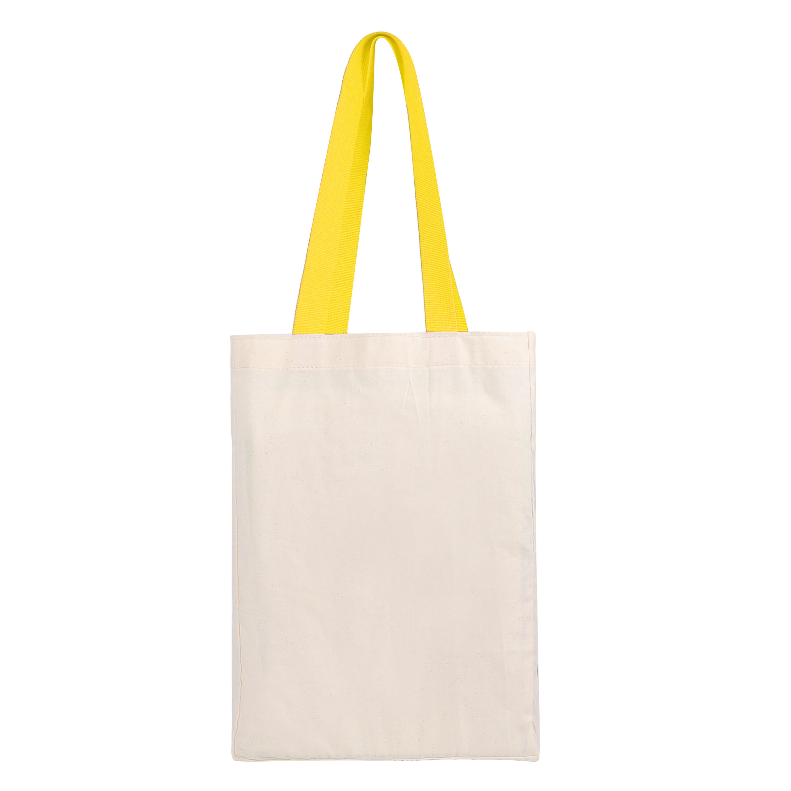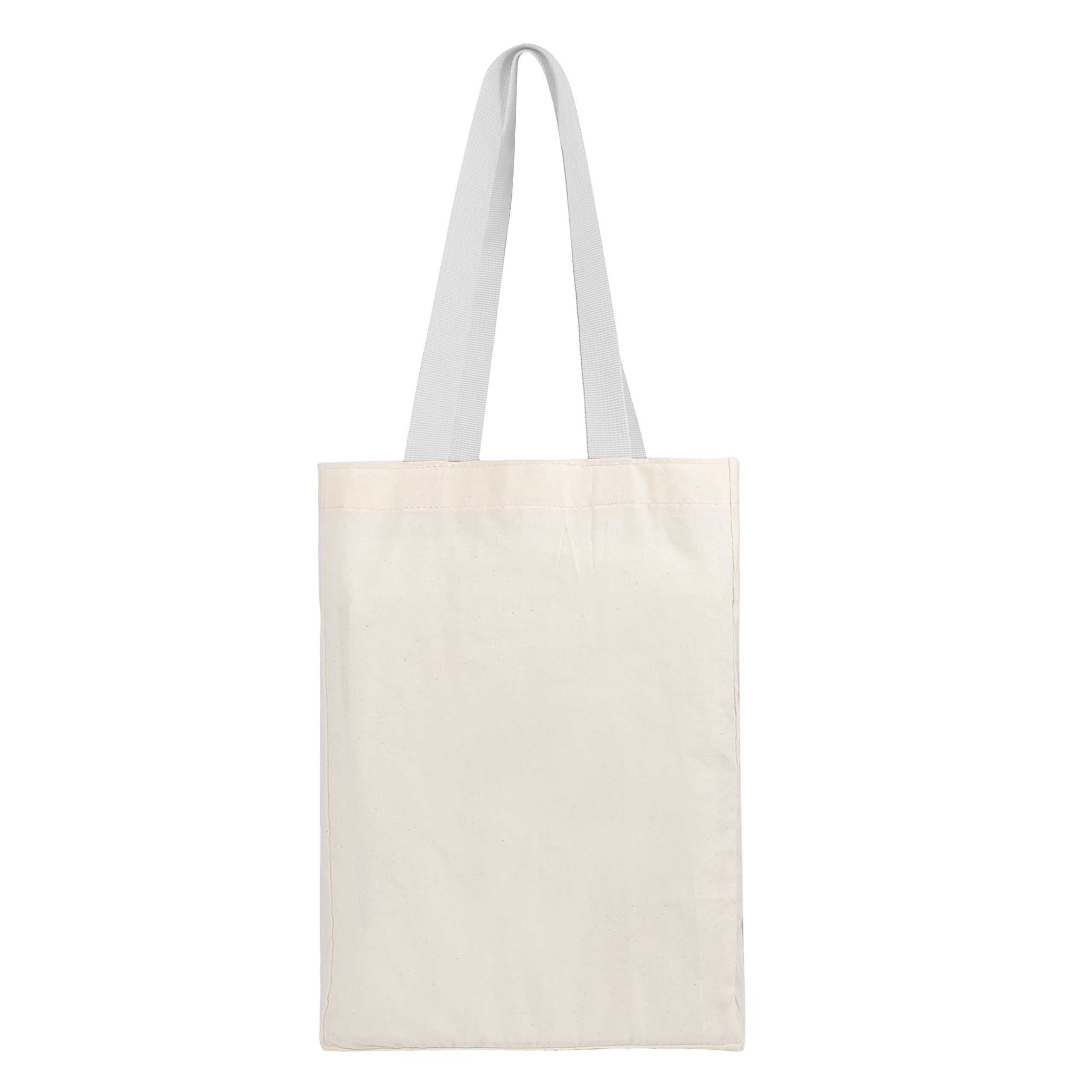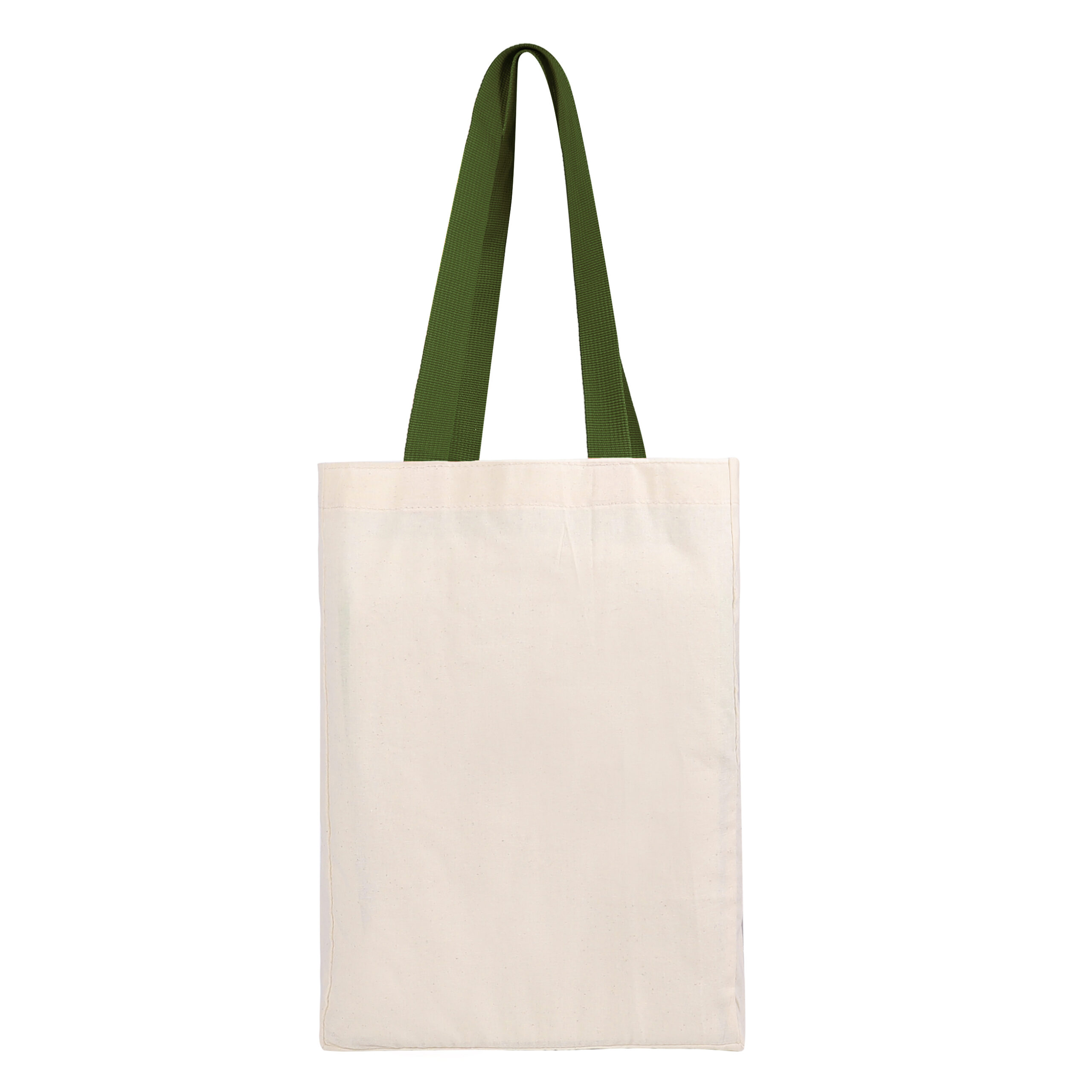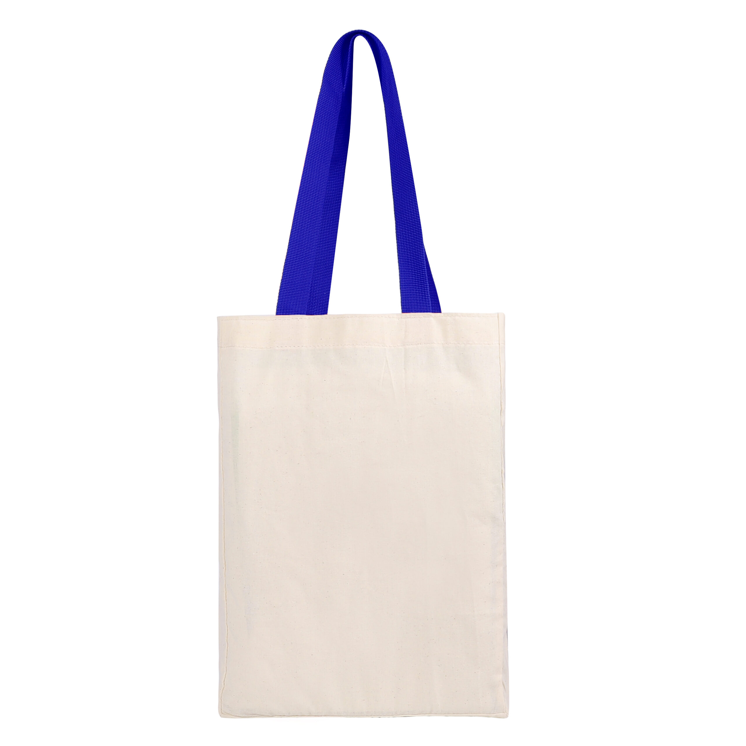 Item# RA1104 –  This 5 oz cotton tote features a 20″ colored handle with a woven web. It is approximately 10″ x 14″ x5″. The sizing is convenient and durable. It comes in two colors and is ideal for school, office, work, grocery shopping, or for traveling. Get a free quote now!
