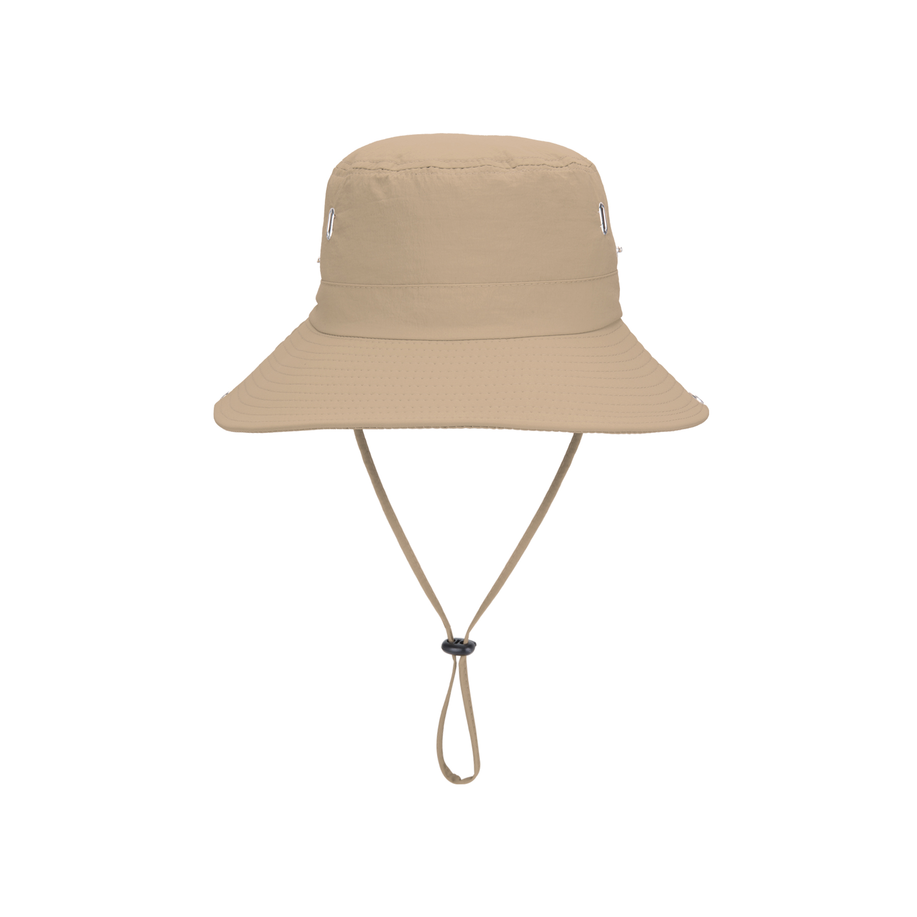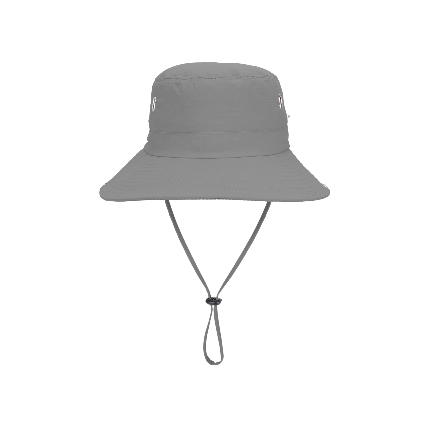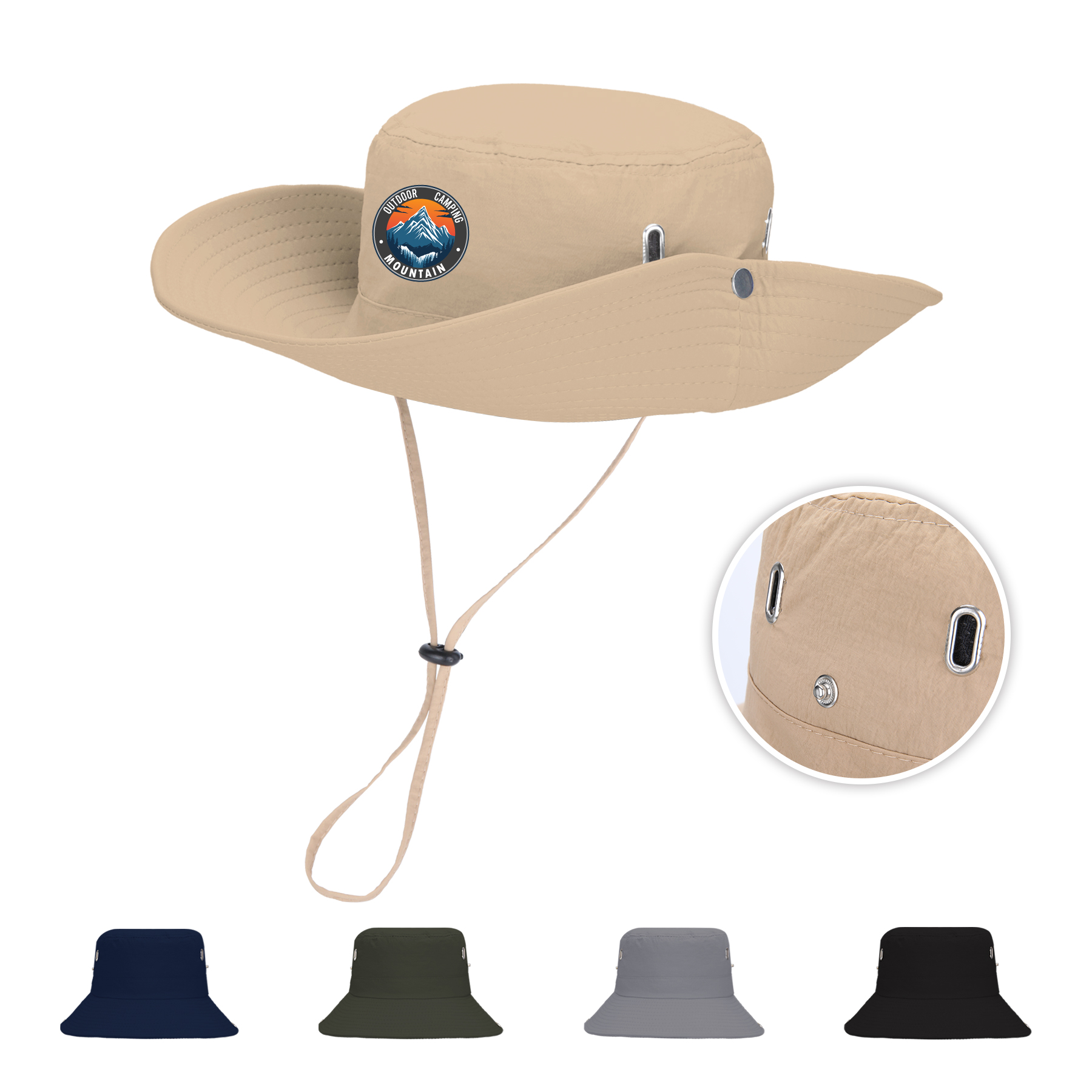 Item#  RC1038 –  Stay cool and protected with this wide-brim sun bucket hat, crafted from waterproof, quick-drying polyester for all-weather performance. Four side eyelets provide breathability, while the soft cotton sweatband adds all-day comfort. Designed for versatility, it features an adjustable chin strap, windproof drawstring, and side snaps to style the brim up for a rugged cowboy look. The foldable design fits easily into your pocket or bag, making it perfect for hiking, fishing, camping, and more. Available in khaki, black, navy, gray, and army green. Custom logo heat transfer supported. Get a free quote now!