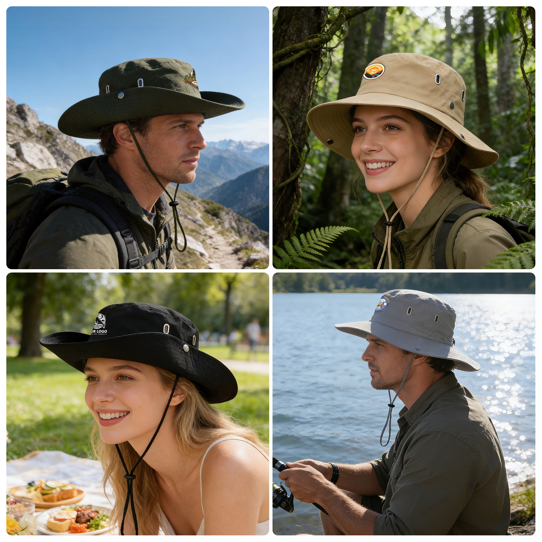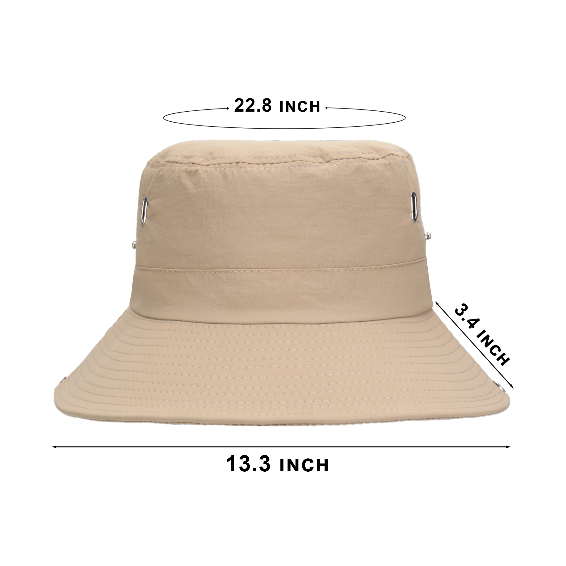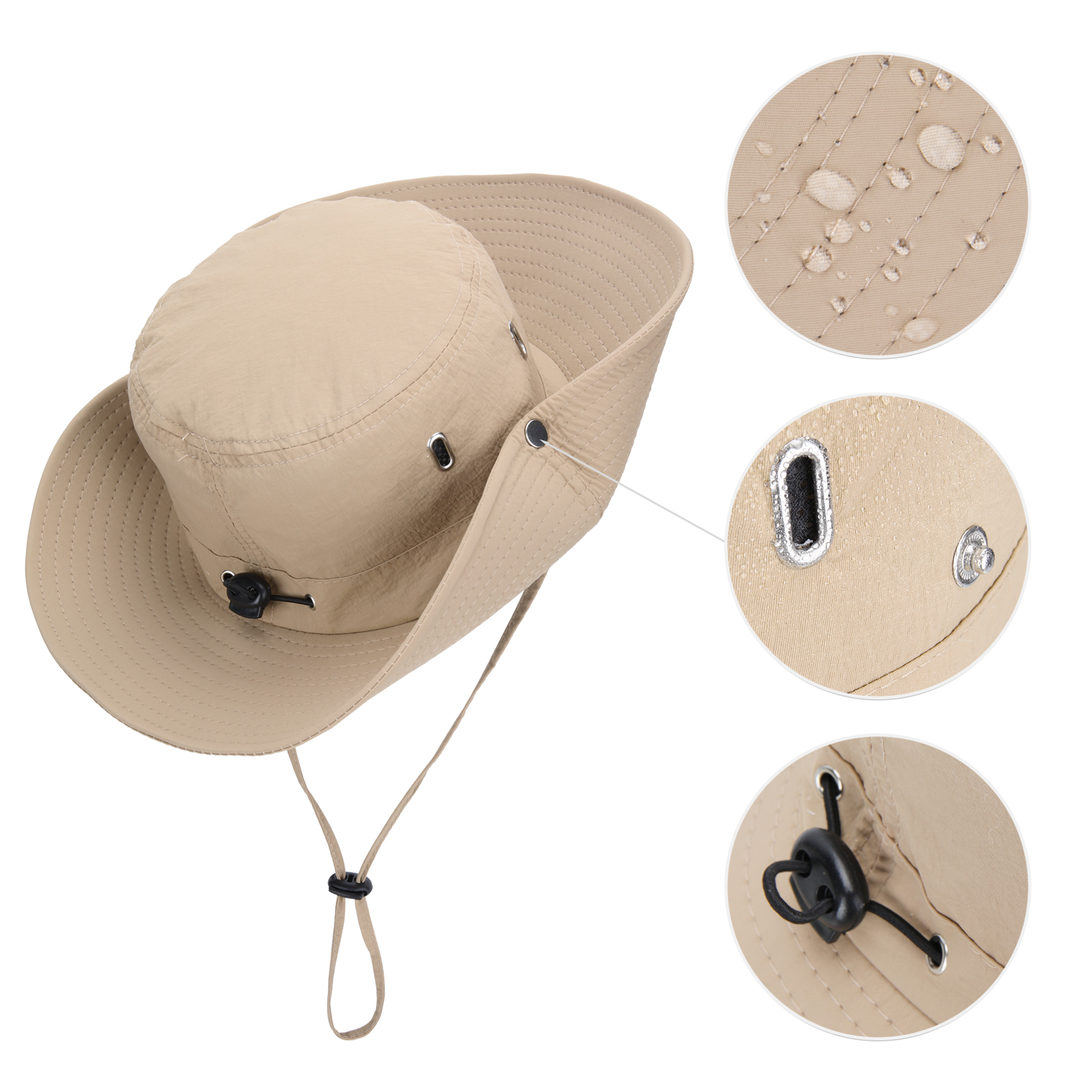 Item#  RC1038 –  Stay cool and protected with this wide-brim sun bucket hat, crafted from waterproof, quick-drying polyester for all-weather performance. Four side eyelets provide breathability, while the soft cotton sweatband adds all-day comfort. Designed for versatility, it features an adjustable chin strap, windproof drawstring, and side snaps to style the brim up for a rugged cowboy look. The foldable design fits easily into your pocket or bag, making it perfect for hiking, fishing, camping, and more. Available in khaki, black, navy, gray, and army green. Custom logo heat transfer supported. Get a free quote now!