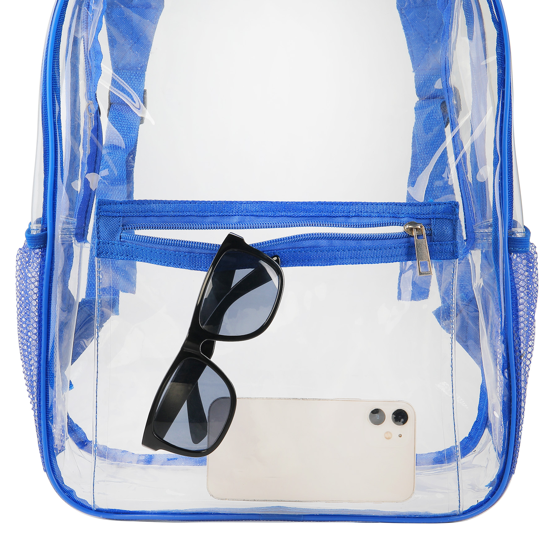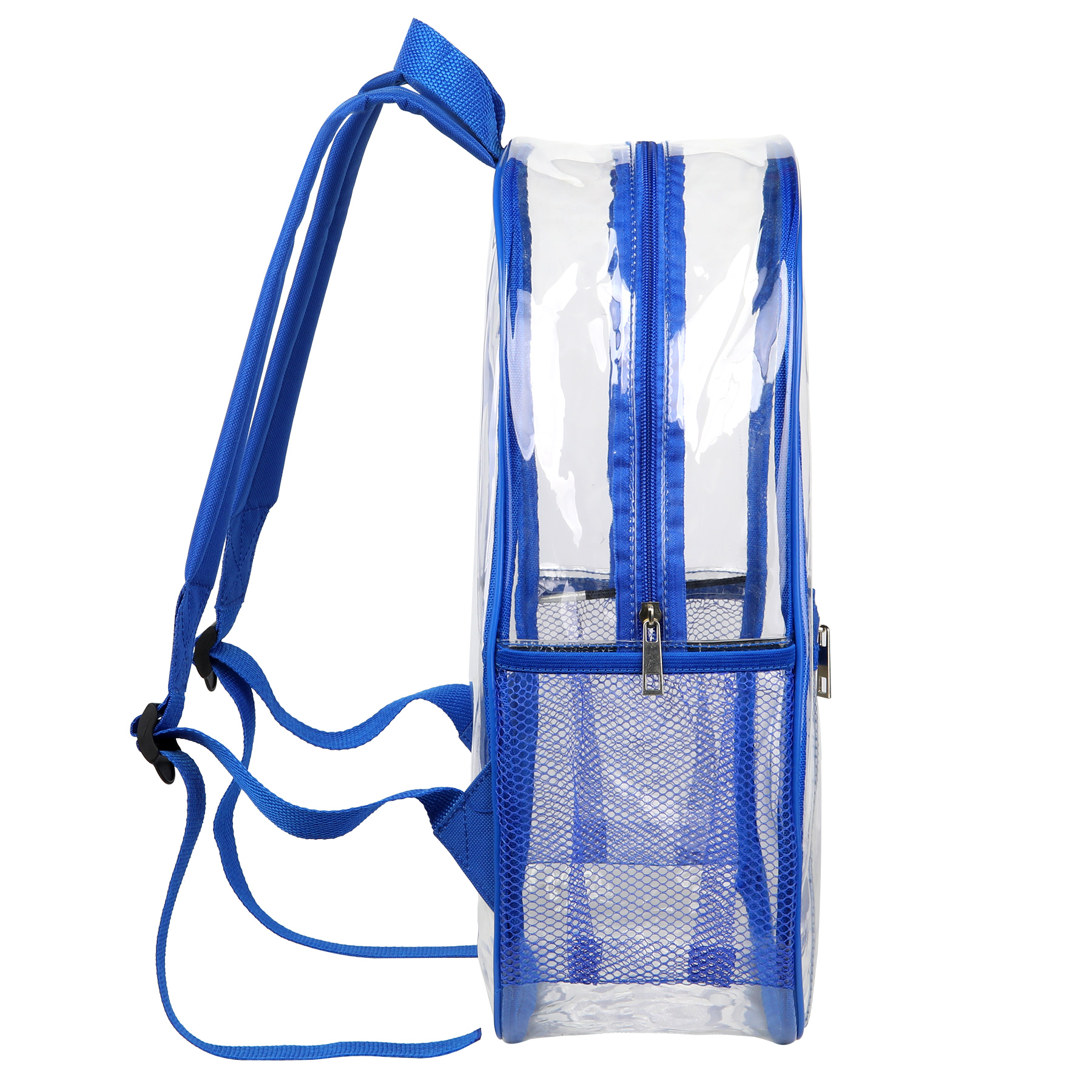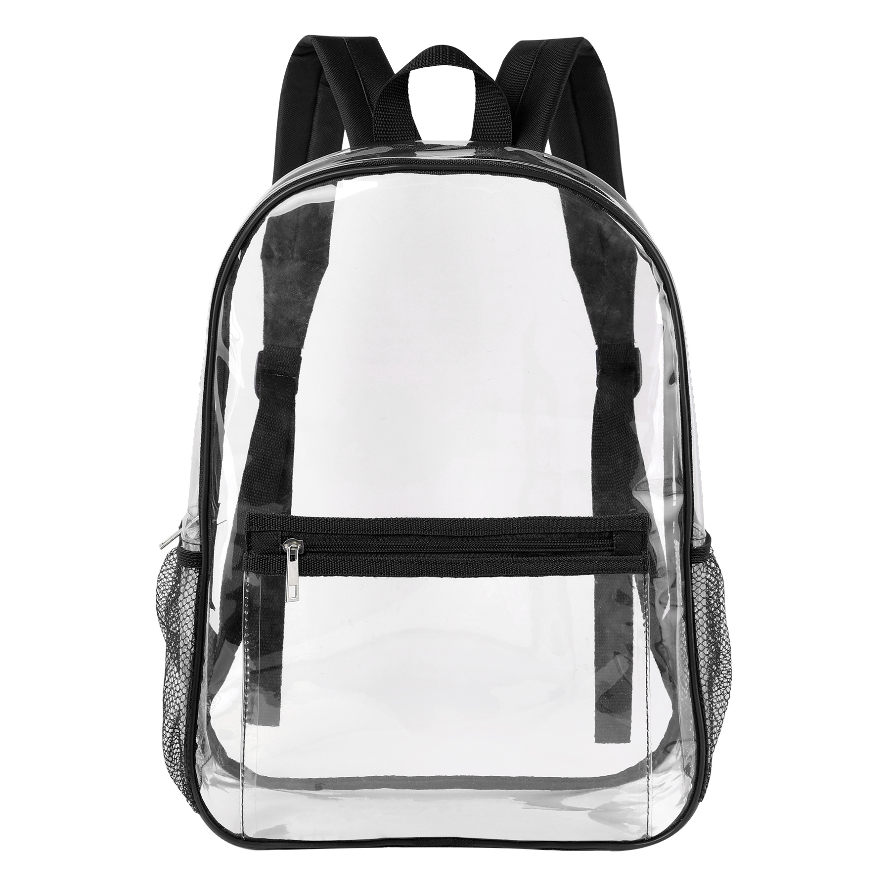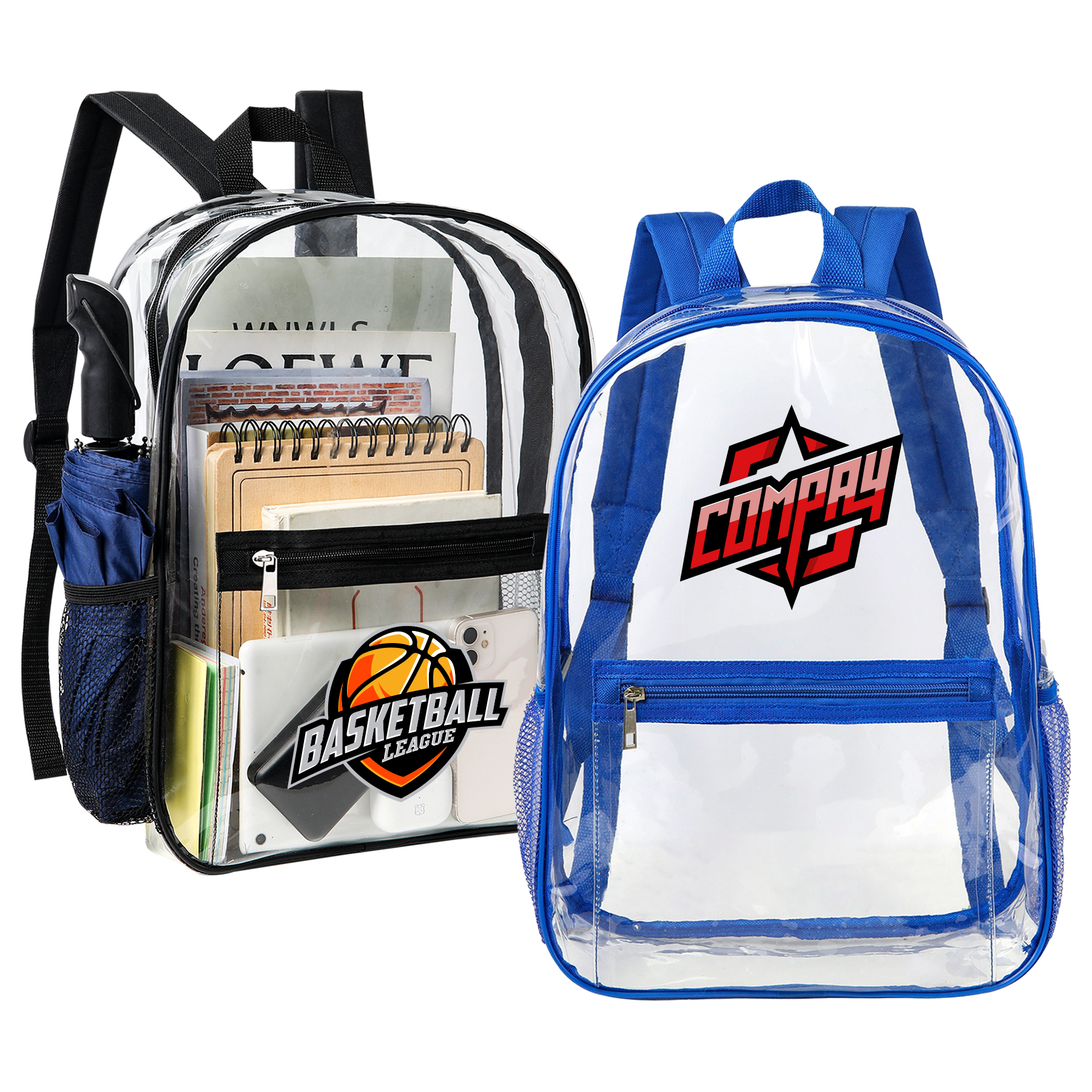 Item# R 641 –  This clear backpack is made of 0.3mm PVC, perfect for taking to school, group events, sporting venues, and other places where transparent bags are required. The transparent backpack allows complete visibility all round. It could provide a quick check and easy access when passing through security. Moreover, it’s convenient to double-check if there is any missing item before you leave.The front zipper bag and two side mesh pockets also provide easy access to smaller items such as keys, pens, ID cards, sunglasses, cosmetics, snacks, etc. Smooth zipper pullers help a lot. Large main compartment is big enough for notes, pencil case, T-shirts. Being transparent, any logo will stand out as the main attraction when placed on this clear backpack. Get a free quote now!