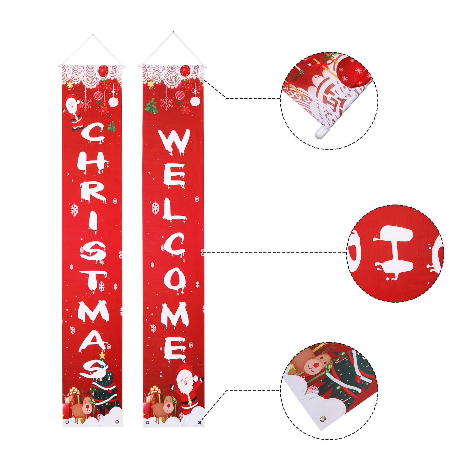 Item# RB1007 –  Crafted from durable 300D Oxford fabric and measuring 12*70 inches, each couplet is custom-printed using sublimation technology to ensure vibrant, long-lasting color. The fabric resists wind, snow, and fading while remaining wrinkle-free, ensuring your display stays vibrant year after year. Designed with reinforced stitching and grommet holes for secure hanging, these banners are easy to display on doors, porches, windows, garages, or walls. Built with high-density textile technology, they combine premium quality with festive charm—perfect for creating a welcoming holiday atmosphere. Get a free quote now!