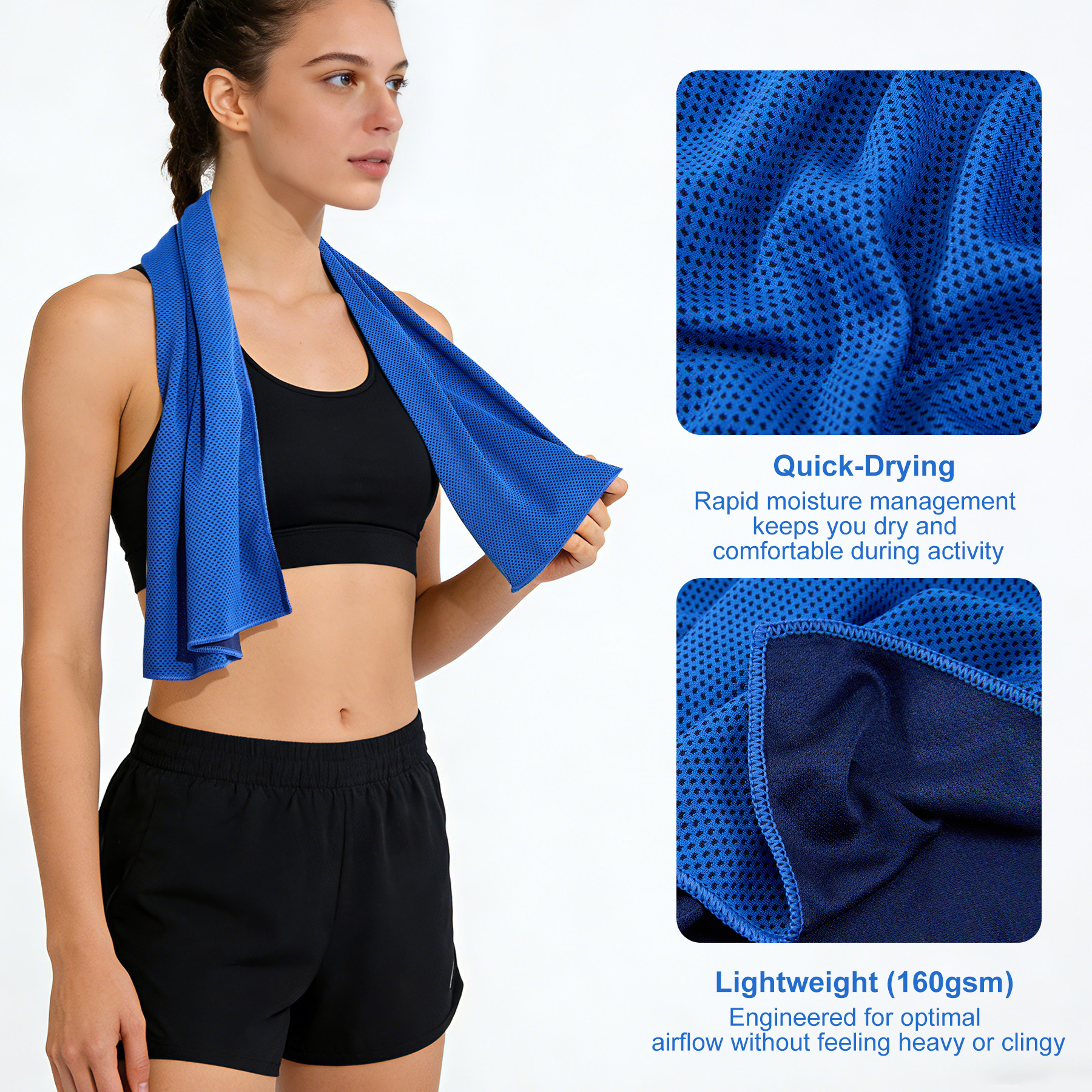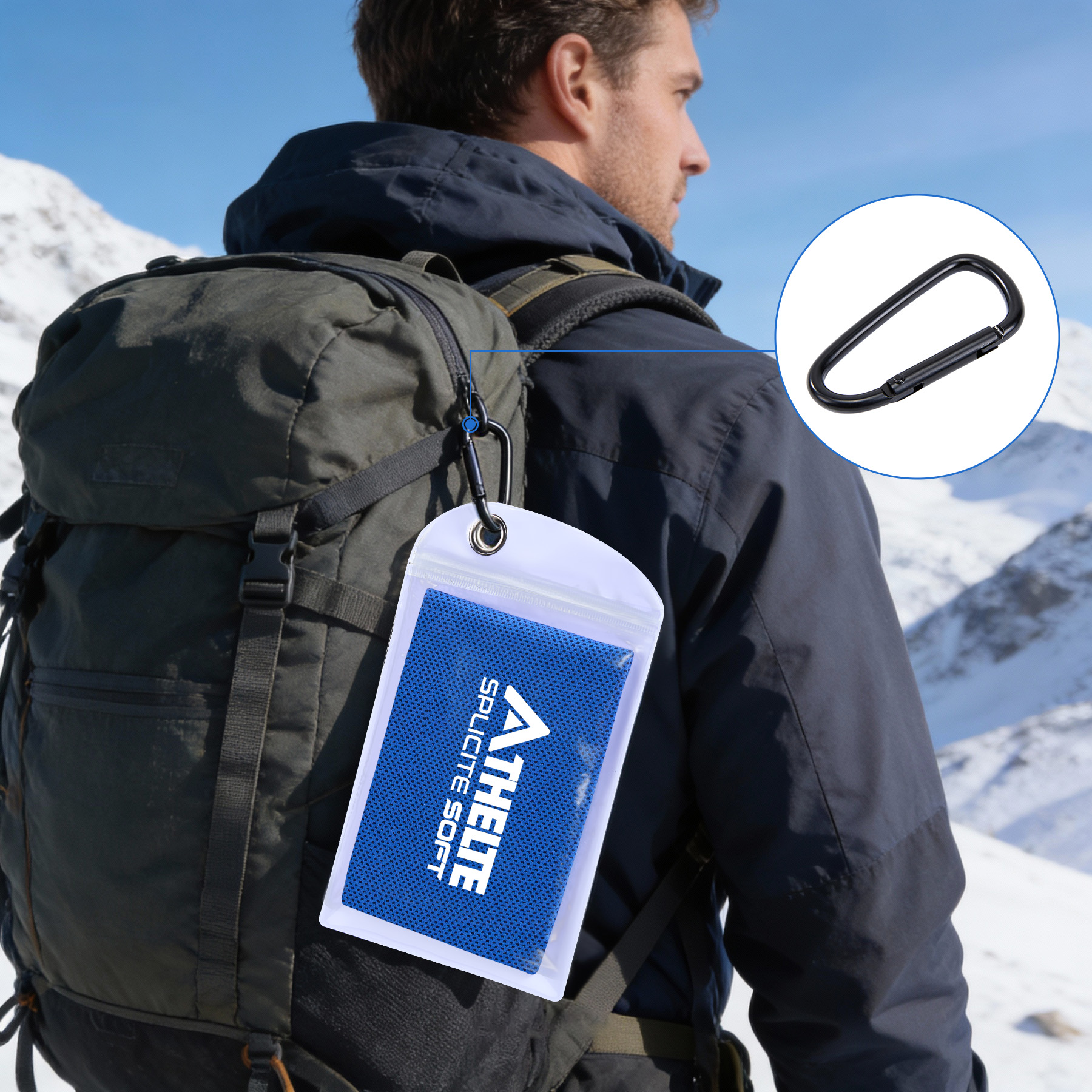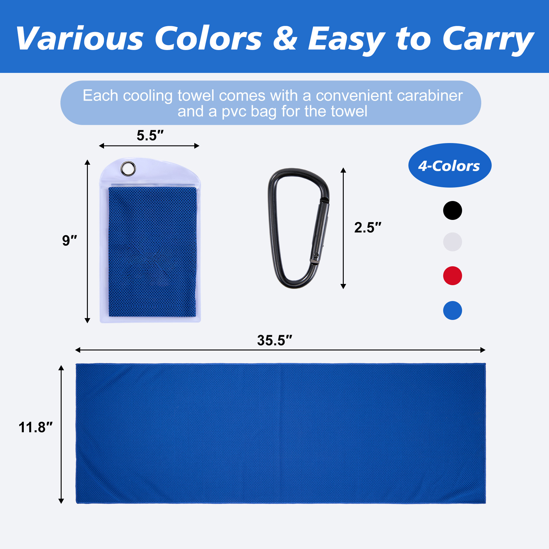 Item# R 615 –  Our towels are made of lightweight polyester-160gsm with a mesh structure. PVC Zippered pockets with carabiners are suitable for all kinds of sports occasions. Simply moisten and wring it out to activate it. Keeps you cool in the sun. A variety of colors are available. The pouch measures 5.4 x 9 inches, while the towel expands to 11.8 x 35.5 inches when opened. Printing on pockets and towels are available, printing on the towel is default. Additional cost will need if printing on two locations. Get a free quote now!