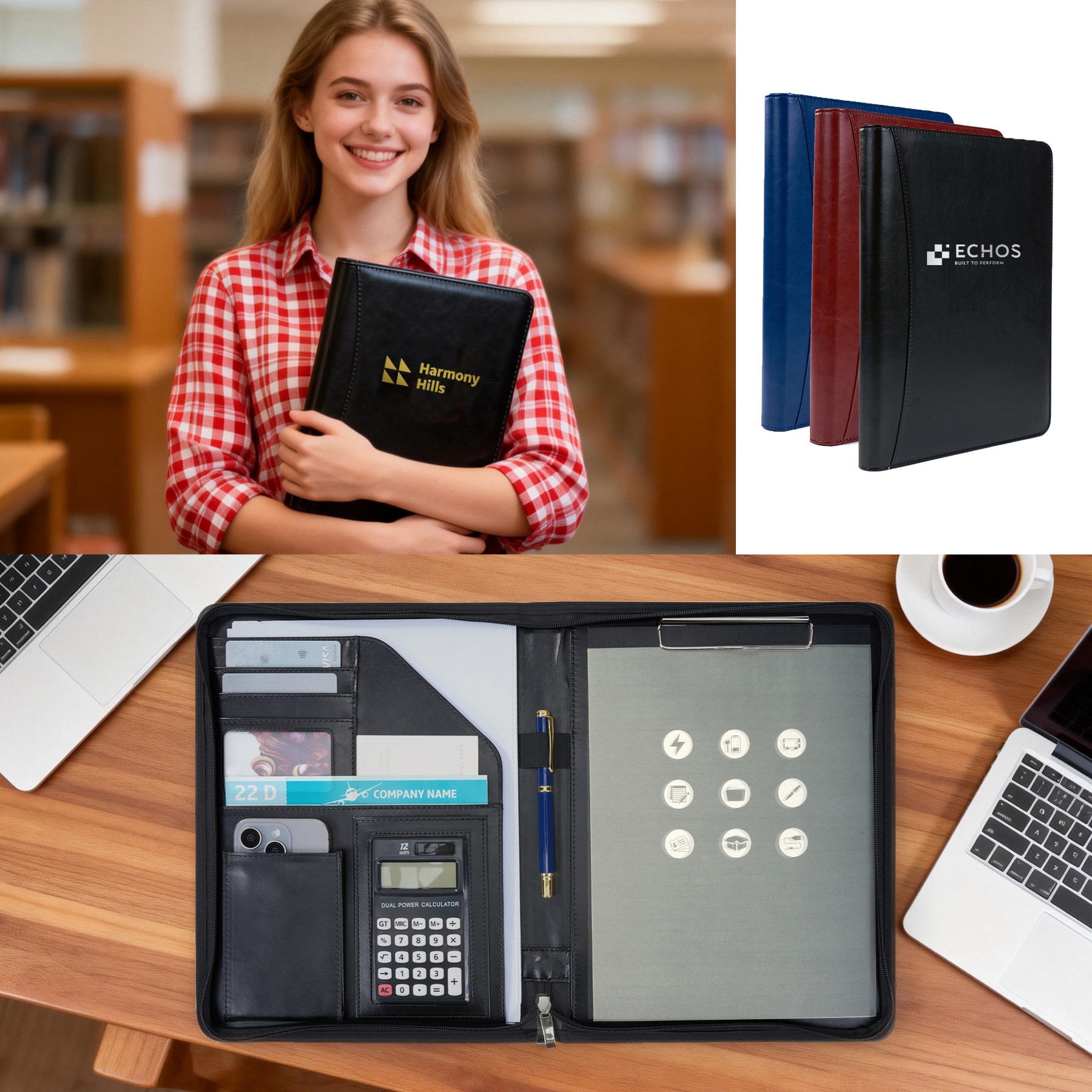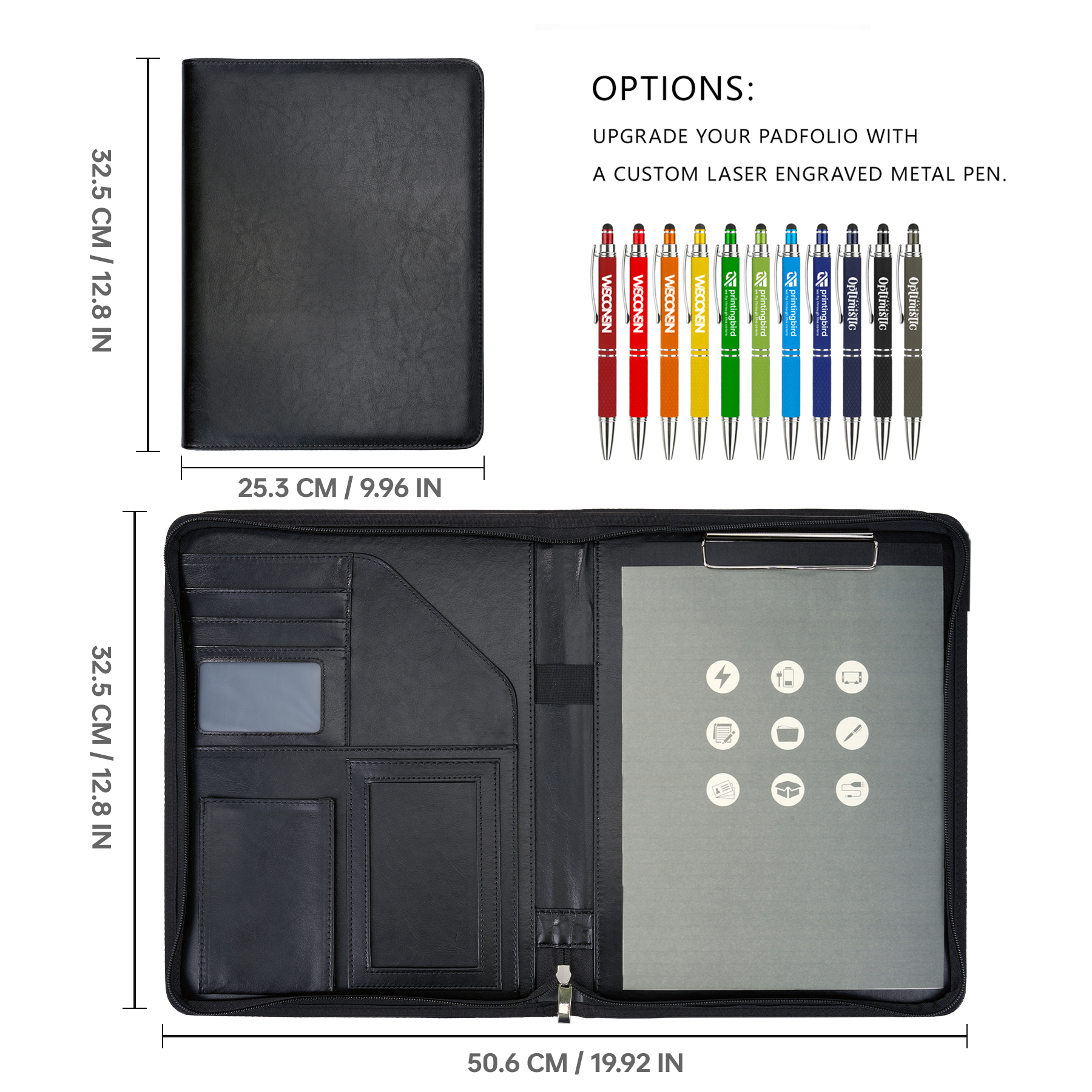 Item#  RO1034 –  Become an advertising leader with the Deluxe Executive Padfolio! Made of simulated leather, this stylish padfolio features a curved exterior pocket, zippered closure, multi-pocket organizer, slash pocket that fits most tablets, pen loop, and an 8 1/2″ x 11″ paper pad (also fits A4). Calculator not included. Optional add-on available with a premium metal stylus pen for enhanced branding. Customize with debossing or foil stamping to elevate brand visibility today! Get a free quote now!