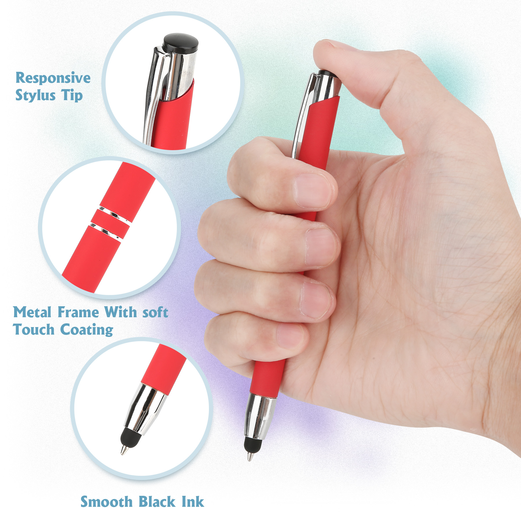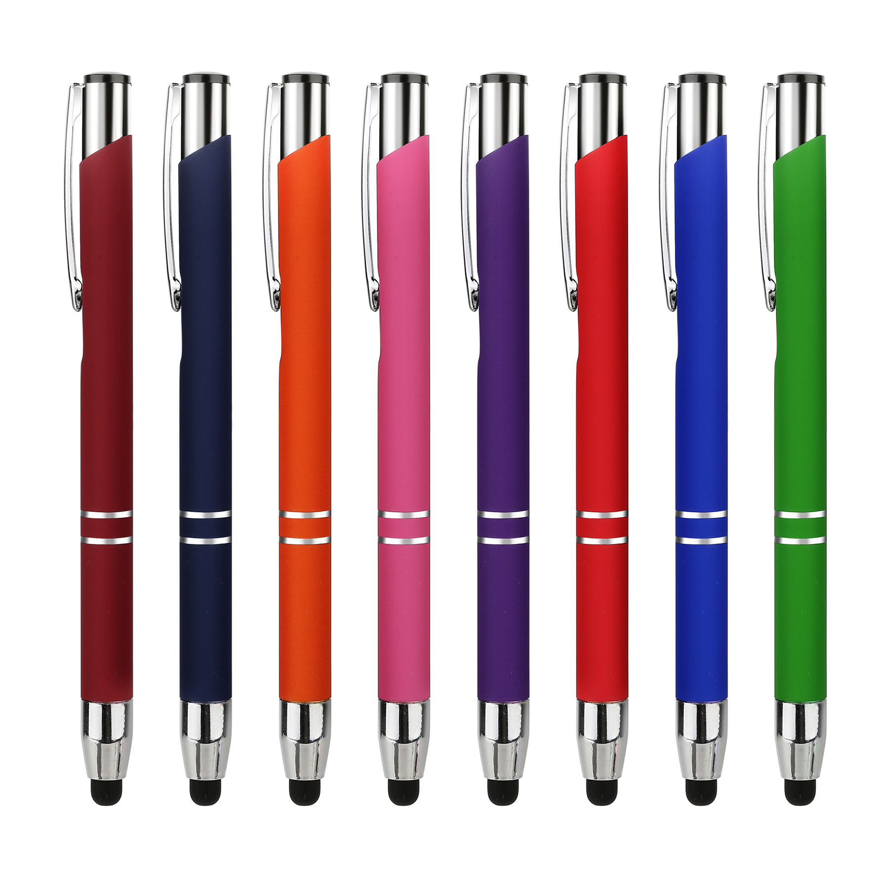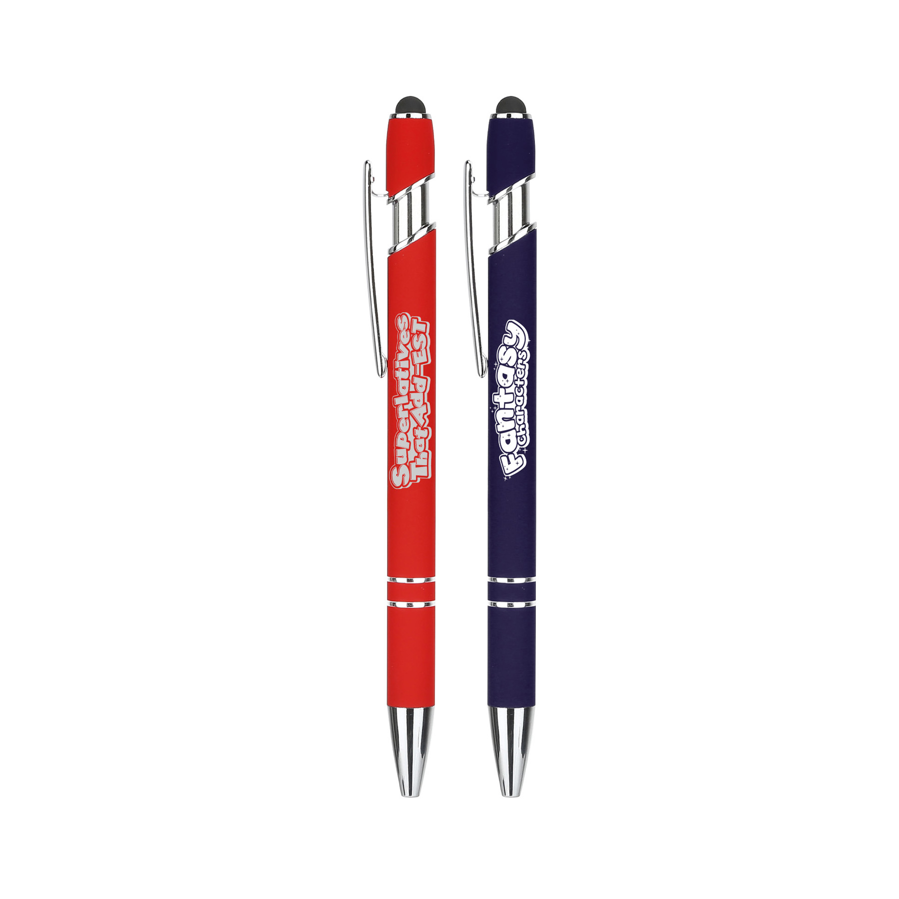 Item#  RO1014 –  This aluminum stylus ballpoint pen features a rubberized grip for comfortable writing and smooth ink flow. Ideal for office use, trade shows, and promotional giveaways, it offers black or blue ink (black default) and a responsive touchscreen stylus tip. Customize with laser engraving or full-color imprint to showcase your logo with lasting brand impact. Get a free quote now!