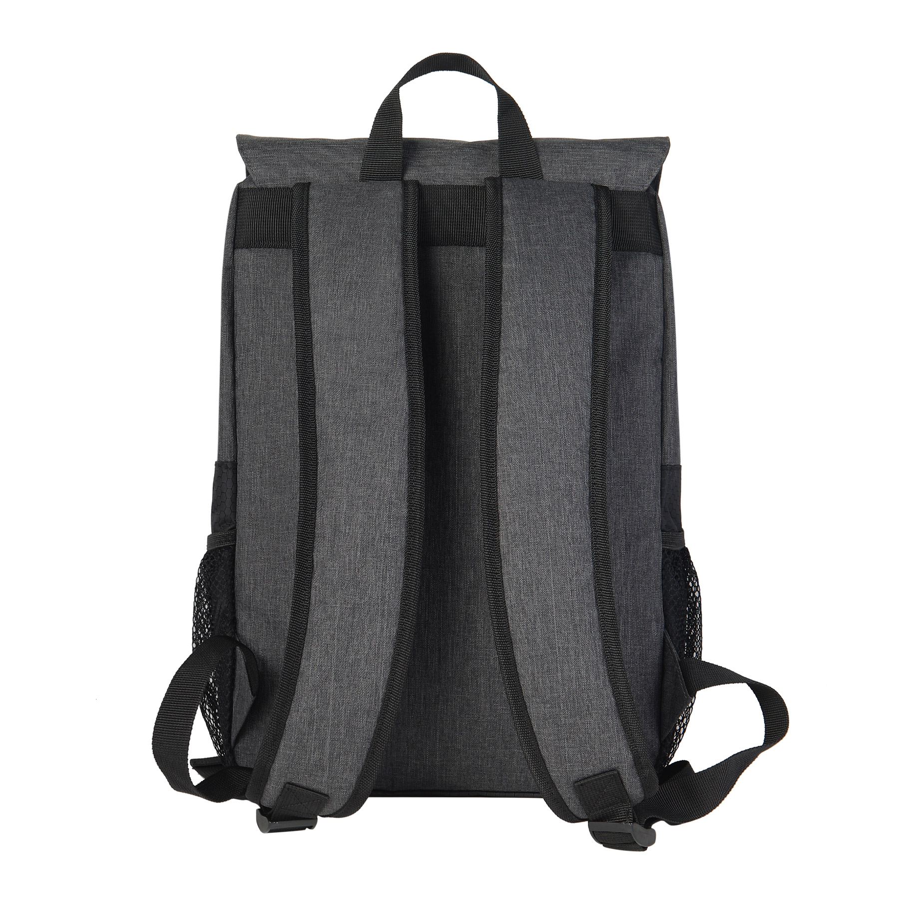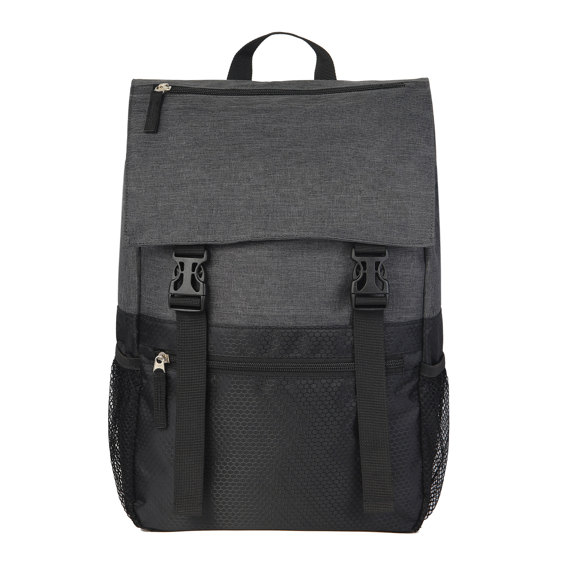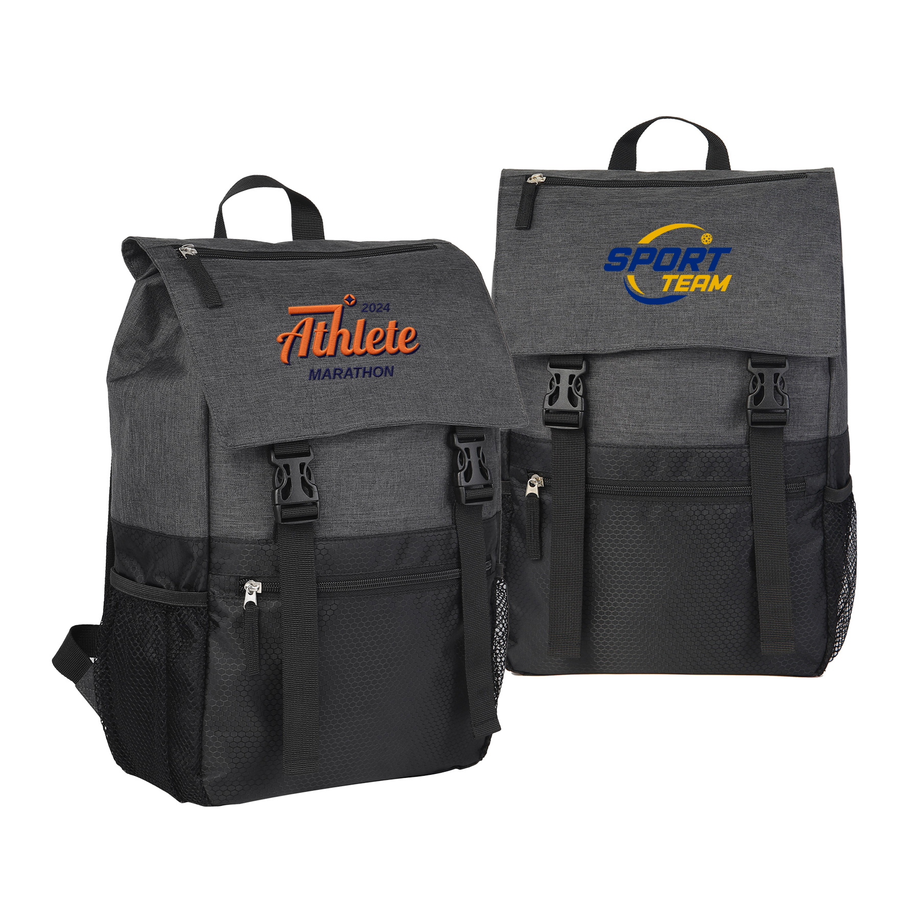 Item# RA1042 –  This personalized rucksack backpack is made from durable 300D heathered polyester. It features an internal padded sleeve that fits laptops up to 15”, ensuring your tech stays safe. The secure plastic buckle closure and flip-over latched main compartment lid provide easy access, complemented by a zippered top pocket that provides extra storage. Two side mesh pockets are ideal for water bottles or umbrellas, while the zippered front pocket keeps your valuables secure. Perfect for hiking, camping, school, or daily use, this backpack combines style with functionality. Get a free quote now!