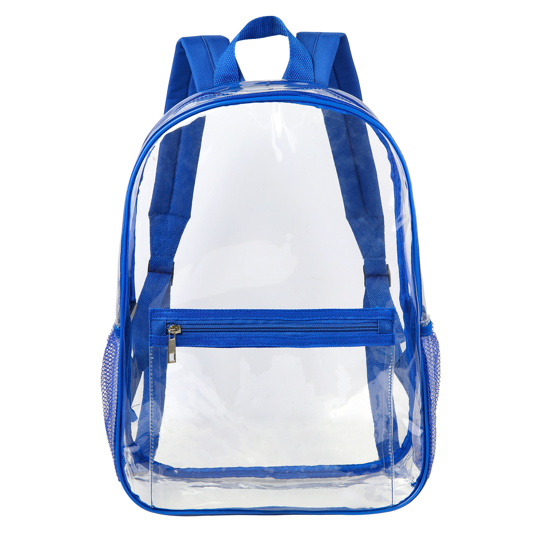 Item# RA1035 –  This clear backpack is made of 0.3mm PVC, perfect for taking to school, group events, sporting venues, and other places where transparent bags are required. The transparent backpack allows complete visibility all round. It could provide a quick check and easy access when passing through security. Moreover, it’s convenient to double-check if there is any missing item before you leave.The front zipper bag and two side mesh pockets also provide easy access to smaller items such as keys, pens, ID cards, sunglasses, cosmetics, snacks, etc. Smooth zipper pullers help a lot. Large main compartment is big enough for notes, pencil case, T-shirts. Being transparent, any logo will stand out as the main attraction when placed on this clear backpack. Get a free quote now!