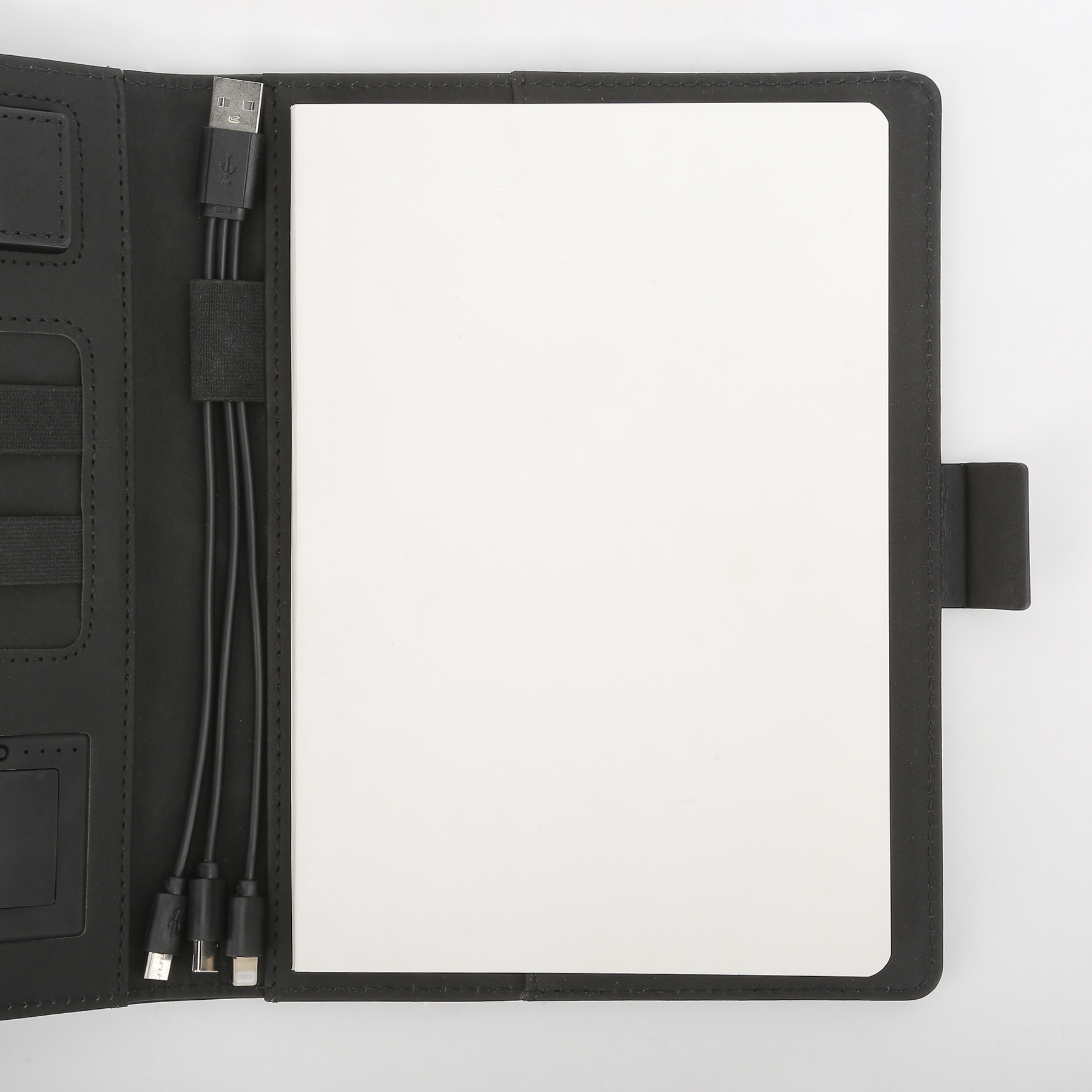 Item# RE1032 –  Enhance your professional experience with the Light-Up Charging Portfolio. Built-in 8,000mAh power bank, it offers both wireless charging (5W) and wired charging (Type-C input/USB-A output: 5V/2A). The included 3-in-1 charging cable ensures compatibility with most devices. This sleek portfolio features a 56-sheet notebook (5.56 x 8.14”), an adjustable stand, a customizable LED light-up logo, and multiple organizational compartments, all secured with a magnetic clasp, perfect for daily use. Get a free quote now!