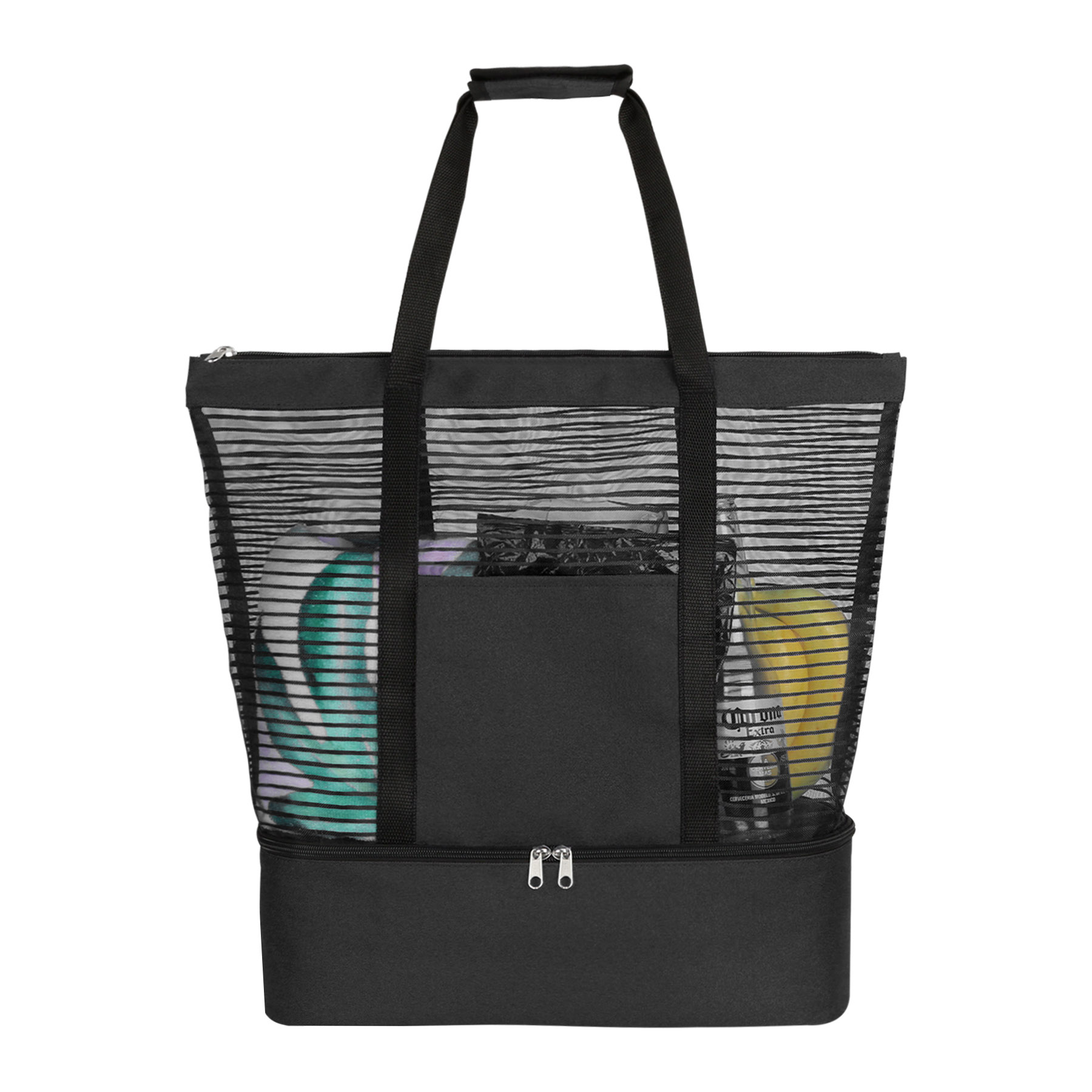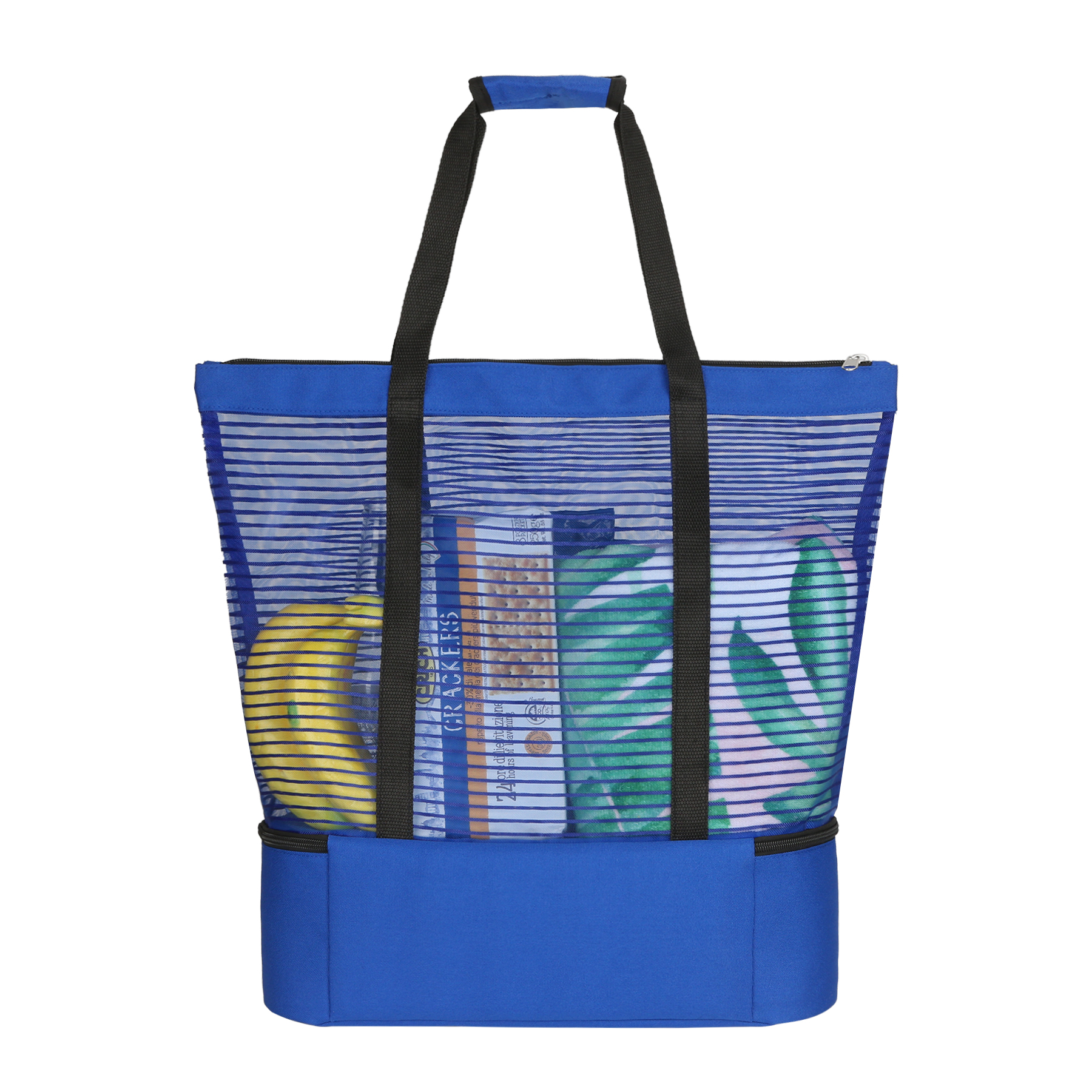 Item# R 183 –  This mesh tote bag is the perfect companion for a day at the beach. Crafted from durable 600D polyester and premium stripe mesh, it features a spacious zippered compartment that conveniently holds all your essentials. The insulated zippered cooler compartment below is lined with PEVA insulation to keep food and drinks cool for hours, so you can enjoy refreshing beverages and snacks while soaking up the sun. An exterior front pocket offers easy access to sunscreen and other frequently used items. Designed with a comfortable dual carrying handle and a lightweight structure, this bag combines easy portability with lasting durability. Ideal for beach outings, picnics, and day trips, it helps keep your refreshments cool and organized throughout the day. Get a free quote now.