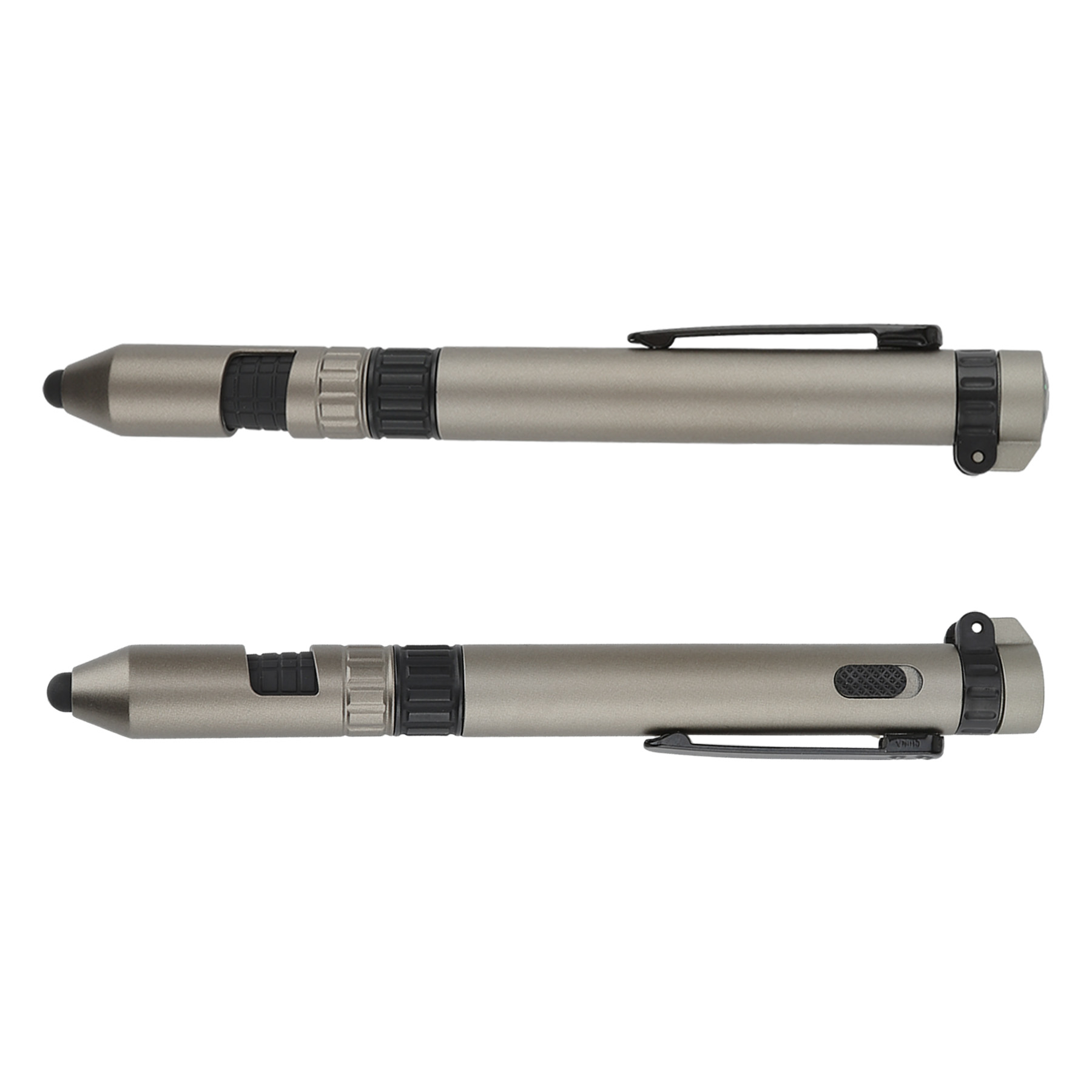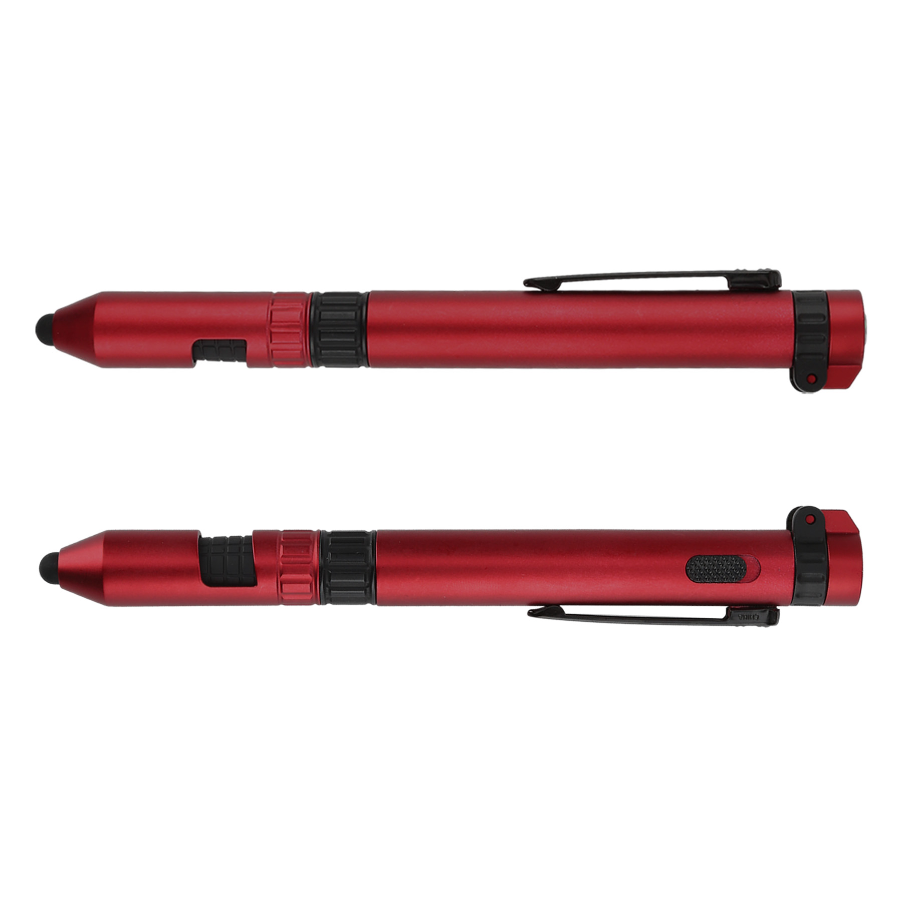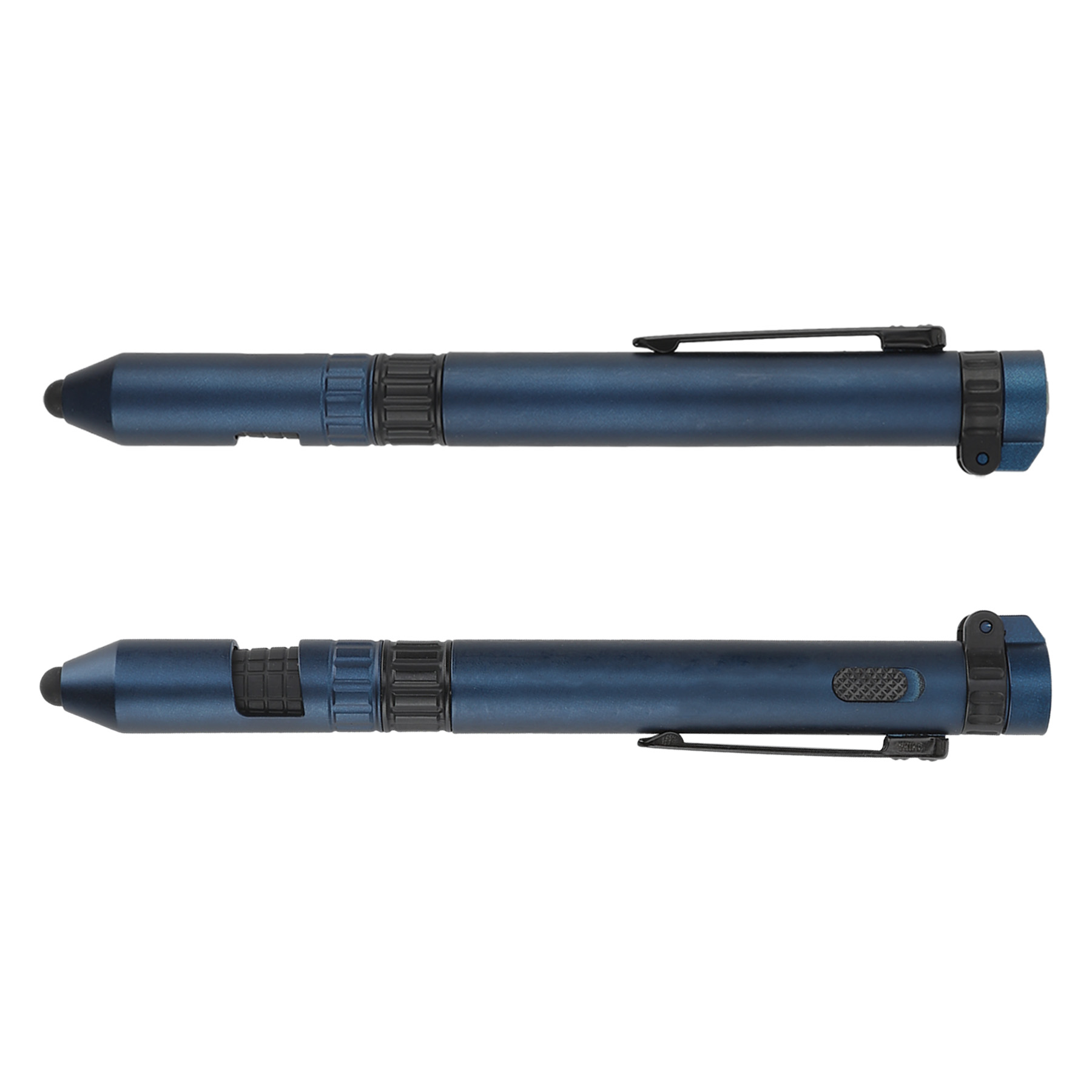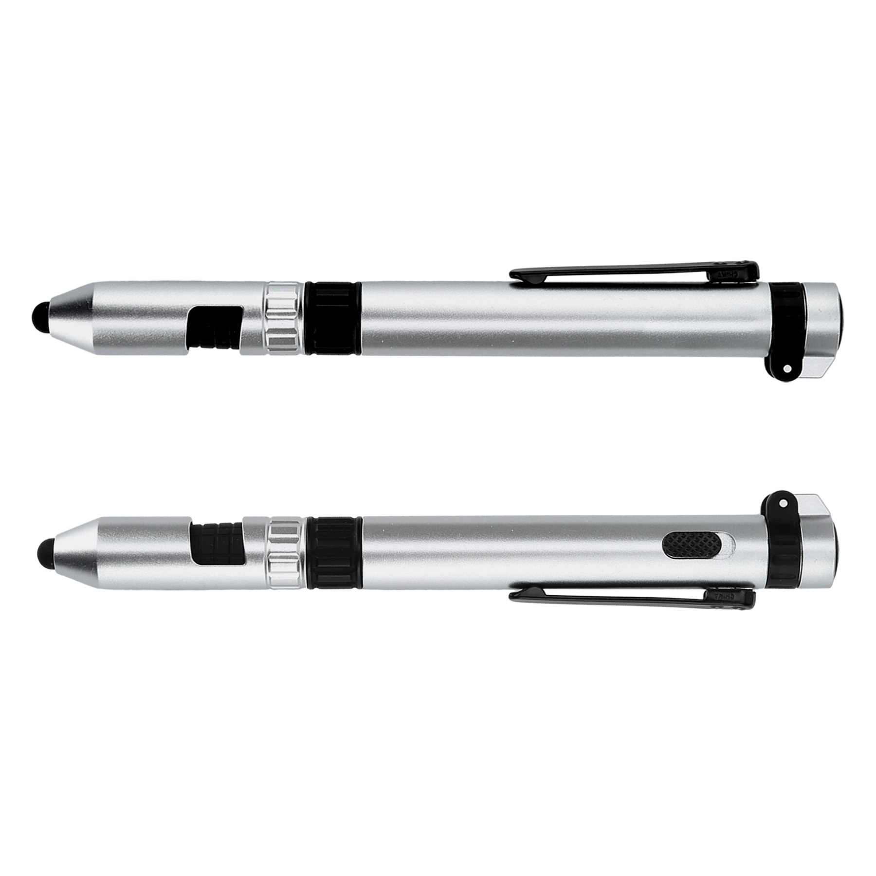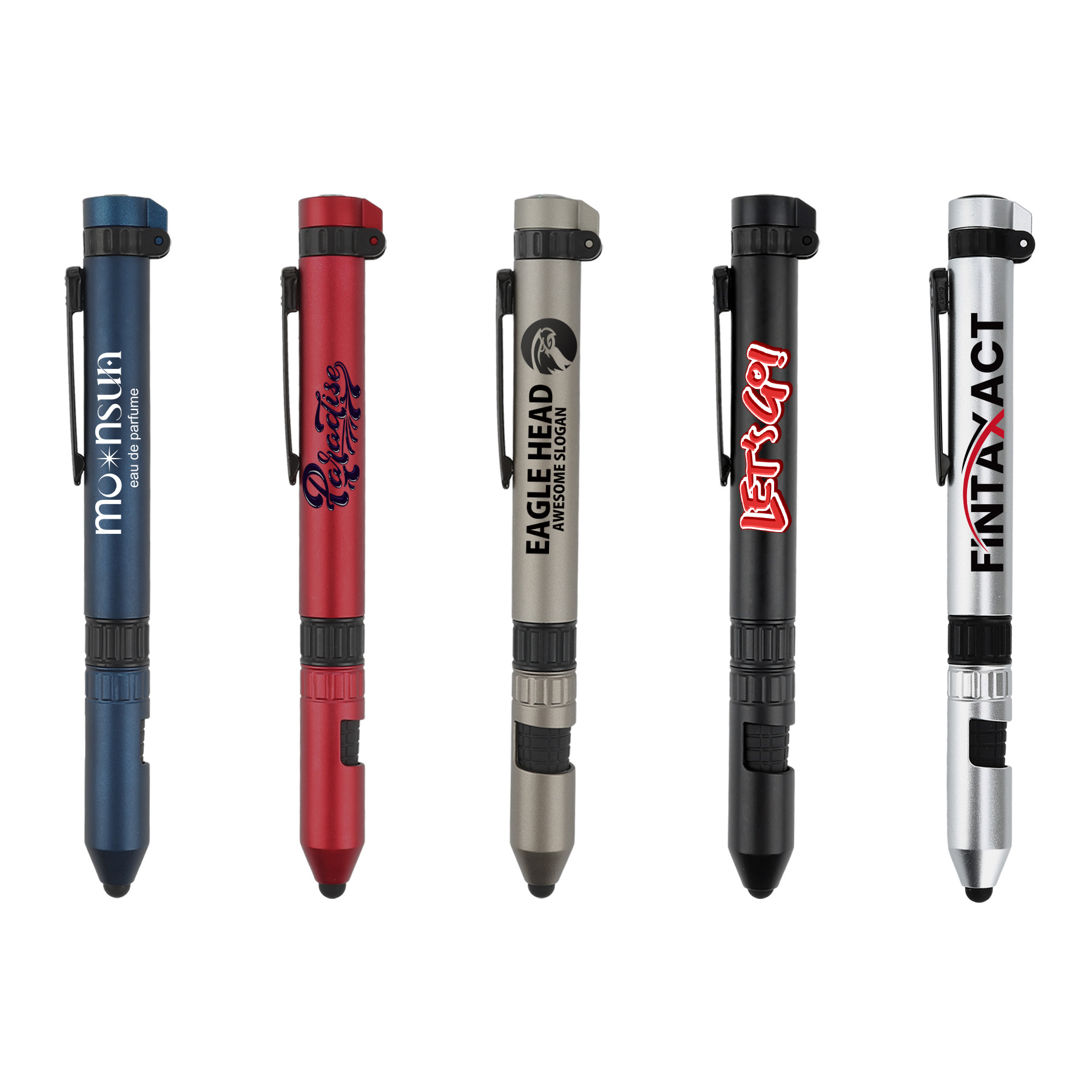 Item#  RO1017 –  This 7 in 1 multi-functional tool pen is made of good quality ABS plastic material. It has a ballpoint pen, a capacitive stylus touch screen pen, a flashlight LED light, a compass, a phone stand, a Phillips cross head and a flat slot head screwdriver. Blue or black ink, black ink default. It is a great design for writing. Get a free quote now!