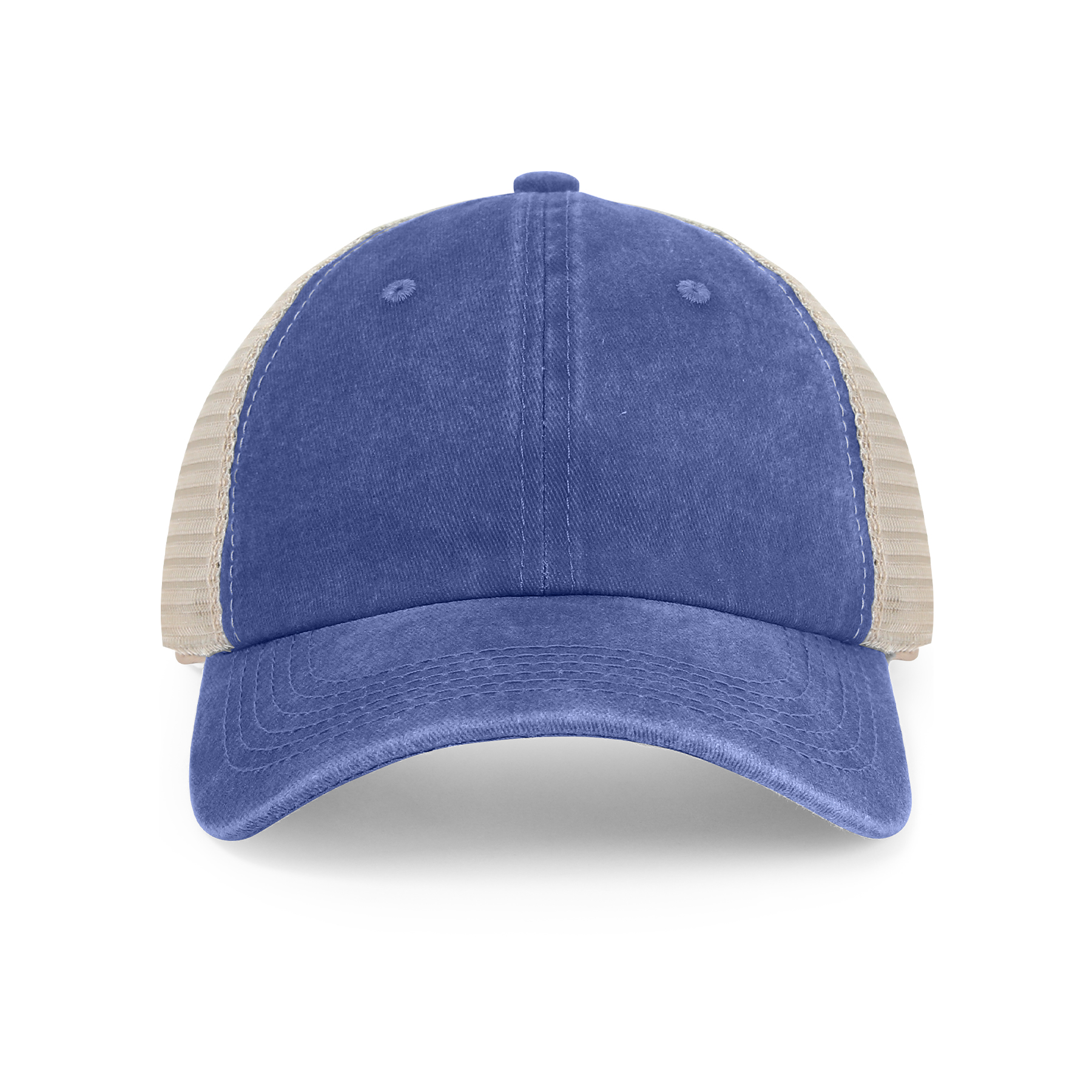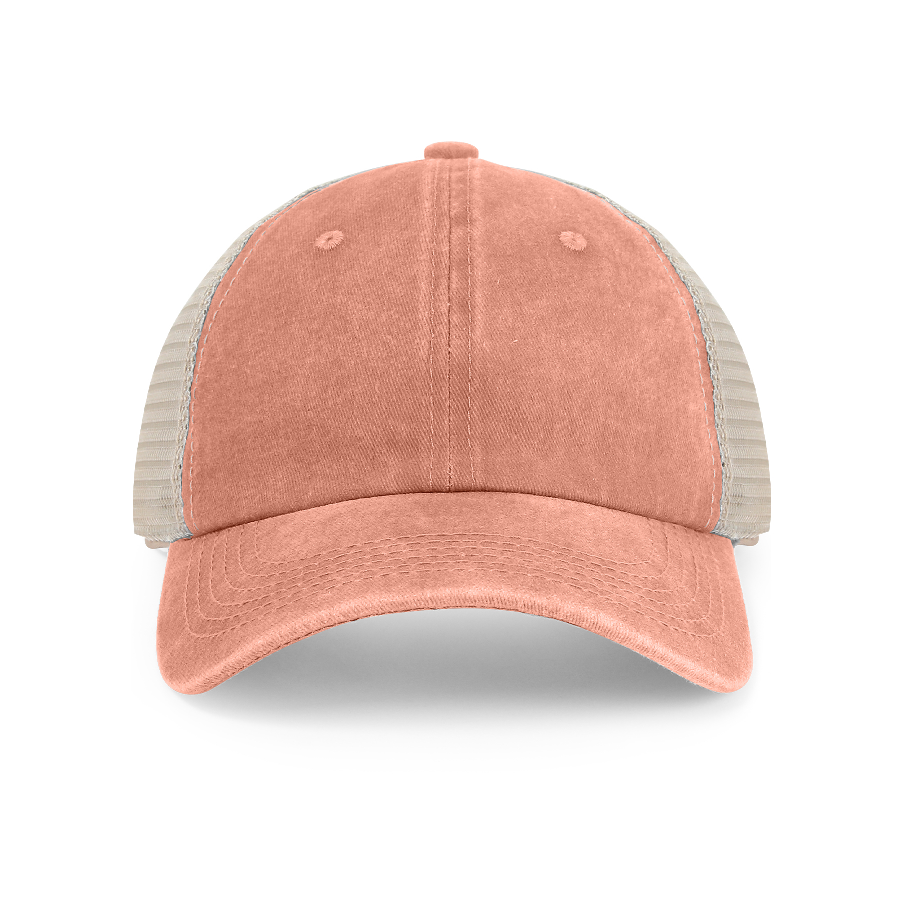 Item#  RC1042 –  This six-panel trucker cap is made of washed pigment dyed cotton with an unstructured design, a soft and airy mesh back and D-ring metal buckle closure. . One size fits most. Add your school, sports team, organizational or company logo or message to customize. This classic style cap will go great with anything on a sunny summer day! Get a free quote now!