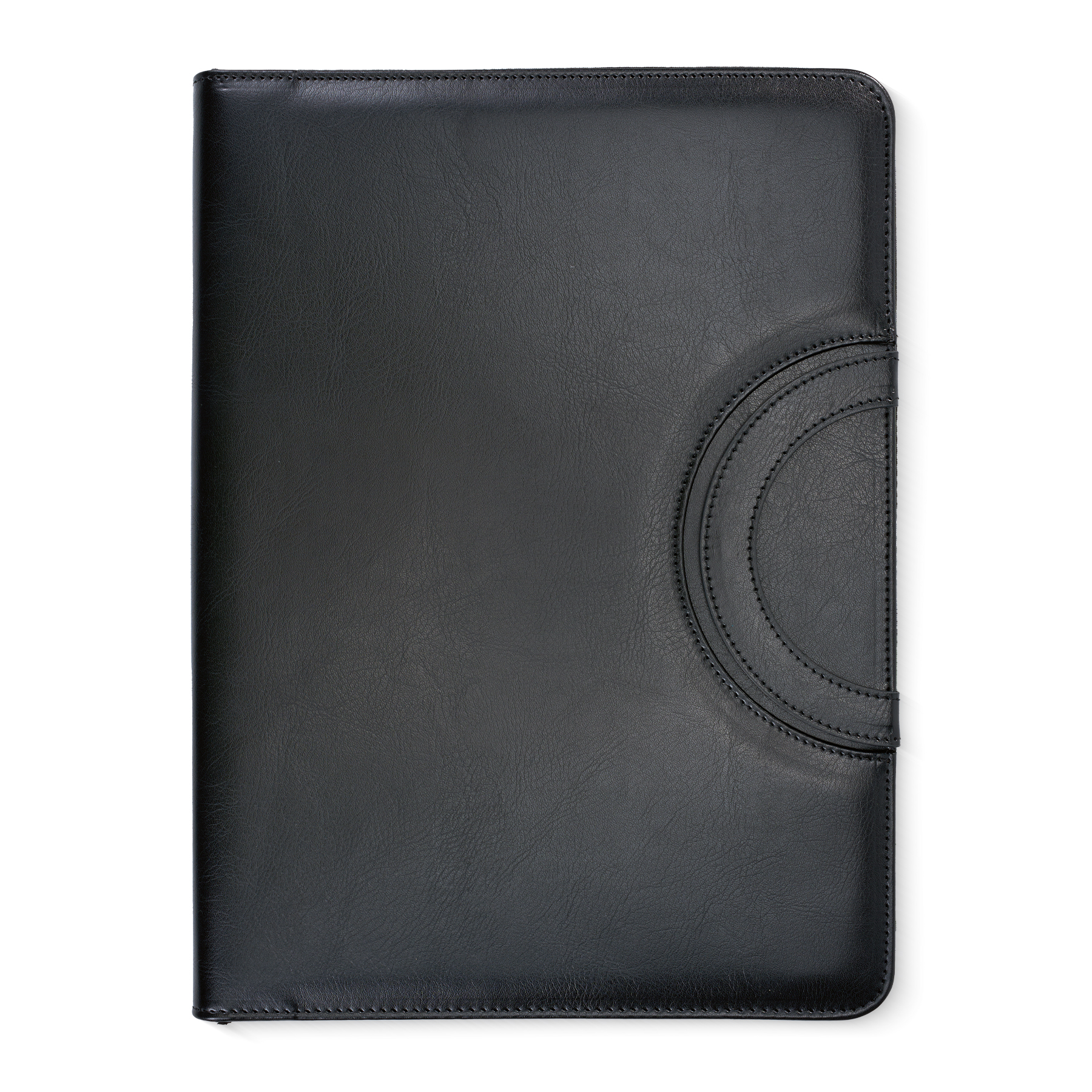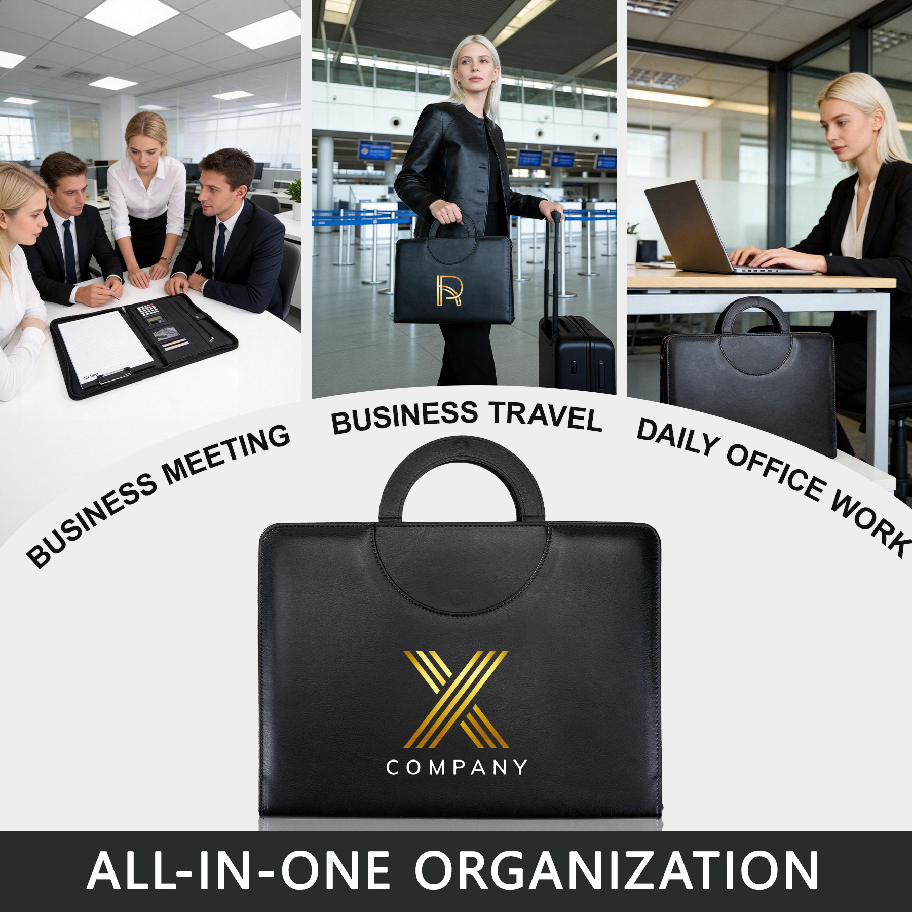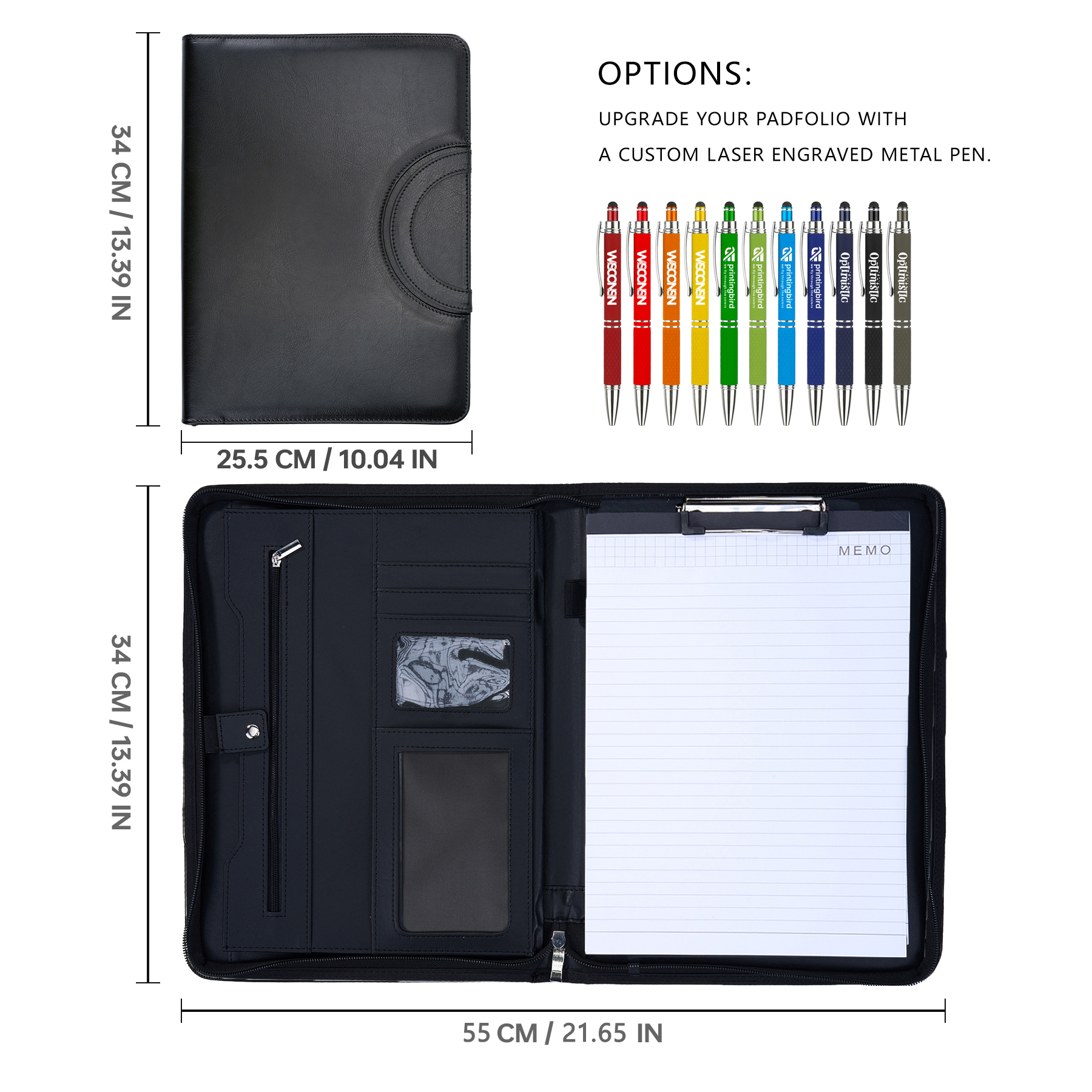 Item#  RO1035 –  Make a lasting impression with this deluxe executive zippered padfolio, designed to keep professionals organized and presentation-ready. Crafted from durable simulated leather, this padfolio delivers a sleek, professional look with practical, everyday functionality. The interior features a multi-pocket organizer with a curved exterior pocket, slash pocket, business card slots, pen loop, and secure zippered storage (Excluding the calculator). It includes a full-size 8.5″ x 11″ writing pad and also accommodates A4 paper, making it ideal for meetings, conferences, interviews, and corporate events. The full zipper closure keeps documents and essentials protected while on the move. Perfect for debossed or full-color custom logos to promote your brand. Get a free quote now!
