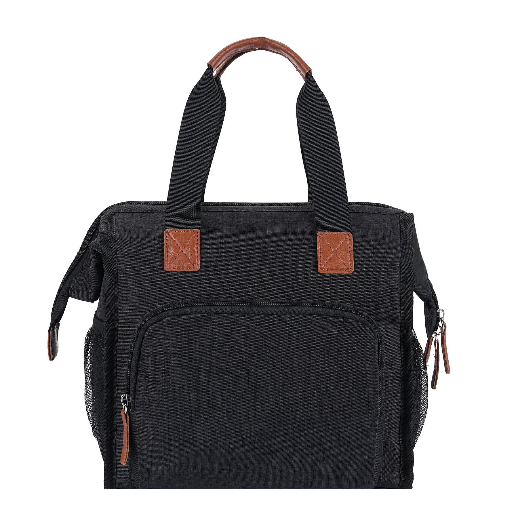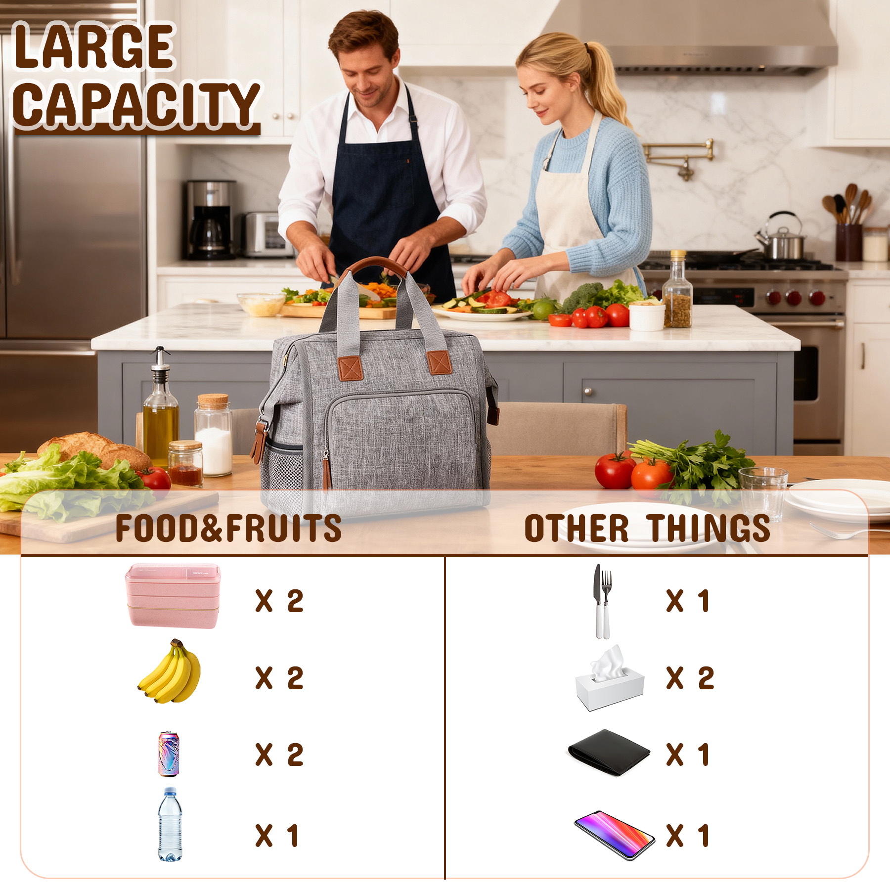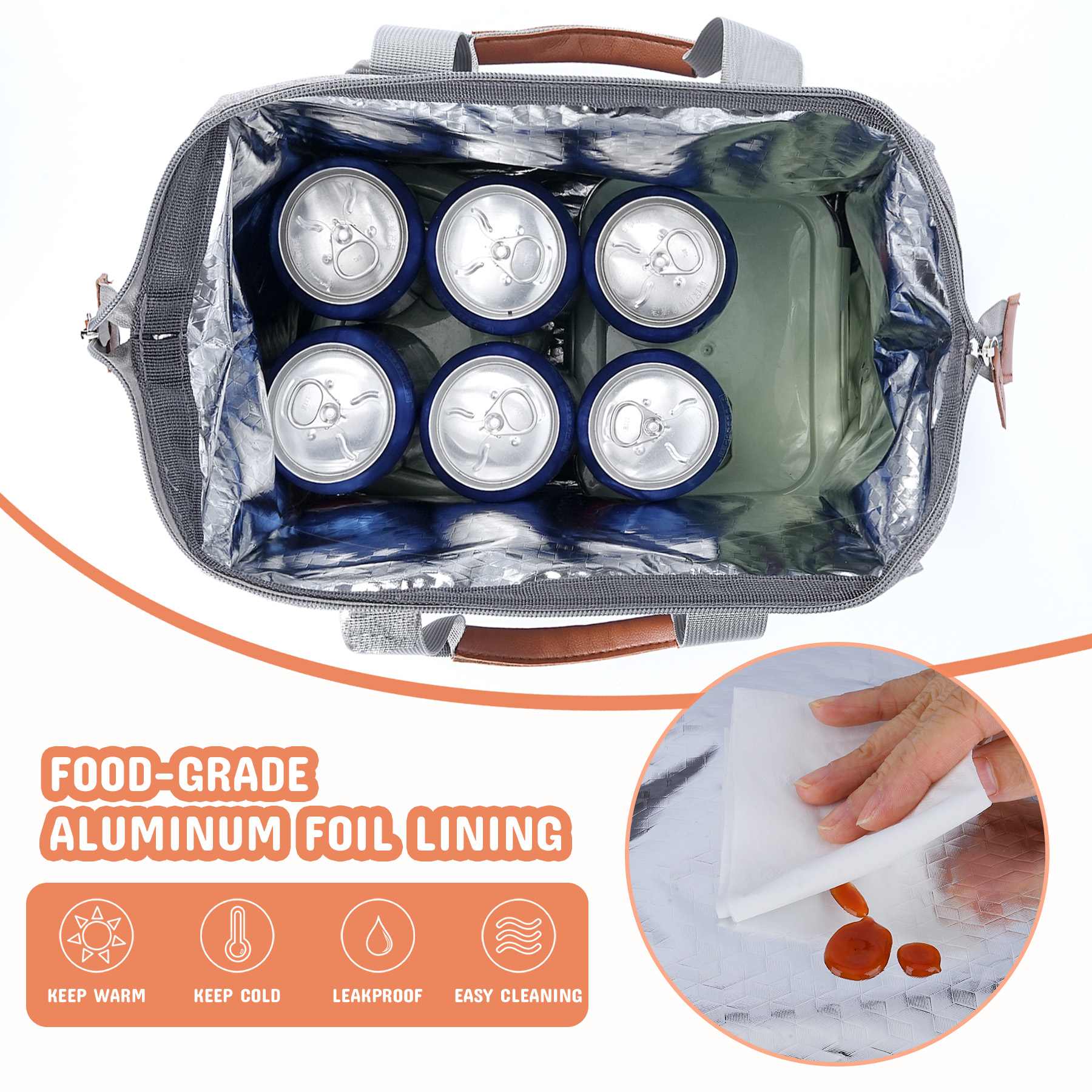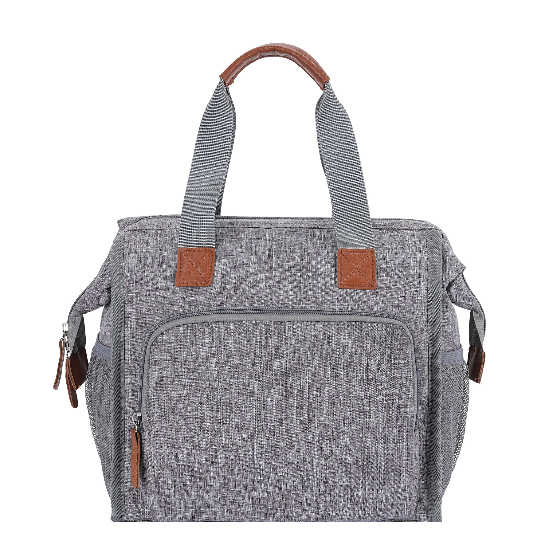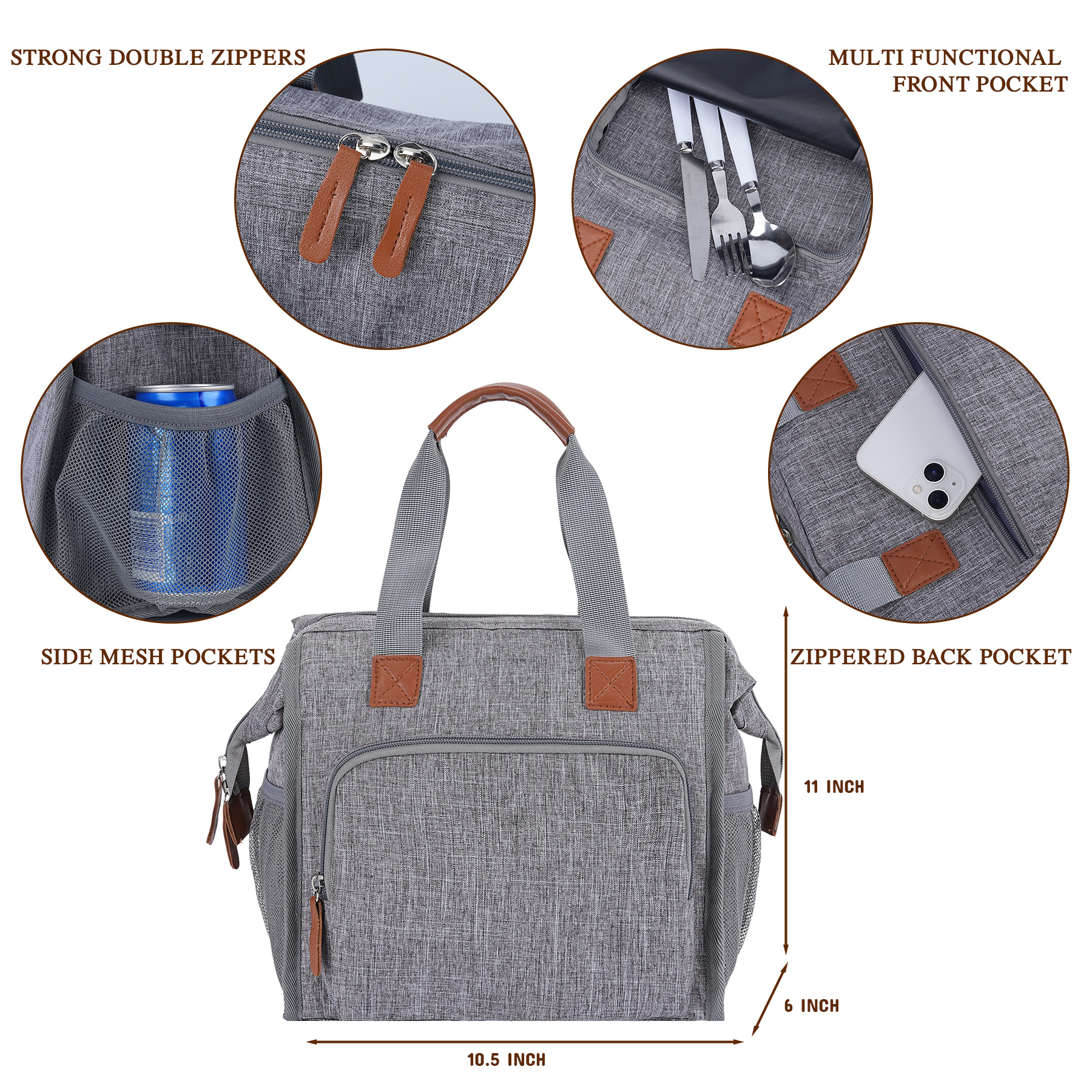Item# RA1146 –  Made from durable, high-quality fabric with a food-grade aluminum foil lining and thick insulation, this insulated lunch bag keeps food hot or cold for hours. The non-toxic, heat-resistant lining will not melt when holding hot meals and is easy to wipe clean. The wide-open, dual-zipper top allows full access to the main compartment, making it easy to place and remove containers horizontally without tipping or spilling. This design also improves visibility, organization, and cleaning convenience. Featuring a spacious main compartment for meals and drinks, the bag includes front and back zippered pockets for personal items and two side mesh pockets ideal for water bottles or small essentials. Reinforced handles, heavy-duty stitching, and a comfortable hand grip ensure durability and easy carrying. Customization and embroidery are available, with two-sided imprint areas for enhanced brand visibility. Get a free quote now!