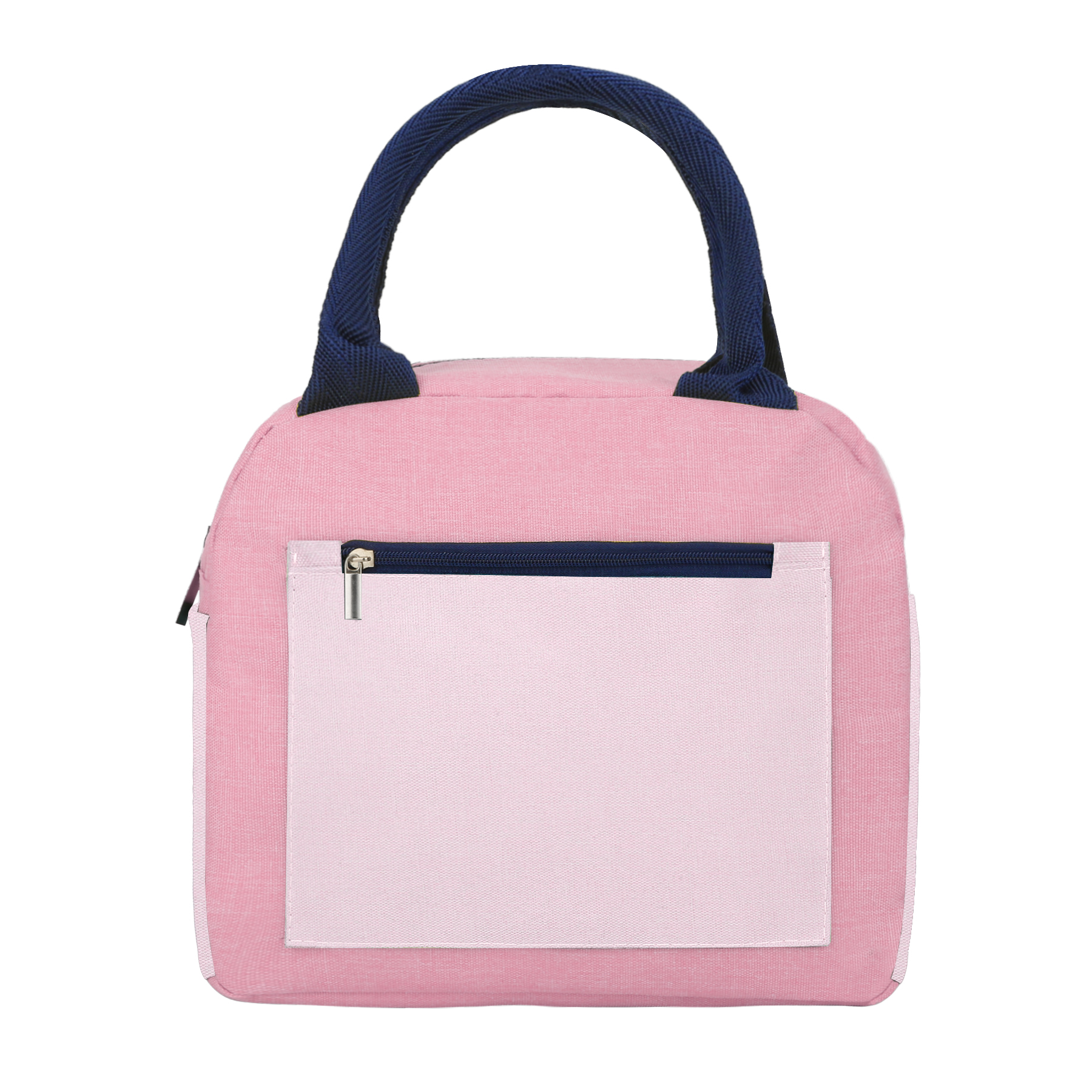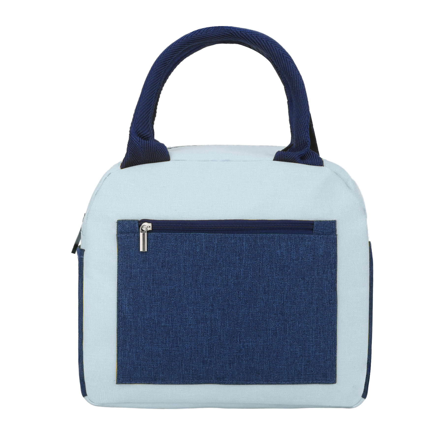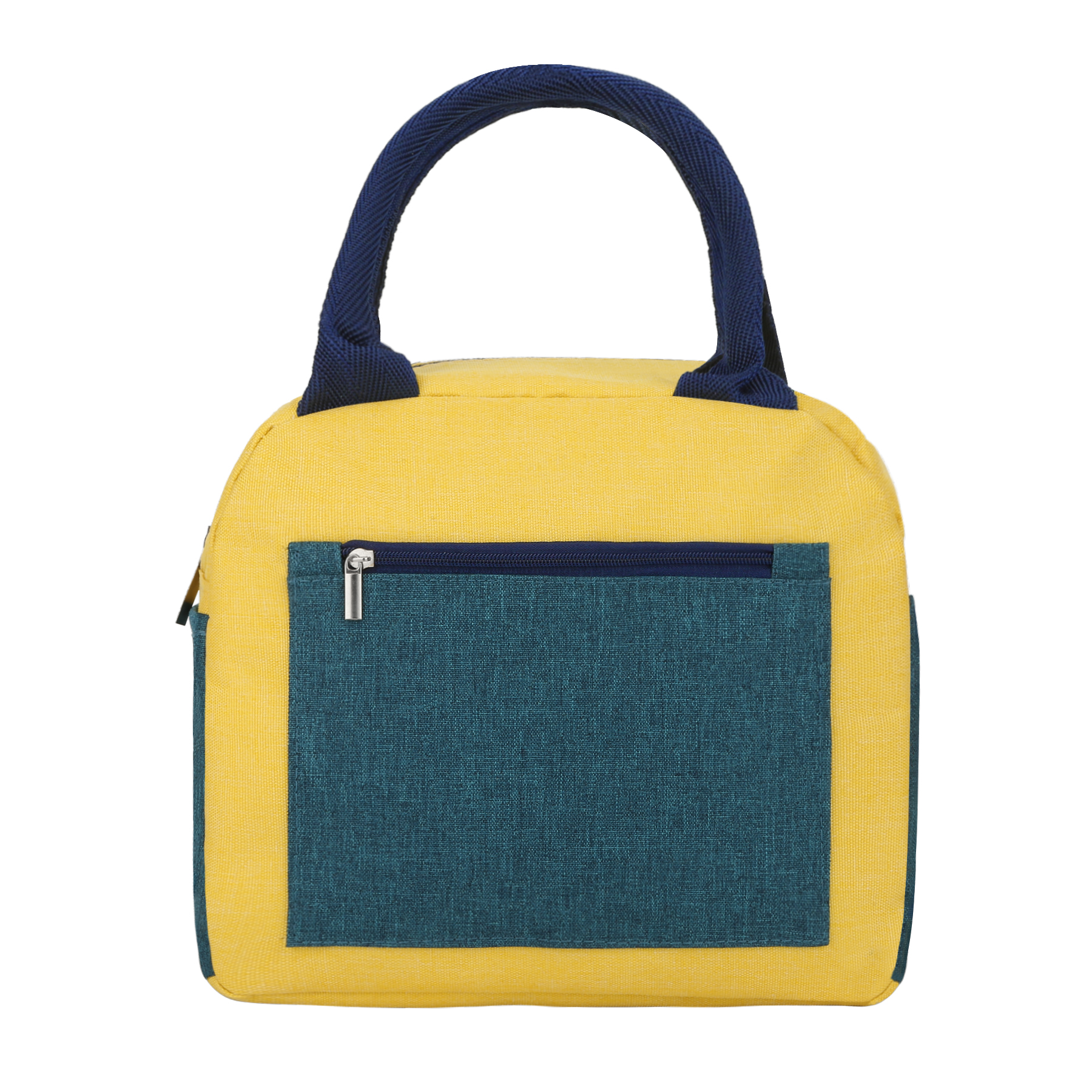 Item# RA1160  –  This lunch bag stands out from the crowd with the eye-catching color blocking design. The combination of vibrant colors adds a touch of style and personality to your lunchtime routine. Made with durable heathered polyester with an easy-to-clean aluminum foil lining, it keeps your food and drinks at the perfect temperature for hours. Two side pockets and a front zippered pocket offer extra storage for utensils, napkins, or small essentials. It has ample room for your lunch, drinks, and snacks, designed to accommodate all your on-the-go food needs. The sturdy handles ensure comfortable carrying, making it suitable for work, travel, beach outings, picnics, parties, and school use. It’s the perfect companion for your active lifestyle, providing you with convenience and style wherever you go. Get a free quote now!