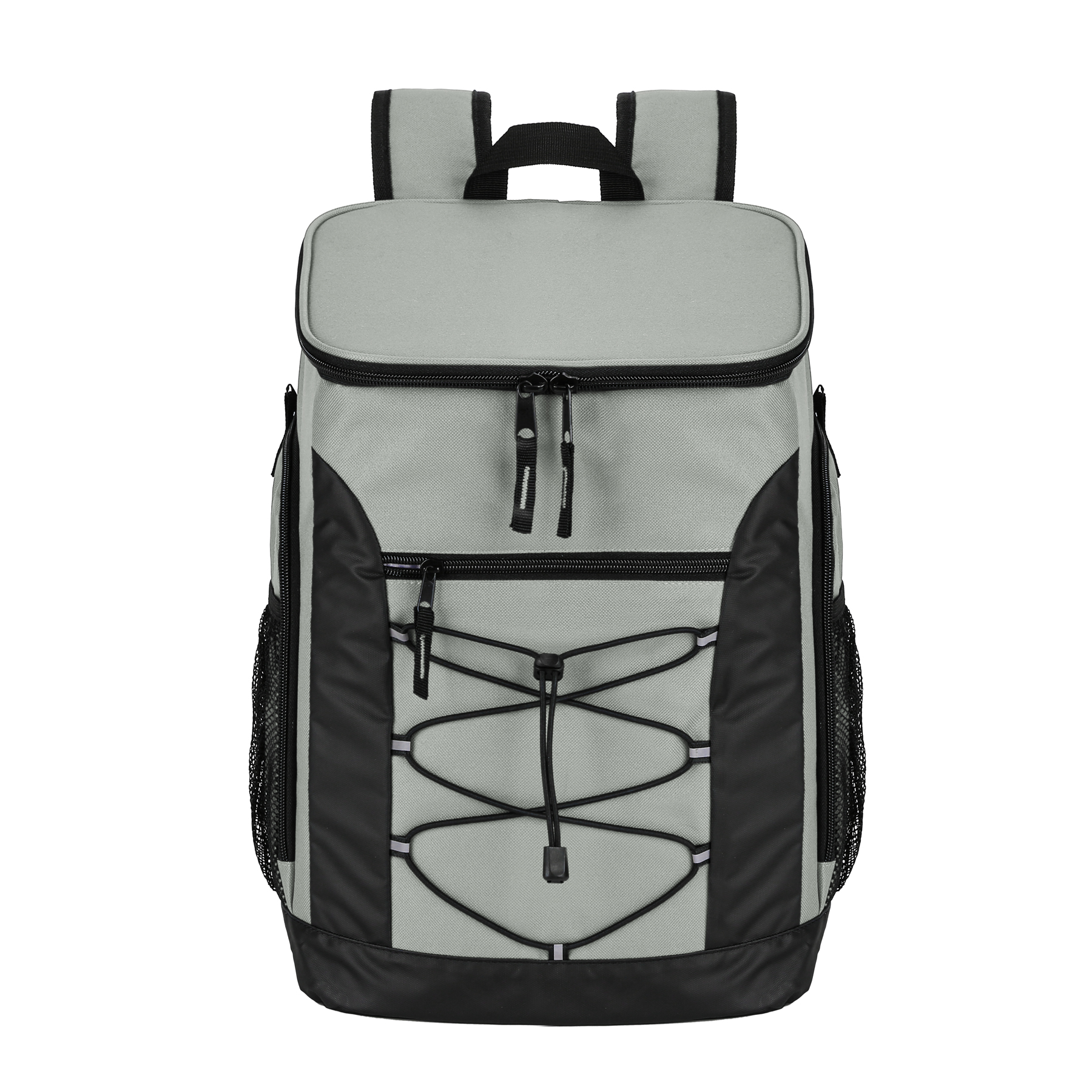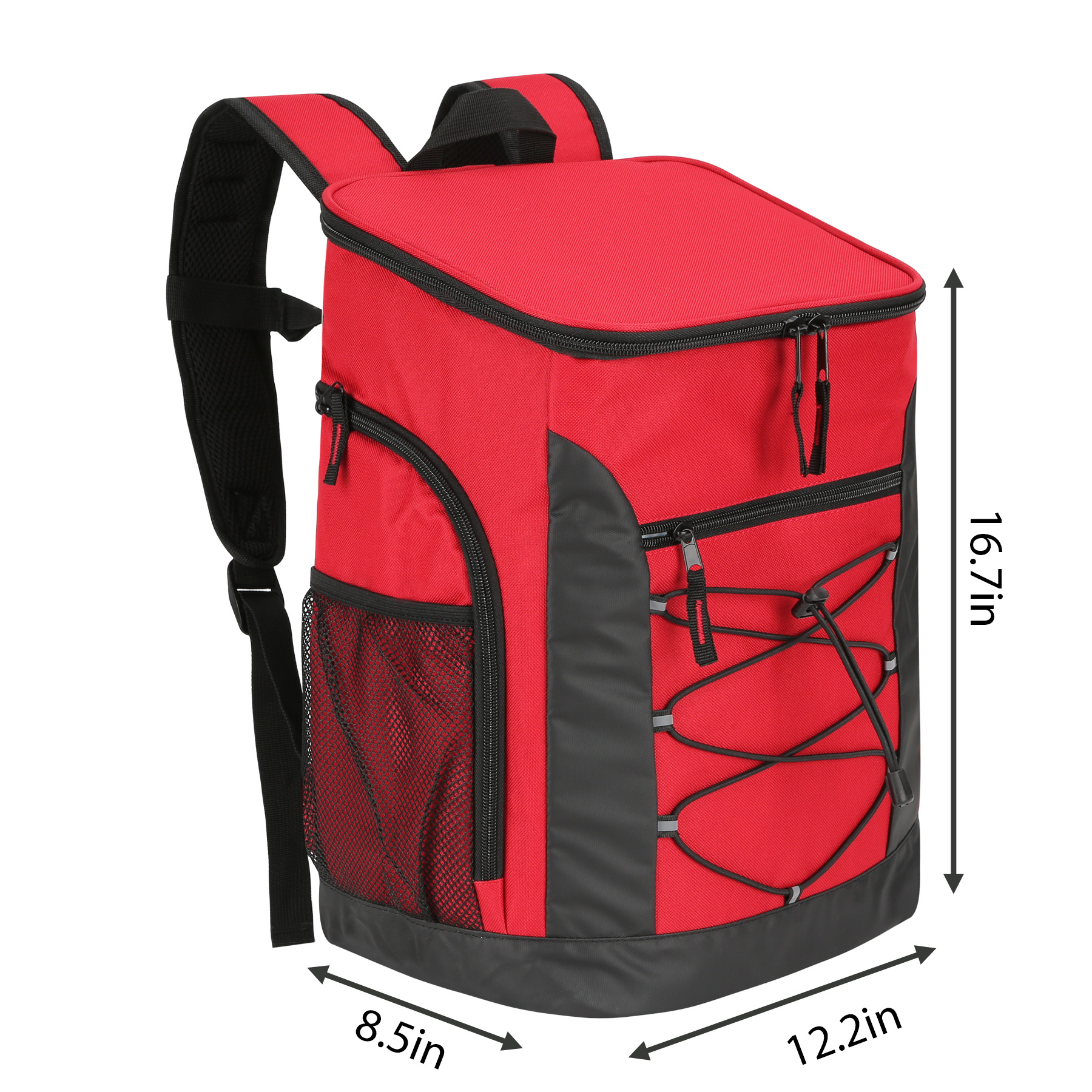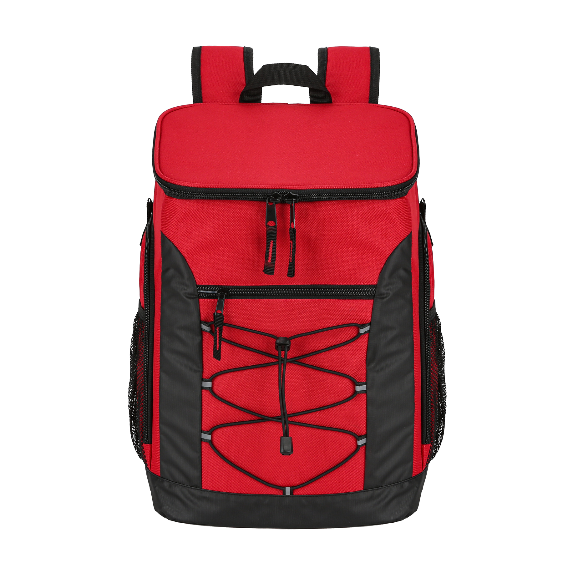 Item# RA1187  –  This Super Cool Backpack Cooler is constructed from heavy-duty polyester and features a high-density insulated interior. The leak-proof liner is made of FDA-approved food-safe material, ensuring your food and drinks stay protected. With ample space to keep items cold for up to 24 hours, this backpack can comfortably carry loads of up to 30 pounds. It includes a large front zippered pocket for snacks, plates, or personal belongings, along with mesh side pockets for quick access and insulated side pockets designed to hold water bottles. The top lid also contains an interior mesh pocket for utensils. Equipped with padded shoulder straps and a breathable back panel, the backpack offers maximum comfort even when fully loaded. The shoulder strap comes with a built-in bottle opener and a chest buckle for added convenience. An elastic cord at the front is perfect for securing clothes or blankets. The product is available in multiple colors and supports customization and embroidery. Get a free quote now!