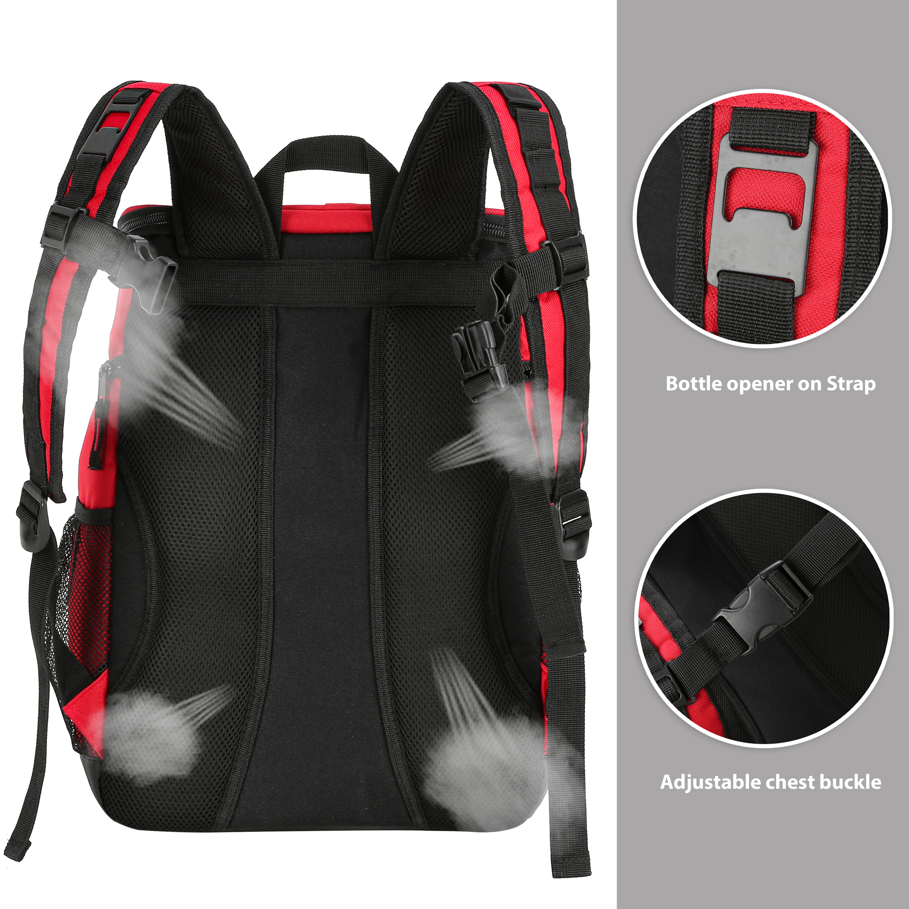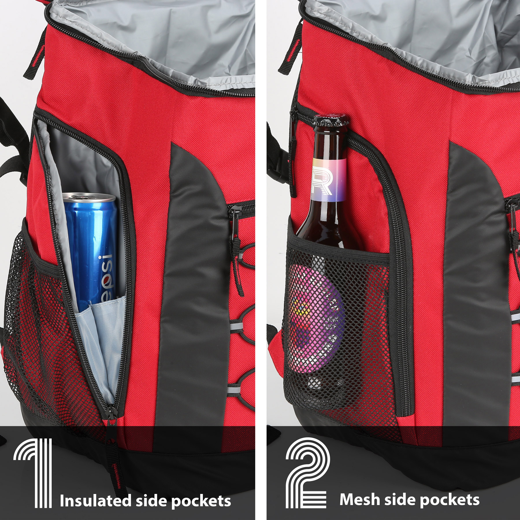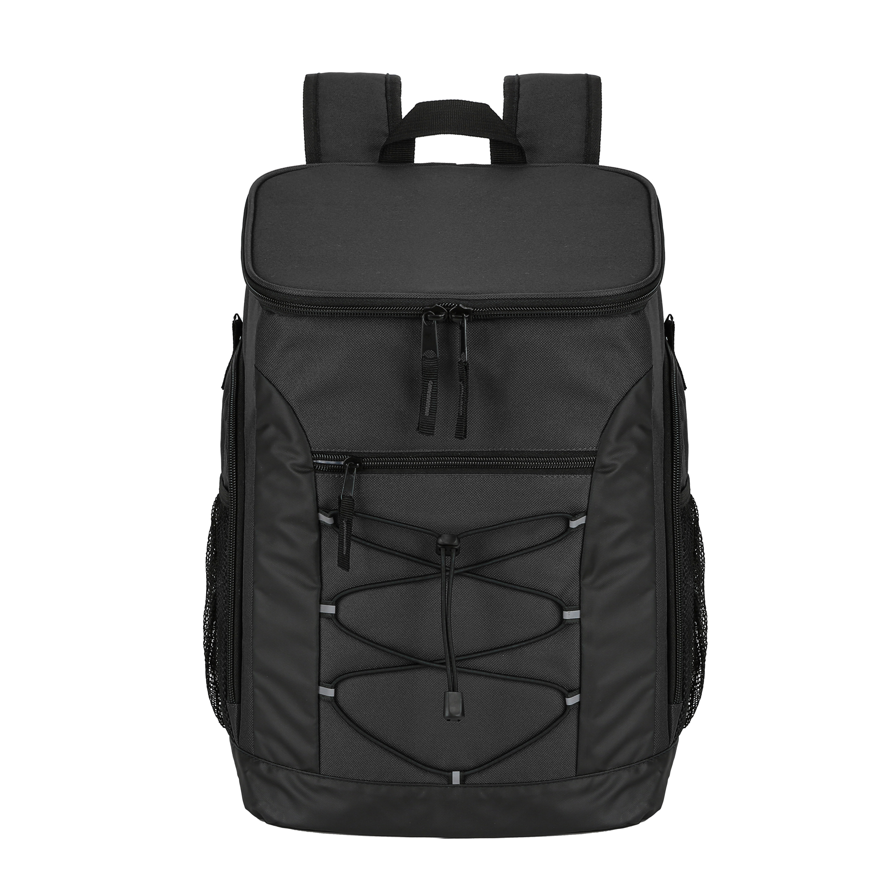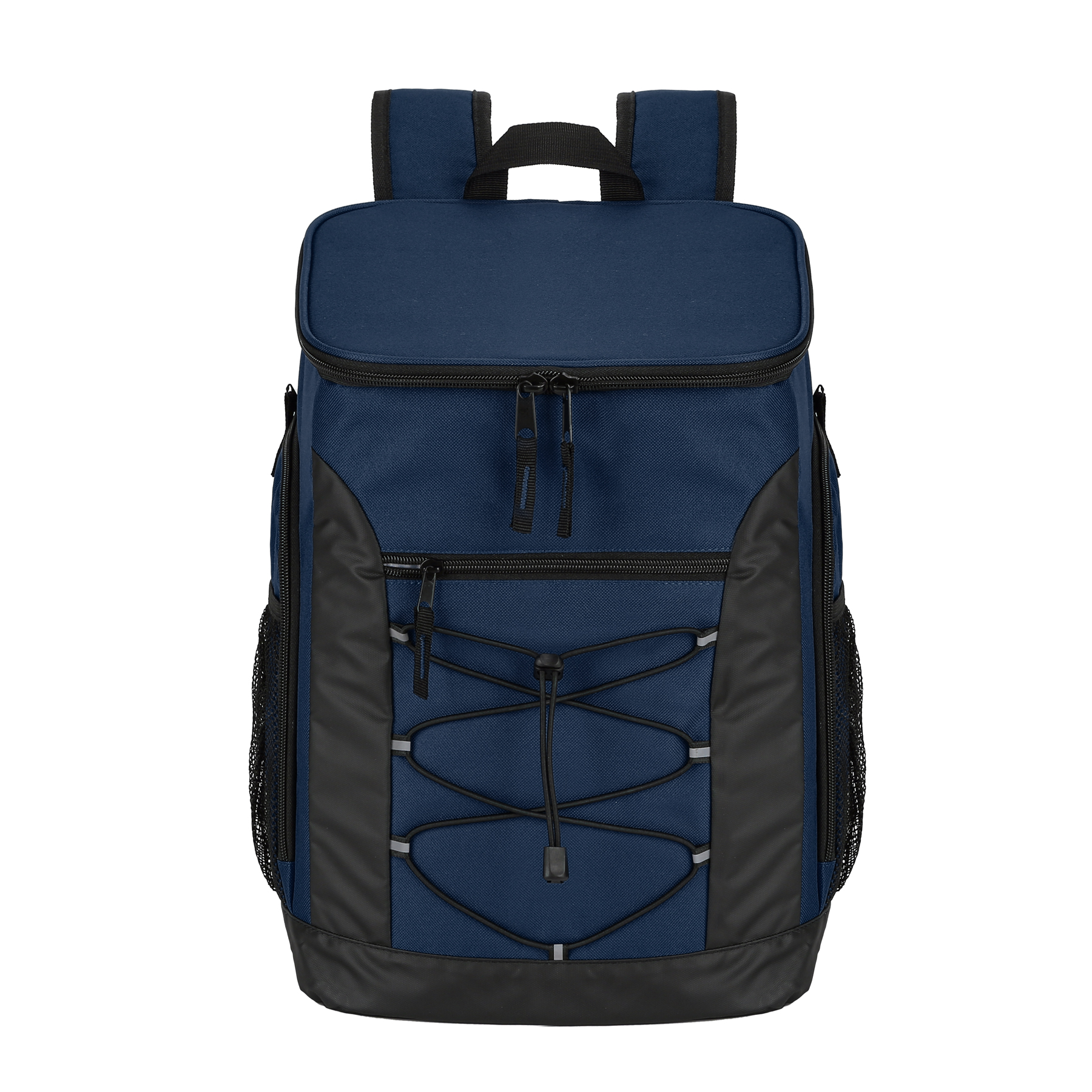 Item# RA1187  –  This Super Cool Backpack Cooler is constructed from heavy-duty polyester and features a high-density insulated interior. The leak-proof liner is made of FDA-approved food-safe material, ensuring your food and drinks stay protected. With ample space to keep items cold for up to 24 hours, this backpack can comfortably carry loads of up to 30 pounds. It includes a large front zippered pocket for snacks, plates, or personal belongings, along with mesh side pockets for quick access and insulated side pockets designed to hold water bottles. The top lid also contains an interior mesh pocket for utensils. Equipped with padded shoulder straps and a breathable back panel, the backpack offers maximum comfort even when fully loaded. The shoulder strap comes with a built-in bottle opener and a chest buckle for added convenience. An elastic cord at the front is perfect for securing clothes or blankets. The product is available in multiple colors and supports customization and embroidery. Get a free quote now!