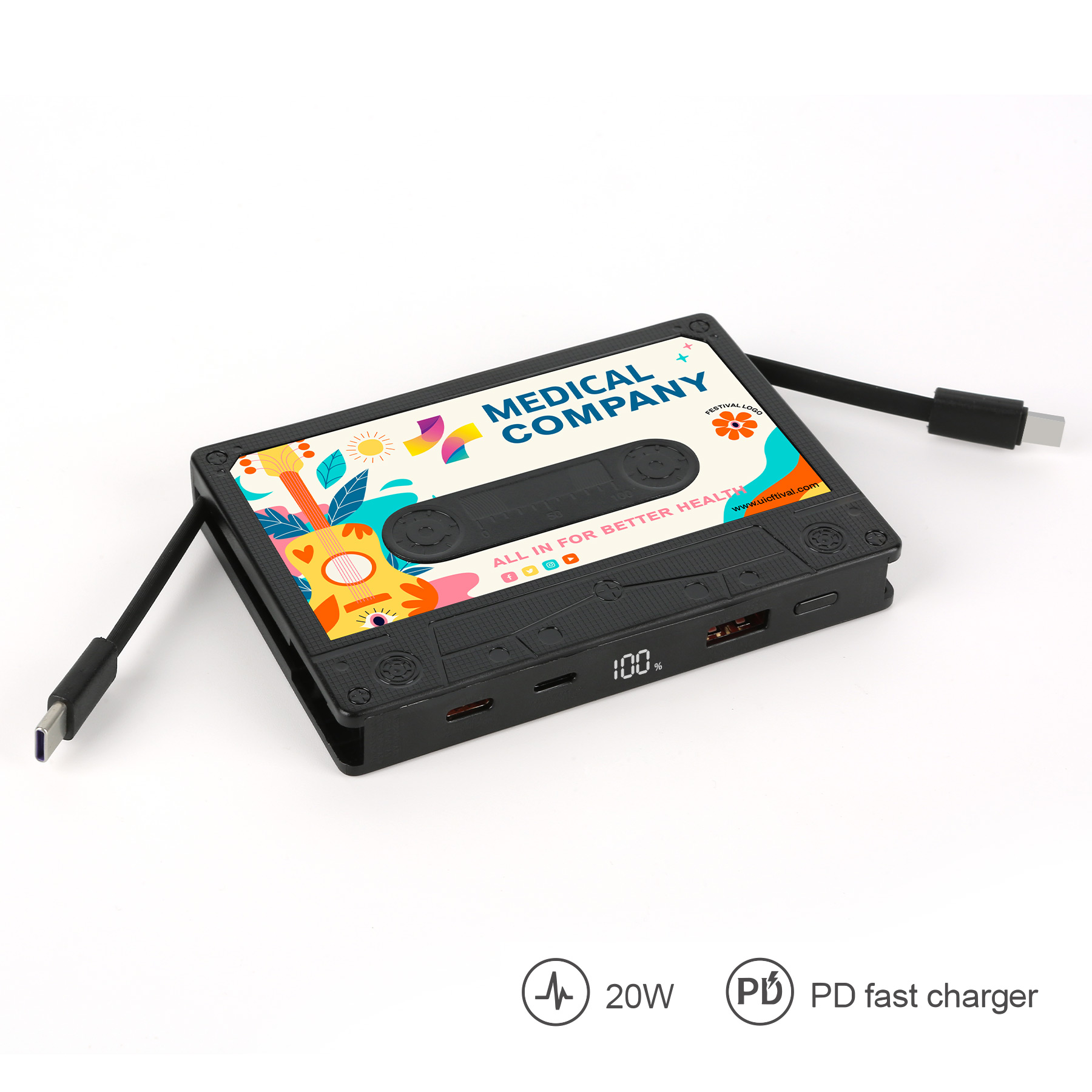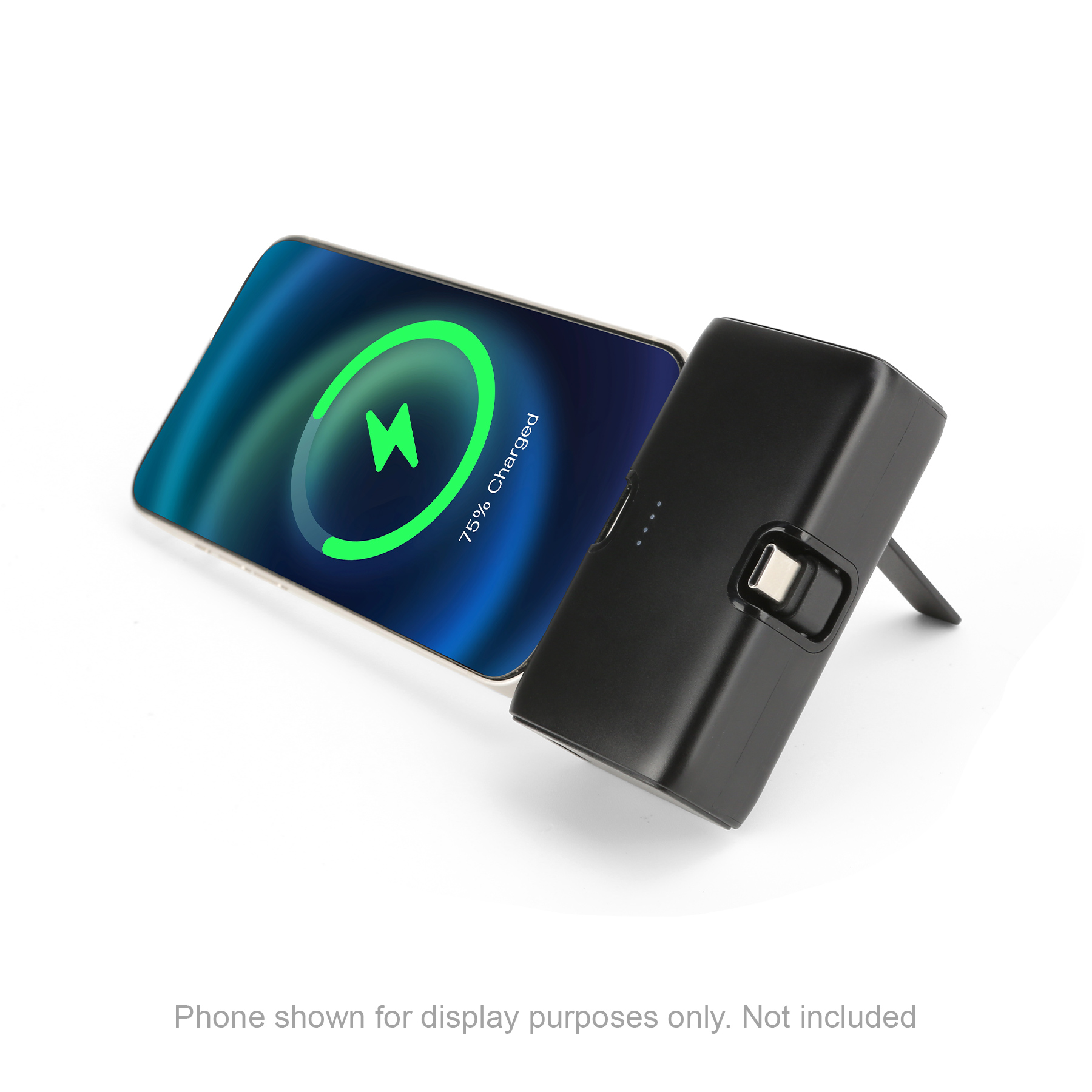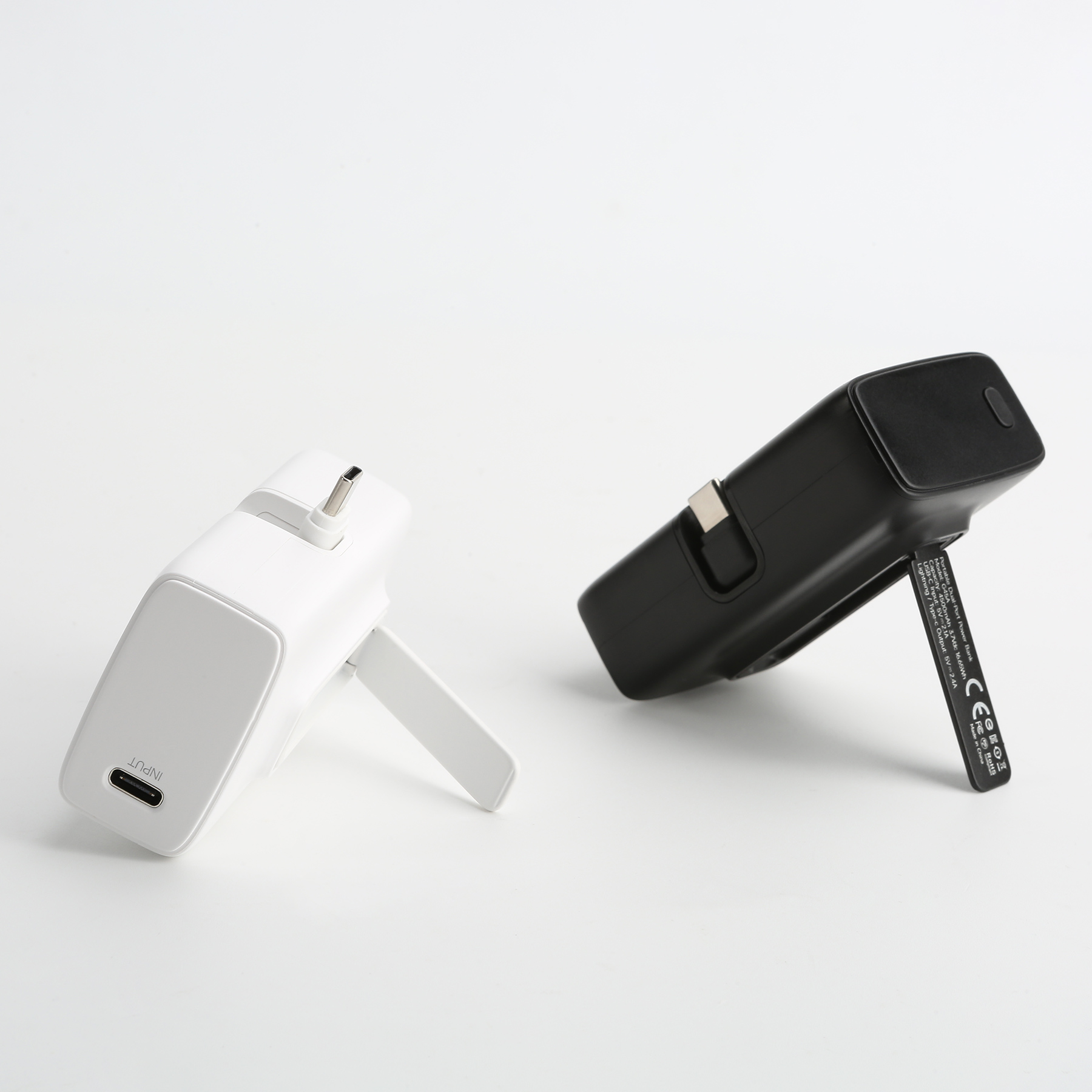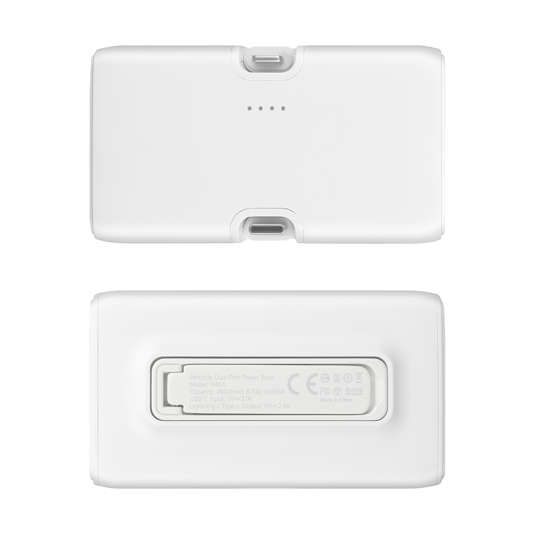 Item# RE1037 –  Stay powered on the go with our travel-friendly 4,500mAh power bank, featuring two integrated connectors and a built-in phone stand for tangle-free charging. Capacity: 4,500 mAh; Input (Type C): 5V/2.1A; Output (Type C & 8-Pin Compatible): 5V/2.4A. Built to last, it has passed 10,000 folding tests and uses UL2056-tested A-grade batteries for safety. Available in black and white, it offers a large print area ideal for UV full-color printing—perfect for promotional gifts. Get a free quote now!