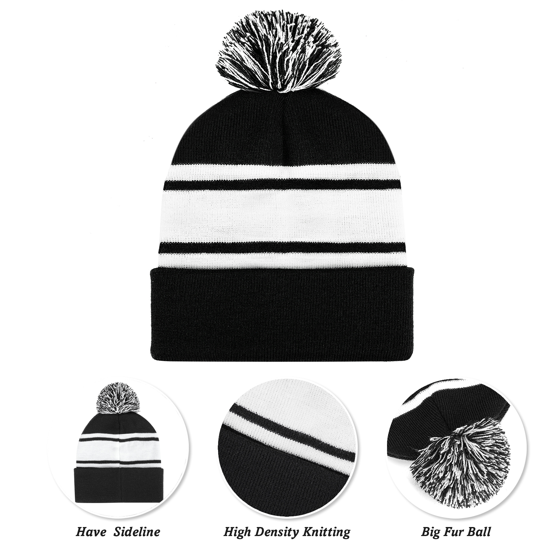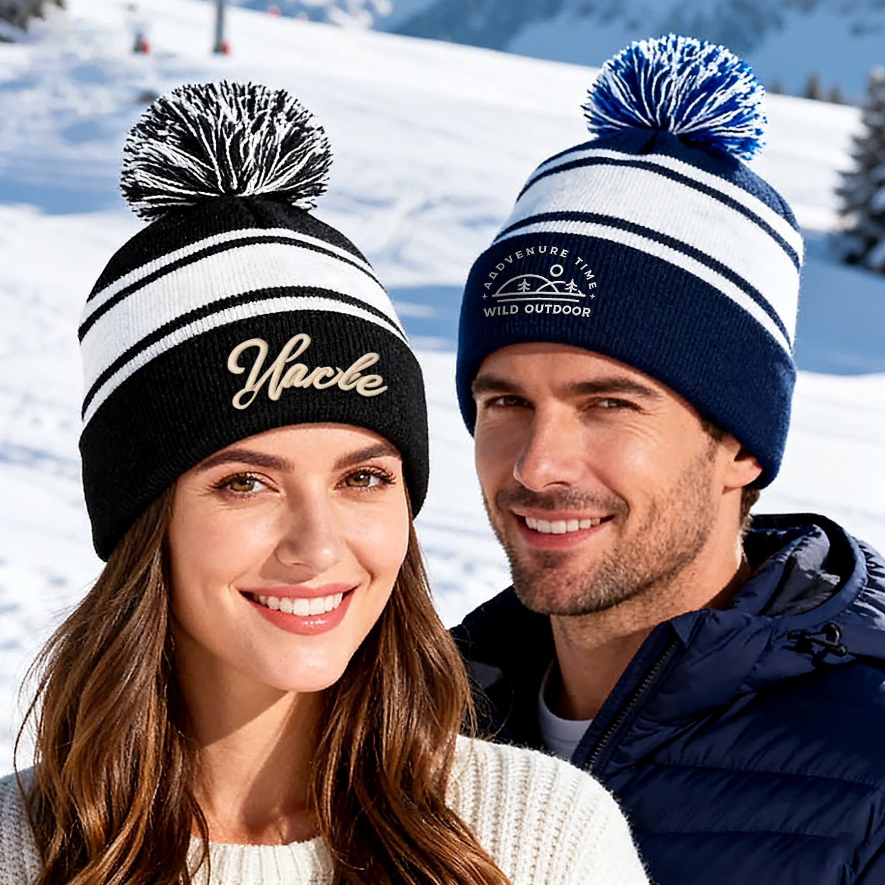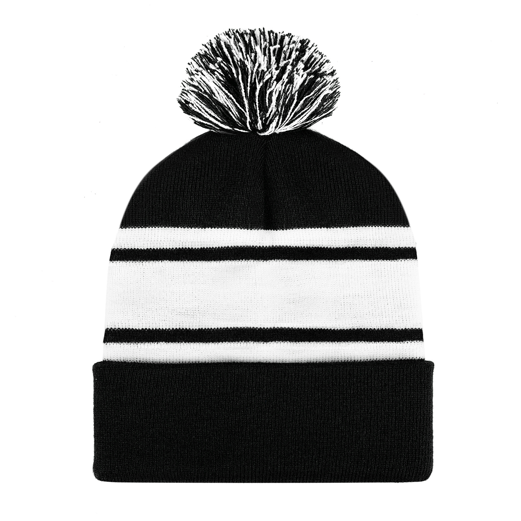 Item#  RC1029 –  These striped pom beanies are ideal for showcasing your brand stylishly year-round, from sports events to chilly weather. They not only attract attention but also serve practical purposes, enhancing visibility and boosting your marketing efforts. Customize them with your text, logo, or artwork in a prominent imprint area for maximum impact. Custom beanie colors are available. Get a free quote now!