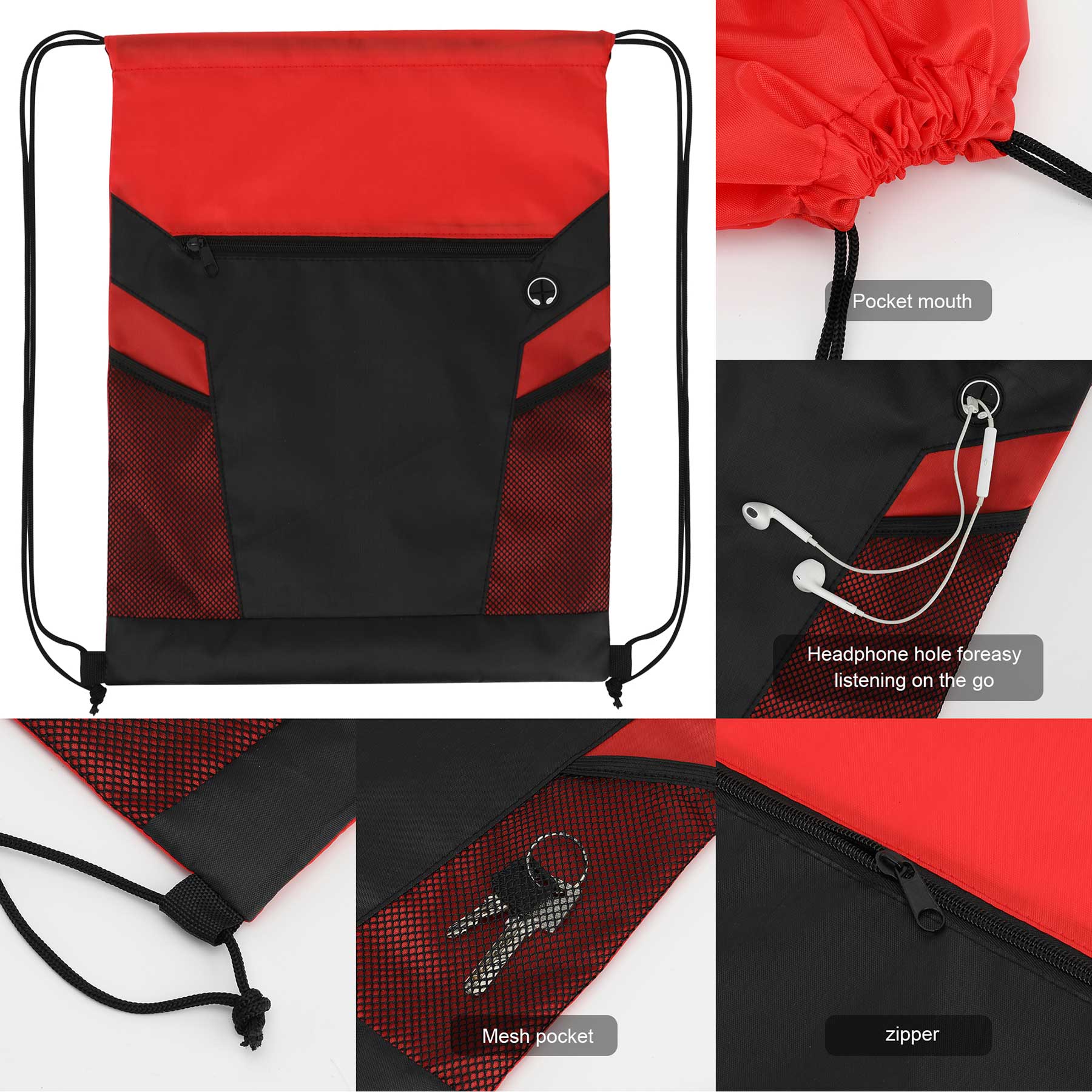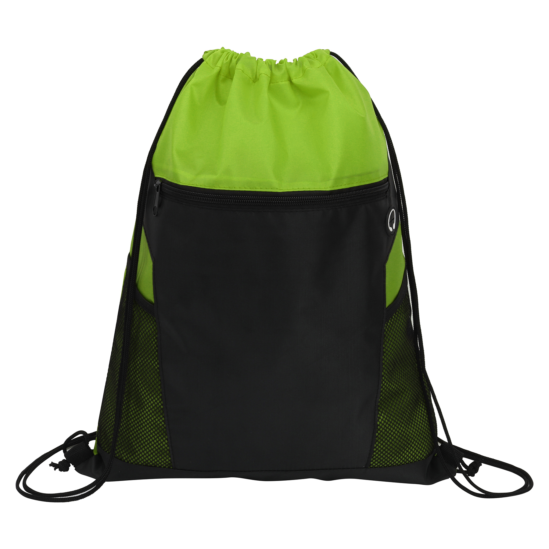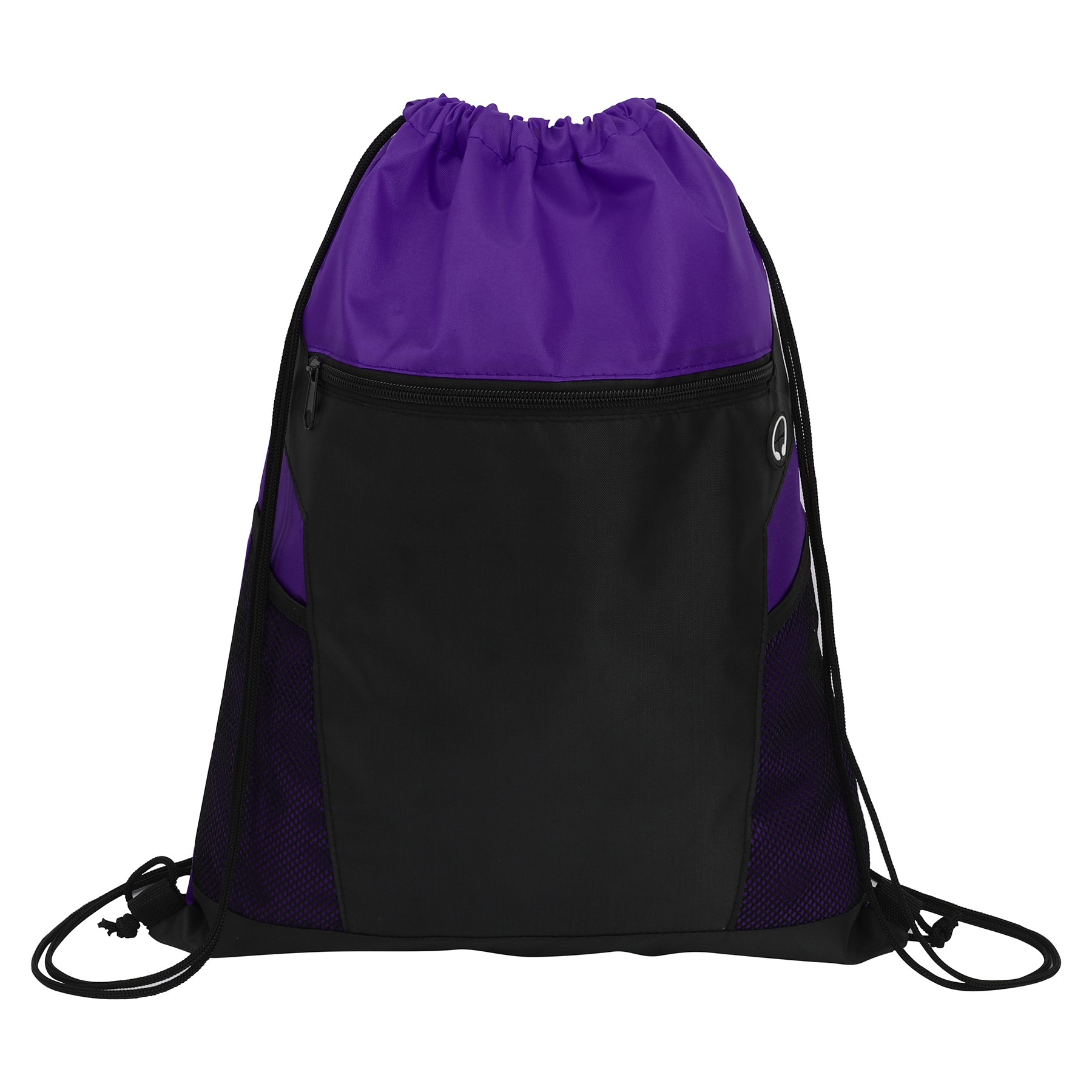 Item# RA1179 –  Crafted from robust 210D polyester, this lightweight drawstring backpack is versatile enough for daily use—ideal for school, workouts, or outdoor adventures. Its spacious main compartment accommodates clothes, shoes, books, and other large items with ease. A zippered pocket at the front provides quick access to smaller necessities such as keys, a phone, or a wallet. Additionally, two mesh side pockets securely hold water bottles, drinks, or umbrellas. An earbud port in the front pocket allows for hands-free music enjoyment while keeping your device secure. The drawstring straps ensure a tight closure and also serve as comfortable shoulder straps. Featuring a sleek two-tone design and available in various colors, this bag is both functional and fashionable—perfect for promotional events, sports teams, or daily use. Get a free quote now!